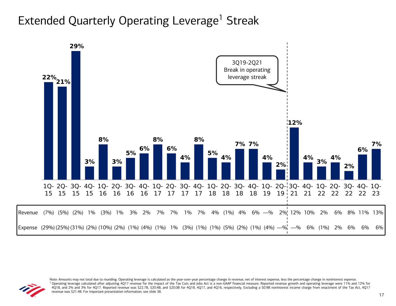 Added record ~14,500 net new relationships across Merrill and Private Bank $80 billion total net client flows since 1Q22 Opened record ~35,000 bank accounts, up 18% YoY Sent ~40,000 referrals to other lines of business Continued Organic Growth in 1Q23 16 Consumer Banking Global Wealth & Investment Management Global Banking Global Markets Added ~130,000 net new checking accounts; 17th consecutive quarter of growth Added 1.3 million credit card accounts1 Record 3.6 million consumer investment accounts, with $37 billion net client flows since 1Q22 Grew digital sales 4% YoY to 1.8 million; digital sales represented 51% of total sales Grew average loans and leases 6% YoY to $381 billion Second best revenue quarter at $6.2 billion, up 19% YoY $3.1 billion Global Transaction Services revenue, up 47% YoY #3 in investment banking fees2 Grew sales and trading revenue to $5.1 billion Second highest quarterly sales and trading revenue in a decade Highest quarterly FICC3 revenue in a decade, up 27% YoY Average loans of $125 billion, up 15% YoY 1 Includes credit cards across Consumer Banking, Small Business, and Global Wealth & Investment Management. 2 Source: Dealogic as of April 1, 2023. 3 FICC stands for Fixed Income, Currencies, and Commodities.