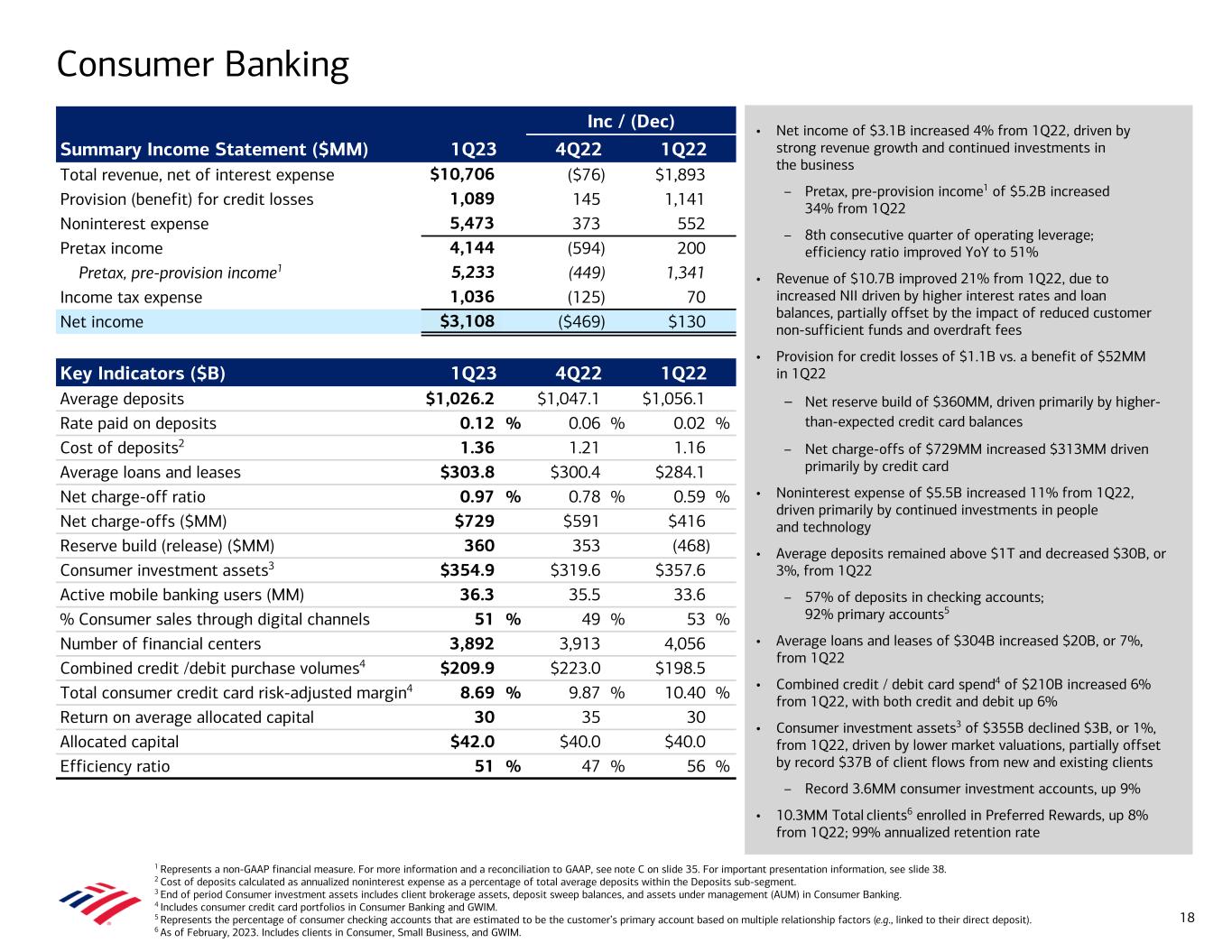 • Net income of $3.1B increased 4% from 1Q22, driven by strong revenue growth and continued investments in the business – Pretax, pre-provision income1 of $5.2B increased 34% from 1Q22 – 8th consecutive quarter of operating leverage; efficiency ratio improved YoY to 51% • Revenue of $10.7B improved 21% from 1Q22, due to increased NII driven by higher interest rates and loan balances, partially offset by the impact of reduced customer non-sufficient funds and overdraft fees • Provision for credit losses of $1.1B vs. a benefit of $52MM in 1Q22 – Net reserve build of $360MM, driven primarily by higher- than-expected credit card balances – Net charge-offs of $729MM increased $313MM driven primarily by credit card • Noninterest expense of $5.5B increased 11% from 1Q22, driven primarily by continued investments in people and technology • Average deposits remained above $1T and decreased $30B, or 3%, from 1Q22 – 57% of deposits in checking accounts; 92% primary accounts5 • Average loans and leases of $304B increased $20B, or 7%, from 1Q22 • Combined credit / debit card spend4 of $210B increased 6% from 1Q22, with both credit and debit up 6% • Consumer investment assets3 of $355B declined $3B, or 1%, from 1Q22, driven by lower market valuations, partially offset by record $37B of client flows from new and existing clients – Record 3.6MM consumer investment accounts, up 9% • 10.3MM Total clients6 enrolled in Preferred Rewards, up 8% from 1Q22; 99% annualized retention rate Consumer Banking 1 Represents a non-GAAP financial measure. For more information and a reconciliation to GAAP, see note C on slide 35. For important presentation information, see slide 38. 2 Cost of deposits calculated as annualized noninterest expense as a percentage of total average deposits within the Deposits sub-segment. 3 End of period Consumer investment assets includes client brokerage assets, deposit sweep balances, and assets under management (AUM) in Consumer Banking. 4 Includes consumer credit card portfolios in Consumer Banking and GWIM. 5 Represents the percentage of consumer checking accounts that are estimated to be the customer’s primary account based on multiple relationship factors (e.g., linked to their direct deposit). 6 As of February, 2023. Includes clients in Consumer, Small Business, and GWIM. Inc / (Dec) Summary Income Statement ($MM) 1Q23 4Q22 1Q22 Total revenue, net of interest expense $10,706 ($76) $1,893 Provision (benefit) for credit losses 1,089 145 1,141 Noninterest expense 5,473 373 552 Pretax income 4,144 (594) 200 Pretax, pre-provision income1 5,233 (449) 1,341 Income tax expense 1,036 (125) 70 Net income $3,108 ($469) $130 Key Indicators ($B) 1Q23 4Q22 1Q22 Average deposits $1,026.2 $1,047.1 $1,056.1 Rate paid on deposits 0.12 % 0.06 % 0.02 % Cost of deposits2 1.36 1.21 1.16 Average loans and leases $303.8 $300.4 $284.1 Net charge-off ratio 0.97 % 0.78 % 0.59 % Net charge-offs ($MM) $729 $591 $416 Reserve build (release) ($MM) 360 353 (468) Consumer investment assets3 $354.9 $319.6 $357.6 Active mobile banking users (MM) 36.3 35.5 33.6 % Consumer sales through digital channels 51 % 49 % 53 % Number of financial centers 3,892 3,913 4,056 Combined credit /debit purchase volumes4 $209.9 $223.0 $198.5 Total consumer credit card risk-adjusted margin4 8.69 % 9.87 % 10.40 % Return on average allocated capital 30 35 30 Allocated capital $42.0 $40.0 $40.0 Efficiency ratio 51 % 47 % 56 % 18