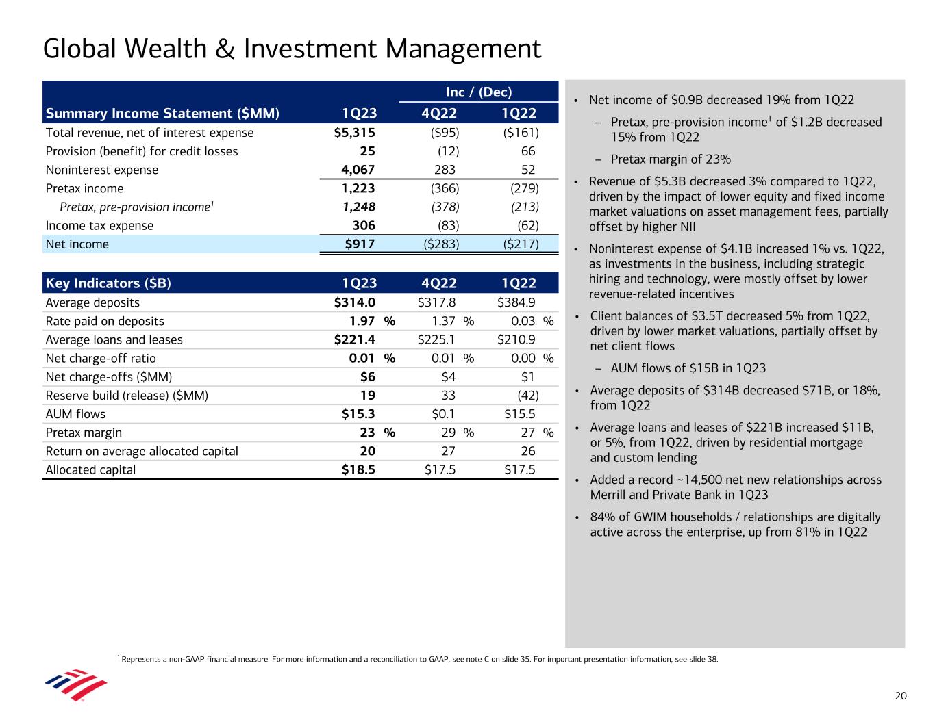 • Net income of $0.9B decreased 19% from 1Q22 – Pretax, pre-provision income1 of $1.2B decreased 15% from 1Q22 – Pretax margin of 23% • Revenue of $5.3B decreased 3% compared to 1Q22, driven by the impact of lower equity and fixed income market valuations on asset management fees, partially offset by higher NII • Noninterest expense of $4.1B increased 1% vs. 1Q22, as investments in the business, including strategic hiring and technology, were mostly offset by lower revenue-related incentives • Client balances of $3.5T decreased 5% from 1Q22, driven by lower market valuations, partially offset by net client flows – AUM flows of $15B in 1Q23 • Average deposits of $314B decreased $71B, or 18%, from 1Q22 • Average loans and leases of $221B increased $11B, or 5%, from 1Q22, driven by residential mortgage and custom lending • Added a record ~14,500 net new relationships across Merrill and Private Bank in 1Q23 • 84% of GWIM households / relationships are digitally active across the enterprise, up from 81% in 1Q22 Global Wealth & Investment Management 1 Represents a non-GAAP financial measure. For more information and a reconciliation to GAAP, see note C on slide 35. For important presentation information, see slide 38. Inc / (Dec) Summary Income Statement ($MM) 1Q23 4Q22 1Q22 Total revenue, net of interest expense $5,315 ($95) ($161) Provision (benefit) for credit losses 25 (12) 66 Noninterest expense 4,067 283 52 Pretax income 1,223 (366) (279) Pretax, pre-provision income1 1,248 (378) (213) Income tax expense 306 (83) (62) Net income $917 ($283) ($217) Key Indicators ($B) 1Q23 4Q22 1Q22 Average deposits $314.0 $317.8 $384.9 Rate paid on deposits 1.97 % 1.37 % 0.03 % Average loans and leases $221.4 $225.1 $210.9 Net charge-off ratio 0.01 % 0.01 % 0.00 % Net charge-offs ($MM) $6 $4 $1 Reserve build (release) ($MM) 19 33 (42) AUM flows $15.3 $0.1 $15.5 Pretax margin 23 % 29 % 27 % Return on average allocated capital 20 27 26 Allocated capital $18.5 $17.5 $17.5 20