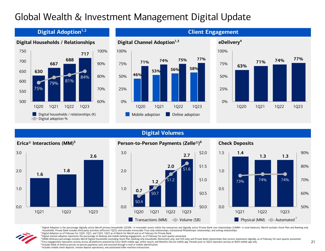 Erica® Interactions (MM)5 1.6 1.8 2.6 1Q21 1Q22 1Q23 0.0 1.0 2.0 3.0 Person-to-Person Payments (Zelle®)6 Check Deposits eDelivery4Digital Households / Relationships Digital Channel Adoption1,3 63% 71% 74% 77% 1Q20 1Q21 1Q22 1Q23 0% 25% 50% 75% 100% 46% 53% 56% 58% 71% 74% 75% 77% Mobile adoption Online adoption 1Q20 1Q21 1Q22 1Q23 0% 25% 50% 75% 100% 630 667 688 717 75% 79% 81% 84% Digital households / relationships (K) Digital adoption % 1Q20 1Q21 1Q22 1Q23 500 550 600 650 700 750 60% 70% 80% 90% 100% Client Engagement Digital Volumes Global Wealth & Investment Management Digital Update 1 Digital Adoption is the percentage digitally active Merrill primary households ($250K+ in investable assets within the enterprise) and digitally active Private Bank core relationships ($3MM+ in total balances). Merrill excludes Stock Plan and Banking only households. Private Bank includes third party activities (effective 1Q23), and excludes Irrevocable Trust-only relationships, Institutional Philanthropic relationships, and exiting relationships. 2 Digital Adoption as of February for 1Q20, 1Q21, and 1Q22. 1Q23 as of March for Merrill and as of February for Private Bank. 3 Digital channel adoption represents the percentage of desktop and mobile banking engagement, as of February for each quarter presented. 4 GWIM eDelivery percentage includes Merrill Digital Households (excluding Stock Plan, Banking only households, Retirement only, and 529 only) and Private Bank relationships that receive statements digitally, as of February for each quarter presented. 5 Erica engagement represents activity across all platforms powered by Erica: BofA mobile app, online search, and Benefits OnLine mobile app. Periods prior to 3Q22 represent activity on BofA mobile app only. 6 Includes Bank of America person-to-person payments sent and received through e-mail or mobile identification. 7 Includes mobile check deposits, remote deposit operations), and automated teller machine transactions. 21 Digital Adoption1,2 0.7 1.2 2.0 2.7 $0.4 $0.7 $1.2 $1.6 Transactions (MM) Volume ($B) 1Q20 1Q21 1Q22 1Q23 0.0 1.0 2.0 3.0 $0.0 $0.5 $1.0 $1.5 $2.0 1.4 1.3 1.3 73% 74% 74% Physical (MM) Automated 1Q21 1Q22 1Q23 0.0 0.5 1.0 1.5 50% 60% 70% 80% 90% 7