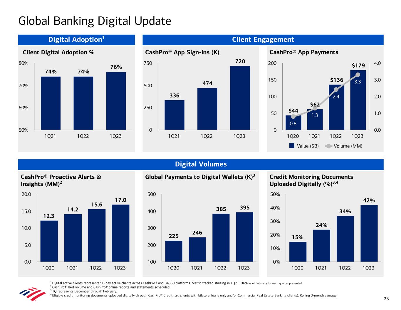 Credit Monitoring Documents Uploaded Digitally (%)3,4 CashPro® Proactive Alerts & Insights (MM)2 Global Payments to Digital Wallets (K)3 15% 24% 34% 42% 1Q20 1Q21 1Q22 1Q23 0% 10% 20% 30% 40% 50% 225 246 385 395 1Q20 1Q21 1Q22 1Q23 100 200 300 400 500 12.3 14.2 15.6 17.0 1Q20 1Q21 1Q22 1Q23 0.0 5.0 10.0 15.0 20.0 CashPro® App PaymentsClient Digital Adoption % CashPro® App Sign-ins (K) $44 $62 $136 $179 0.8 1.3 2.4 3.3 Value ($B) Volume (MM) 1Q20 1Q21 1Q22 1Q23 0 50 100 150 200 0.0 1.0 2.0 3.0 4.0 336 474 720 1Q21 1Q22 1Q23 0 250 500 750 74% 74% 76% 1Q21 1Q22 1Q23 50% 60% 70% 80% Client Engagement Digital Volumes Global Banking Digital Update 23 Digital Adoption1 1 Digital active clients represents 90-day active clients across CashPro® and BA360 platforms. Metric tracked starting in 1Q21. Data as of February for each quarter presented. 2 CashPro® alert volume and CashPro® online reports and statements scheduled. 3 1Q represents December through February. 4 Eligible credit monitoring documents uploaded digitally through CashPro® Credit (i.e., clients with bilateral loans only and/or Commercial Real Estate Banking clients). Rolling 3-month average.