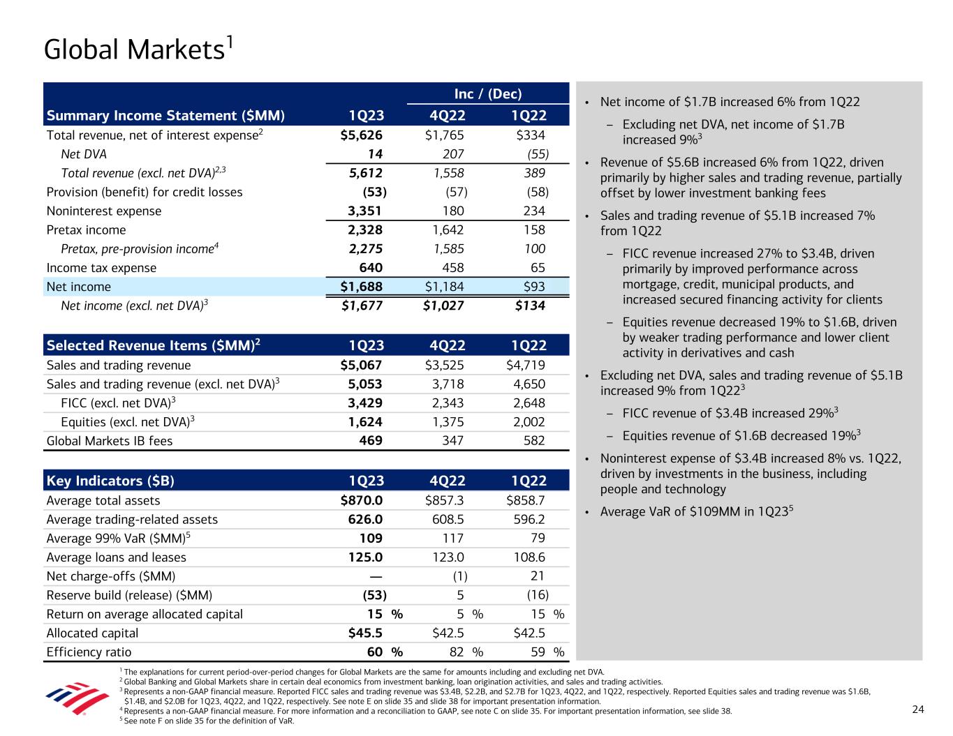 Global Markets1 • Net income of $1.7B increased 6% from 1Q22 – Excluding net DVA, net income of $1.7B increased 9%3 • Revenue of $5.6B increased 6% from 1Q22, driven primarily by higher sales and trading revenue, partially offset by lower investment banking fees • Sales and trading revenue of $5.1B increased 7% from 1Q22 – FICC revenue increased 27% to $3.4B, driven primarily by improved performance across mortgage, credit, municipal products, and increased secured financing activity for clients – Equities revenue decreased 19% to $1.6B, driven by weaker trading performance and lower client activity in derivatives and cash • Excluding net DVA, sales and trading revenue of $5.1B increased 9% from 1Q223 – FICC revenue of $3.4B increased 29%3 – Equities revenue of $1.6B decreased 19%3 • Noninterest expense of $3.4B increased 8% vs. 1Q22, driven by investments in the business, including people and technology • Average VaR of $109MM in 1Q235 1 The explanations for current period-over-period changes for Global Markets are the same for amounts including and excluding net DVA. 2 Global Banking and Global Markets share in certain deal economics from investment banking, loan origination activities, and sales and trading activities. 3 Represents a non-GAAP financial measure. Reported FICC sales and trading revenue was $3.4B, $2.2B, and $2.7B for 1Q23, 4Q22, and 1Q22, respectively. Reported Equities sales and trading revenue was $1.6B, $1.4B, and $2.0B for 1Q23, 4Q22, and 1Q22, respectively. See note E on slide 35 and slide 38 for important presentation information. 4 Represents a non-GAAP financial measure. For more information and a reconciliation to GAAP, see note C on slide 35. For important presentation information, see slide 38. 5 See note F on slide 35 for the definition of VaR. Inc / (Dec) Summary Income Statement ($MM) 1Q23 4Q22 1Q22 Total revenue, net of interest expense2 $5,626 $1,765 $334 Net DVA 14 207 (55) Total revenue (excl. net DVA)2,3 5,612 1,558 389 Provision (benefit) for credit losses (53) (57) (58) Noninterest expense 3,351 180 234 Pretax income 2,328 1,642 158 Pretax, pre-provision income4 2,275 1,585 100 Income tax expense 640 458 65 Net income $1,688 $1,184 $93 Net income (excl. net DVA)3 $1,677 $1,027 $134 Selected Revenue Items ($MM)2 1Q23 4Q22 1Q22 Sales and trading revenue $5,067 $3,525 $4,719 Sales and trading revenue (excl. net DVA)3 5,053 3,718 4,650 FICC (excl. net DVA)3 3,429 2,343 2,648 Equities (excl. net DVA)3 1,624 1,375 2,002 Global Markets IB fees 469 347 582 Key Indicators ($B) 1Q23 4Q22 1Q22 Average total assets $870.0 $857.3 $858.7 Average trading-related assets 626.0 608.5 596.2 Average 99% VaR ($MM)5 109 117 79 Average loans and leases 125.0 123.0 108.6 Net charge-offs ($MM) — (1) 21 Reserve build (release) ($MM) (53) 5 (16) Return on average allocated capital 15 % 5 % 15 % Allocated capital $45.5 $42.5 $42.5 Efficiency ratio 60 % 82 % 59 % 24