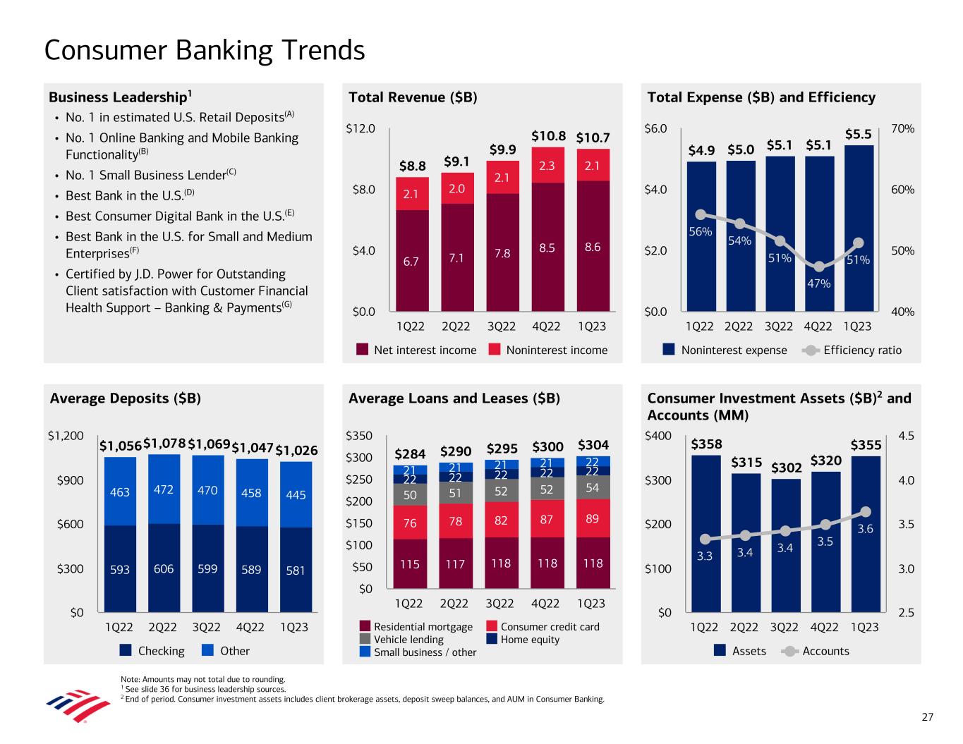 Total Expense ($B) and Efficiency Business Leadership1 • No. 1 in estimated U.S. Retail Deposits(A) • No. 1 Online Banking and Mobile Banking Functionality(B) • No. 1 Small Business Lender(C) • Best Bank in the U.S.(D) • Best Consumer Digital Bank in the U.S.(E) • Best Bank in the U.S. for Small and Medium Enterprises(F) • Certified by J.D. Power for Outstanding Client satisfaction with Customer Financial Health Support – Banking & Payments(G) Total Revenue ($B) Average Deposits ($B) Consumer Investment Assets ($B)2 and Accounts (MM) Average Loans and Leases ($B) Consumer Banking Trends Note: Amounts may not total due to rounding. 1 See slide 36 for business leadership sources. 2 End of period. Consumer investment assets includes client brokerage assets, deposit sweep balances, and AUM in Consumer Banking. $8.8 $9.1 $9.9 $10.8 $10.7 6.7 7.1 7.8 8.5 8.6 2.1 2.0 2.1 2.3 2.1 Net interest income Noninterest income 1Q22 2Q22 3Q22 4Q22 1Q23 $0.0 $4.0 $8.0 $12.0 $4.9 $5.0 $5.1 $5.1 $5.5 56% 54% 51% 47% 51% Noninterest expense Efficiency ratio 1Q22 2Q22 3Q22 4Q22 1Q23 $0.0 $2.0 $4.0 $6.0 40% 50% 60% 70% $1,056$1,078$1,069$1,047$1,026 593 606 599 589 581 463 472 470 458 445 Checking Other 1Q22 2Q22 3Q22 4Q22 1Q23 $0 $300 $600 $900 $1,200 $284 $290 $295 $300 $304 115 117 118 118 118 76 78 82 87 89 50 51 52 52 54 22 22 22 22 2221 21 21 21 22 Residential mortgage Consumer credit card Vehicle lending Home equity Small business / other 1Q22 2Q22 3Q22 4Q22 1Q23 $0 $50 $100 $150 $200 $250 $300 $350 27 $358 $315 $302 $320 $355 3.3 3.4 3.4 3.5 3.6 Assets Accounts 1Q22 2Q22 3Q22 4Q22 1Q23 $0 $100 $200 $300 $400 2.5 3.0 3.5 4.0 4.5