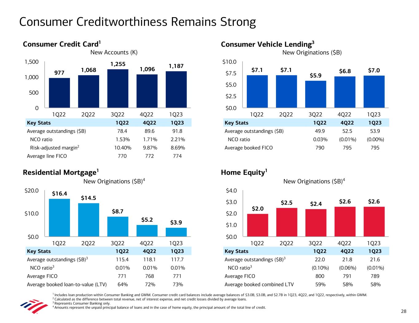 977 1,068 1,255 1,096 1,187 1Q22 2Q22 3Q22 4Q22 1Q23 0 500 1,000 1,500 Home Equity1 New Originations ($B)4 Consumer Creditworthiness Remains Strong 1 Includes loan production within Consumer Banking and GWIM. Consumer credit card balances include average balances of $3.0B, $3.0B, and $2.7B in 1Q23, 4Q22, and 1Q22, respectively, within GWIM. 2 Calculated as the difference between total revenue, net of interest expense, and net credit losses divided by average loans. 3 Represents Consumer Banking only. 4 Amounts represent the unpaid principal balance of loans and in the case of home equity, the principal amount of the total line of credit. Consumer Vehicle Lending3 New Originations ($B) Consumer Credit Card1 New Accounts (K) 28 Residential Mortgage1 New Originations ($B)4 Key Stats 1Q22 4Q22 1Q23 Average outstandings ($B) 78.4 89.6 91.8 NCO ratio 1.53% 1.71% 2.21% Risk-adjusted margin2 10.40% 9.87% 8.69% Average line FICO 770 772 774 $7.1 $7.1 $5.9 $6.8 $7.0 1Q22 2Q22 3Q22 4Q22 1Q23 $0.0 $2.5 $5.0 $7.5 $10.0 Key Stats 1Q22 4Q22 1Q23 Average outstandings ($B) 49.9 52.5 53.9 NCO ratio 0.03% (0.01%) (0.00%) Average booked FICO 790 795 795 $16.4 $14.5 $8.7 $5.2 $3.9 1Q22 2Q22 3Q22 4Q22 1Q23 $0.0 $10.0 $20.0 Key Stats 1Q22 4Q22 1Q23 Average outstandings ($B)3 115.4 118.1 117.7 NCO ratio3 0.01% 0.01% 0.01% Average FICO 771 768 771 Average booked loan-to-value (LTV) 64% 72% 73% $2.0 $2.5 $2.4 $2.6 $2.6 1Q22 2Q22 3Q22 4Q22 1Q23 $0.0 $1.0 $2.0 $3.0 $4.0 Key Stats 1Q22 4Q22 1Q23 Average outstandings ($B)3 22.0 21.8 21.6 NCO ratio3 (0.10%) (0.06%) (0.01%) Average FICO 800 791 789 Average booked combined LTV 59% 58% 58%