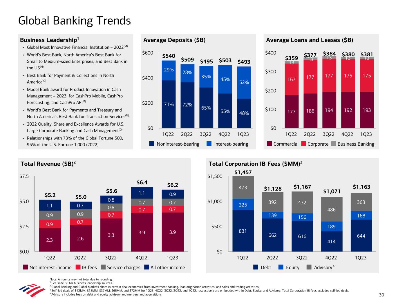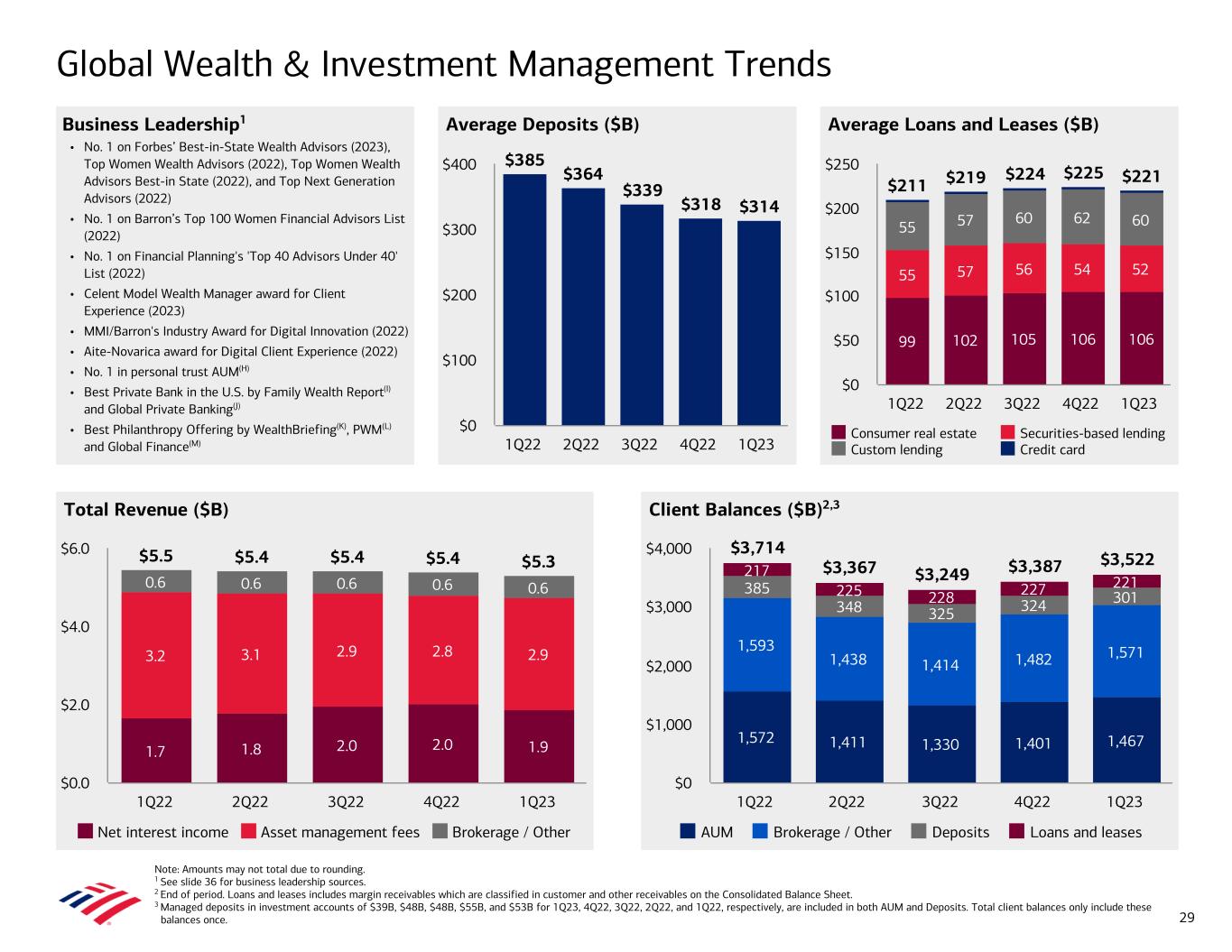 Average Deposits ($B) Global Wealth & Investment Management Trends Business Leadership1 • No. 1 on Forbes’ Best-in-State Wealth Advisors (2023), Top Women Wealth Advisors (2022), Top Women Wealth Advisors Best-in State (2022), and Top Next Generation Advisors (2022) • No. 1 on Barron’s Top 100 Women Financial Advisors List (2022) • No. 1 on Financial Planning's 'Top 40 Advisors Under 40' List (2022) • Celent Model Wealth Manager award for Client Experience (2023) • MMI/Barron's Industry Award for Digital Innovation (2022) • Aite-Novarica award for Digital Client Experience (2022) • No. 1 in personal trust AUM(H) • Best Private Bank in the U.S. by Family Wealth Report(I) and Global Private Banking(J) • Best Philanthropy Offering by WealthBriefing(K), PWM(L) and Global Finance(M) Note: Amounts may not total due to rounding. 1 See slide 36 for business leadership sources. 2 End of period. Loans and leases includes margin receivables which are classified in customer and other receivables on the Consolidated Balance Sheet. 3 Managed deposits in investment accounts of $39B, $48B, $48B, $55B, and $53B for 1Q23, 4Q22, 3Q22, 2Q22, and 1Q22, respectively, are included in both AUM and Deposits. Total client balances only include these balances once. Average Loans and Leases ($B) Total Revenue ($B) Client Balances ($B)2,3 $5.5 $5.4 $5.4 $5.4 $5.3 1.7 1.8 2.0 2.0 1.9 3.2 3.1 2.9 2.8 2.9 0.6 0.6 0.6 0.6 0.6 Net interest income Asset management fees Brokerage / Other 1Q22 2Q22 3Q22 4Q22 1Q23 $0.0 $2.0 $4.0 $6.0 1,572 1,411 1,330 1,401 1,467 1,593 1,438 1,414 1,482 1,571 385 348 325 324 301 217 225 228 227 221 $3,714 $3,367 $3,249 $3,387 $3,522 AUM Brokerage / Other Deposits Loans and leases 1Q22 2Q22 3Q22 4Q22 1Q23 $0 $1,000 $2,000 $3,000 $4,000 $211 $219 $224 $225 $221 99 102 105 106 106 55 57 56 54 52 55 57 60 62 60 Consumer real estate Securities-based lending Custom lending Credit card 1Q22 2Q22 3Q22 4Q22 1Q23 $0 $50 $100 $150 $200 $250$385 $364 $339 $318 $314 1Q22 2Q22 3Q22 4Q22 1Q23 $0 $100 $200 $300 $400 29