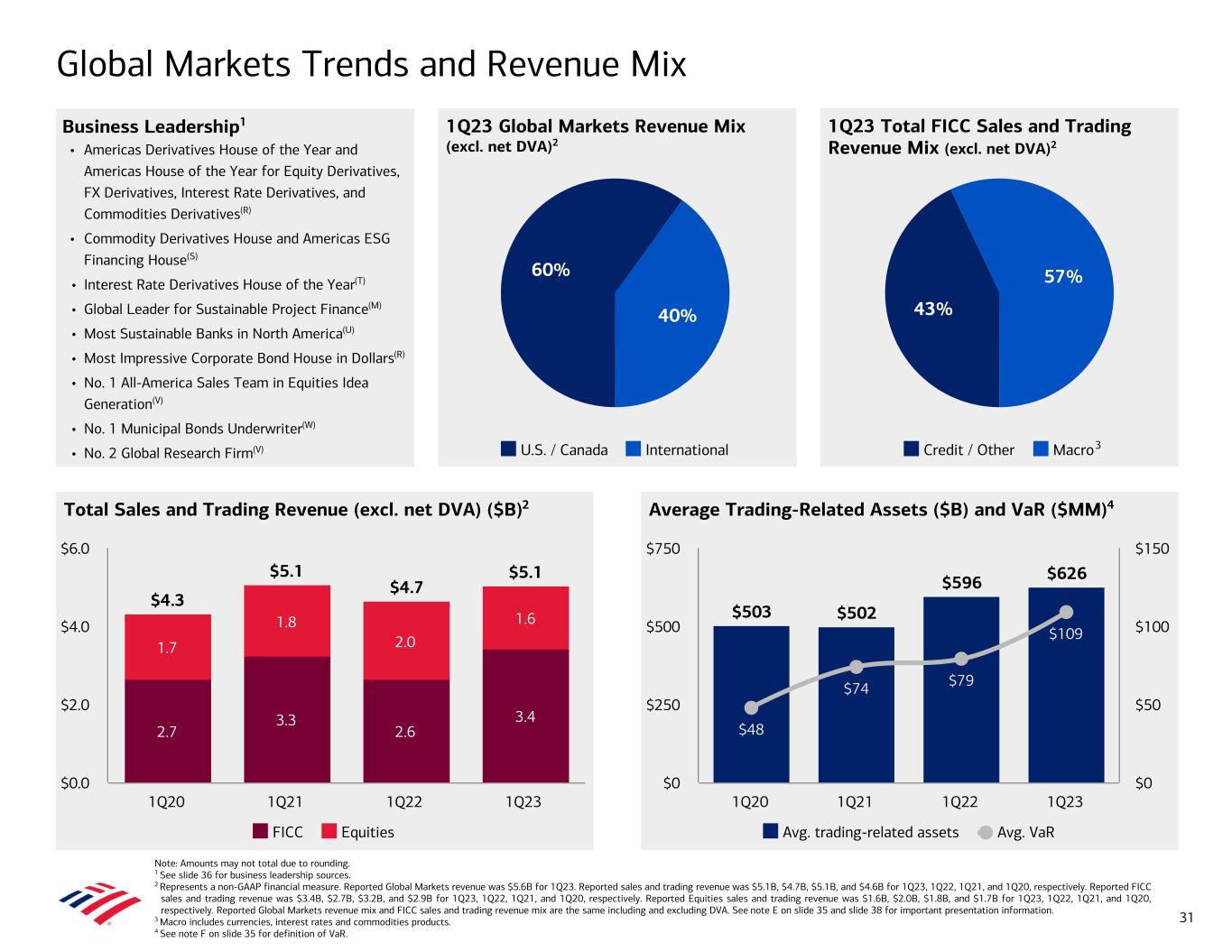 Global Banking Trends Note: Amounts may not total due to rounding. 1 See slide 36 for business leadership sources. 2 Global Banking and Global Markets share in certain deal economics from investment banking, loan origination activities, and sales and trading activities. 3 Self-led deals of $12MM, $18MM, $37MM, $65MM, and $72MM for 1Q23, 4Q22, 3Q22, 2Q22, and 1Q22, respectively are embedded within Debt, Equity, and Advisory. Total Corporation IB fees excludes self-led deals. 4 Advisory includes fees on debt and equity advisory and mergers and acquisitions. Average Deposits ($B)Business Leadership1 • Global Most Innovative Financial Institution – 2022(M) • World's Best Bank, North America’s Best Bank for Small to Medium-sized Enterprises, and Best Bank in the US(N) • Best Bank for Payment & Collections in North America(O) • Model Bank award for Product Innovation in Cash Management – 2023, for CashPro Mobile, CashPro Forecasting, and CashPro API(P) • World’s Best Bank for Payments and Treasury and North America’s Best Bank for Transaction Services(N) • 2022 Quality, Share and Excellence Awards for U.S. Large Corporate Banking and Cash Management(Q) • Relationships with 73% of the Global Fortune 500; 95% of the U.S. Fortune 1,000 (2022) Average Loans and Leases ($B) Total Revenue ($B)2 Total Corporation IB Fees ($MM)3 $5.2 $5.0 $5.6 $6.4 $6.2 2.3 2.6 3.3 3.9 3.9 0.9 0.7 0.7 0.7 0.7 0.9 0.9 0.8 0.7 0.7 1.1 0.7 0.8 1.1 0.9 Net interest income IB fees Service charges All other income 1Q22 2Q22 3Q22 4Q22 1Q23 $0.0 $2.5 $5.0 $7.5 831 662 616 414 644 225 139 156 189 168 473 392 432 486 363 $1,457 $1,128 $1,167 $1,071 $1,163 Debt Equity Advisory 1Q22 2Q22 3Q22 4Q22 1Q23 $0 $500 $1,000 $1,500 177 186 194 192 193 167 177 177 175 175 13 13 13 13 13$359 $377 $384 $380 $381 Commercial Corporate Business Banking 1Q22 2Q22 3Q22 4Q22 1Q23 $0 $100 $200 $300 $400 4 $540 $509 $495 $503 $493 Noninterest-bearing Interest-bearing 1Q22 2Q22 3Q22 4Q22 1Q23 $0 $200 $400 $600 30 71% 72% 65% 55% 48% 29% 28% 35% 45% 52%