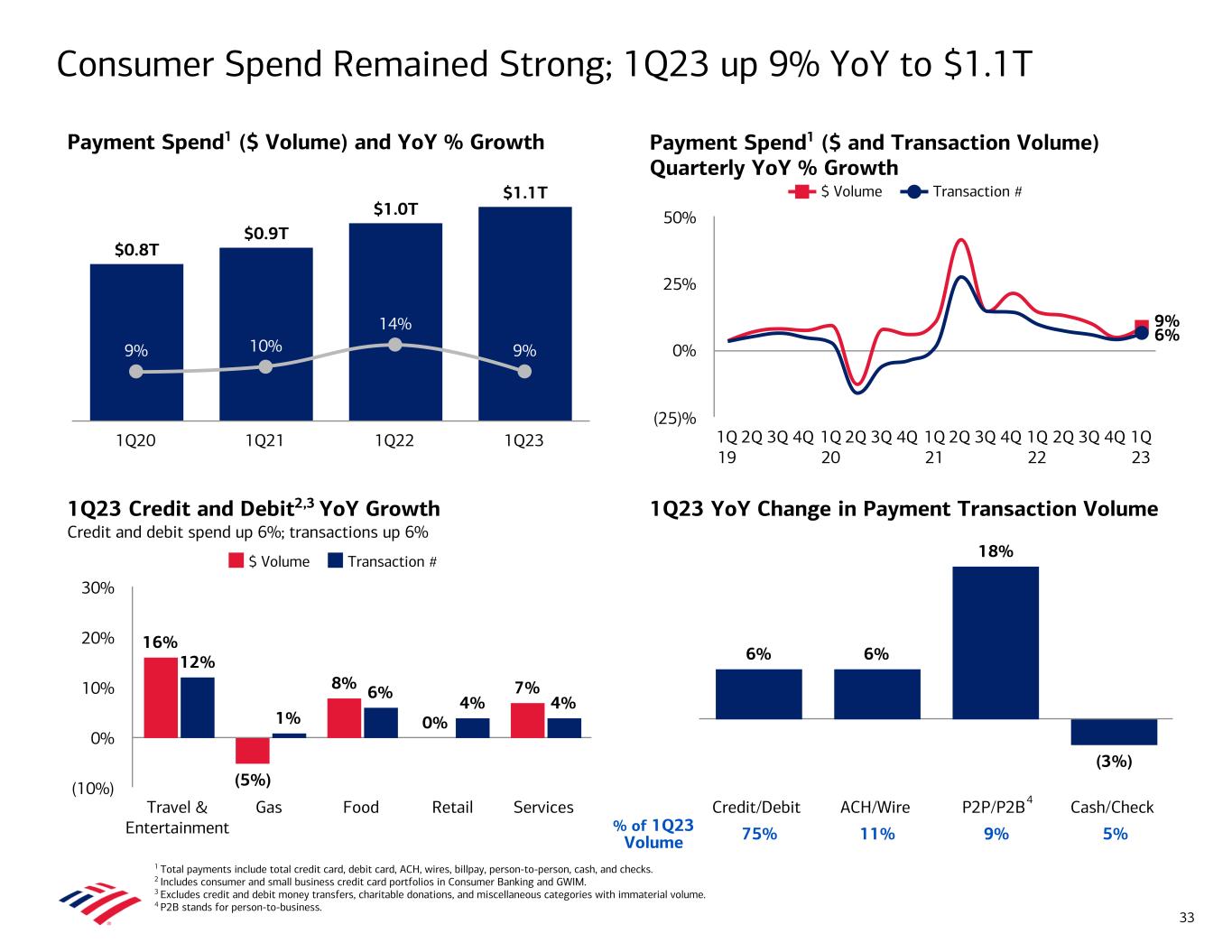 Consumer Spend Remained Strong; 1Q23 up 9% YoY to $1.1T 1 Total payments include total credit card, debit card, ACH, wires, billpay, person-to-person, cash, and checks. 2 Includes consumer and small business credit card portfolios in Consumer Banking and GWIM. 3 Excludes credit and debit money transfers, charitable donations, and miscellaneous categories with immaterial volume. 4 P2B stands for person-to-business. Payment Spend1 ($ and Transaction Volume) Quarterly YoY % Growth 33 1Q23 Credit and Debit2,3 YoY Growth Credit and debit spend up 6%; transactions up 6% $ Volume Transaction # 1Q 19 2Q 3Q 4Q 1Q 20 2Q 3Q 4Q 1Q 21 2Q 3Q 4Q 1Q 22 2Q 3Q 4Q 1Q 23 (25)% 0% 25% 50% 16% (5%) 8% 0% 7% 12% 1% 6% 4% 4% $ Volume Transaction # Travel & Entertainment Gas Food Retail Services (10%) 0% 10% 20% 30% Payment Spend1 ($ Volume) and YoY % Growth $0.8T $0.9T $1.0T $1.1T 9% 10% 14% 9% 1Q20 1Q21 1Q22 1Q23 9% 6% 1Q23 YoY Change in Payment Transaction Volume 6% 6% 18% (3%) Credit/Debit ACH/Wire P2P/P2B Cash/Check % of 1Q23 Volume 75% 11% 9% 5% 4