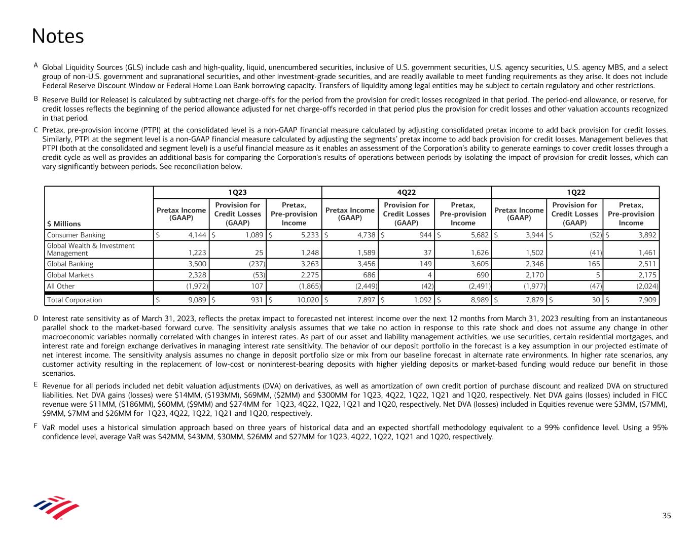 A Global Liquidity Sources (GLS) include cash and high-quality, liquid, unencumbered securities, inclusive of U.S. government securities, U.S. agency securities, U.S. agency MBS, and a select group of non-U.S. government and supranational securities, and other investment-grade securities, and are readily available to meet funding requirements as they arise. It does not include Federal Reserve Discount Window or Federal Home Loan Bank borrowing capacity. Transfers of liquidity among legal entities may be subject to certain regulatory and other restrictions. B Reserve Build (or Release) is calculated by subtracting net charge-offs for the period from the provision for credit losses recognized in that period. The period-end allowance, or reserve, for credit losses reflects the beginning of the period allowance adjusted for net charge-offs recorded in that period plus the provision for credit losses and other valuation accounts recognized in that period. C Pretax, pre-provision income (PTPI) at the consolidated level is a non-GAAP financial measure calculated by adjusting consolidated pretax income to add back provision for credit losses. Similarly, PTPI at the segment level is a non-GAAP financial measure calculated by adjusting the segments’ pretax income to add back provision for credit losses. Management believes that PTPI (both at the consolidated and segment level) is a useful financial measure as it enables an assessment of the Corporation’s ability to generate earnings to cover credit losses through a credit cycle as well as provides an additional basis for comparing the Corporation's results of operations between periods by isolating the impact of provision for credit losses, which can vary significantly between periods. See reconciliation below. D Interest rate sensitivity as of March 31, 2023, reflects the pretax impact to forecasted net interest income over the next 12 months from March 31, 2023 resulting from an instantaneous parallel shock to the market-based forward curve. The sensitivity analysis assumes that we take no action in response to this rate shock and does not assume any change in other macroeconomic variables normally correlated with changes in interest rates. As part of our asset and liability management activities, we use securities, certain residential mortgages, and interest rate and foreign exchange derivatives in managing interest rate sensitivity. The behavior of our deposit portfolio in the forecast is a key assumption in our projected estimate of net interest income. The sensitivity analysis assumes no change in deposit portfolio size or mix from our baseline forecast in alternate rate environments. In higher rate scenarios, any customer activity resulting in the replacement of low-cost or noninterest-bearing deposits with higher yielding deposits or market-based funding would reduce our benefit in those scenarios. E Revenue for all periods included net debit valuation adjustments (DVA) on derivatives, as well as amortization of own credit portion of purchase discount and realized DVA on structured liabilities. Net DVA gains (losses) were $14MM, ($193MM), $69MM, ($2MM) and $300MM for 1Q23, 4Q22, 1Q22, 1Q21 and 1Q20, respectively. Net DVA gains (losses) included in FICC revenue were $11MM, ($186MM), $60MM, ($9MM) and $274MM for 1Q23, 4Q22, 1Q22, 1Q21 and 1Q20, respectively. Net DVA (losses) included in Equities revenue were $3MM, ($7MM), $9MM, $7MM and $26MM for 1Q23, 4Q22, 1Q22, 1Q21 and 1Q20, respectively. F VaR model uses a historical simulation approach based on three years of historical data and an expected shortfall methodology equivalent to a 99% confidence level. Using a 95% confidence level, average VaR was $42MM, $43MM, $30MM, $26MM and $27MM for 1Q23, 4Q22, 1Q22, 1Q21 and 1Q20, respectively. Notes $ Millions 1Q23 4Q22 1Q22 Pretax Income (GAAP) Provision for Credit Losses (GAAP) Pretax, Pre-provision Income Pretax Income (GAAP) Provision for Credit Losses (GAAP) Pretax, Pre-provision Income Pretax Income (GAAP) Provision for Credit Losses (GAAP) Pretax, Pre-provision Income Consumer Banking $ 4,144 $ 1,089 $ 5,233 $ 4,738 $ 944 $ 5,682 $ 3,944 $ (52) $ 3,892 Global Wealth & Investment Management 1,223 25 1,248 1,589 37 1,626 1,502 (41) 1,461 Global Banking 3,500 (237) 3,263 3,456 149 3,605 2,346 165 2,511 Global Markets 2,328 (53) 2,275 686 4 690 2,170 5 2,175 All Other (1,972) 107 (1,865) (2,449) (42) (2,491) (1,977) (47) (2,024) Total Corporation $ 9,089 $ 931 $ 10,020 $ 7,897 $ 1,092 $ 8,989 $ 7,879 $ 30 $ 7,909 35
