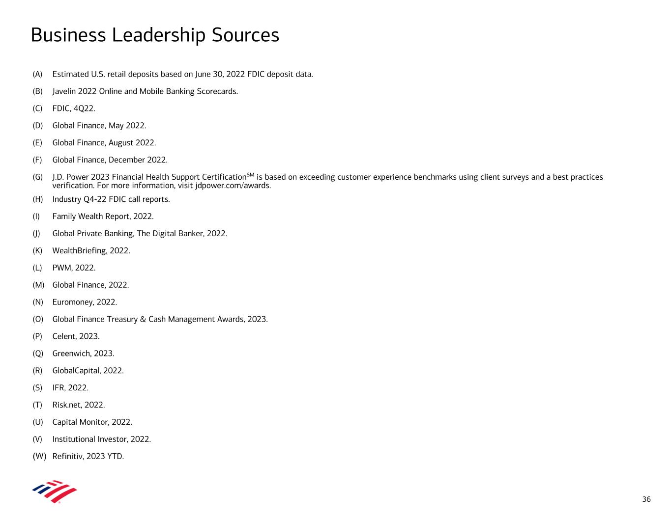 Business Leadership Sources (A) Estimated U.S. retail deposits based on June 30, 2022 FDIC deposit data. (B) Javelin 2022 Online and Mobile Banking Scorecards. (C) FDIC, 4Q22. (D) Global Finance, May 2022. (E) Global Finance, August 2022. (F) Global Finance, December 2022. (G) J.D. Power 2023 Financial Health Support CertificationSM is based on exceeding customer experience benchmarks using client surveys and a best practices verification. For more information, visit jdpower.com/awards. (H) Industry Q4-22 FDIC call reports. (I) Family Wealth Report, 2022. (J) Global Private Banking, The Digital Banker, 2022. (K) WealthBriefing, 2022. (L) PWM, 2022. (M) Global Finance, 2022. (N) Euromoney, 2022. (O) Global Finance Treasury & Cash Management Awards, 2023. (P) Celent, 2023. (Q) Greenwich, 2023. (R) GlobalCapital, 2022. (S) IFR, 2022. (T) Risk.net, 2022. (U) Capital Monitor, 2022. (V) Institutional Investor, 2022. (W) Refinitiv, 2023 YTD. 36