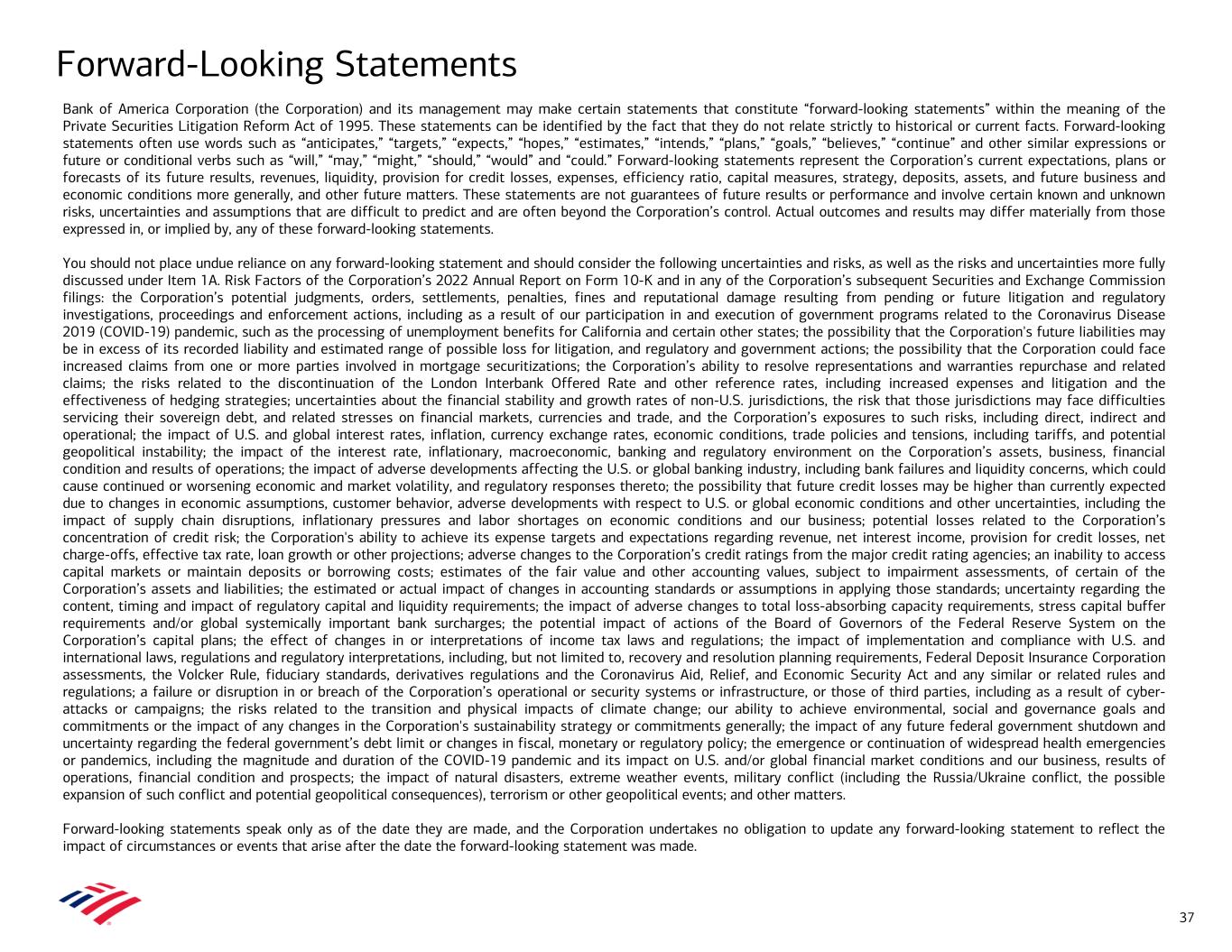 Forward-Looking Statements Bank of America Corporation (the Corporation) and its management may make certain statements that constitute “forward-looking statements” within the meaning of the Private Securities Litigation Reform Act of 1995. These statements can be identified by the fact that they do not relate strictly to historical or current facts. Forward-looking statements often use words such as “anticipates,” “targets,” “expects,” “hopes,” “estimates,” “intends,” “plans,” “goals,” “believes,” “continue” and other similar expressions or future or conditional verbs such as “will,” “may,” “might,” “should,” “would” and “could.” Forward-looking statements represent the Corporation’s current expectations, plans or forecasts of its future results, revenues, liquidity, provision for credit losses, expenses, efficiency ratio, capital measures, strategy, deposits, assets, and future business and economic conditions more generally, and other future matters. These statements are not guarantees of future results or performance and involve certain known and unknown risks, uncertainties and assumptions that are difficult to predict and are often beyond the Corporation’s control. Actual outcomes and results may differ materially from those expressed in, or implied by, any of these forward-looking statements. You should not place undue reliance on any forward-looking statement and should consider the following uncertainties and risks, as well as the risks and uncertainties more fully discussed under Item 1A. Risk Factors of the Corporation’s 2022 Annual Report on Form 10-K and in any of the Corporation’s subsequent Securities and Exchange Commission filings: the Corporation’s potential judgments, orders, settlements, penalties, fines and reputational damage resulting from pending or future litigation and regulatory investigations, proceedings and enforcement actions, including as a result of our participation in and execution of government programs related to the Coronavirus Disease 2019 (COVID-19) pandemic, such as the processing of unemployment benefits for California and certain other states; the possibility that the Corporation's future liabilities may be in excess of its recorded liability and estimated range of possible loss for litigation, and regulatory and government actions; the possibility that the Corporation could face increased claims from one or more parties involved in mortgage securitizations; the Corporation’s ability to resolve representations and warranties repurchase and related claims; the risks related to the discontinuation of the London Interbank Offered Rate and other reference rates, including increased expenses and litigation and the effectiveness of hedging strategies; uncertainties about the financial stability and growth rates of non-U.S. jurisdictions, the risk that those jurisdictions may face difficulties servicing their sovereign debt, and related stresses on financial markets, currencies and trade, and the Corporation’s exposures to such risks, including direct, indirect and operational; the impact of U.S. and global interest rates, inflation, currency exchange rates, economic conditions, trade policies and tensions, including tariffs, and potential geopolitical instability; the impact of the interest rate, inflationary, macroeconomic, banking and regulatory environment on the Corporation’s assets, business, financial condition and results of operations; the impact of adverse developments affecting the U.S. or global banking industry, including bank failures and liquidity concerns, which could cause continued or worsening economic and market volatility, and regulatory responses thereto; the possibility that future credit losses may be higher than currently expected due to changes in economic assumptions, customer behavior, adverse developments with respect to U.S. or global economic conditions and other uncertainties, including the impact of supply chain disruptions, inflationary pressures and labor shortages on economic conditions and our business; potential losses related to the Corporation’s concentration of credit risk; the Corporation's ability to achieve its expense targets and expectations regarding revenue, net interest income, provision for credit losses, net charge-offs, effective tax rate, loan growth or other projections; adverse changes to the Corporation’s credit ratings from the major credit rating agencies; an inability to access capital markets or maintain deposits or borrowing costs; estimates of the fair value and other accounting values, subject to impairment assessments, of certain of the Corporation’s assets and liabilities; the estimated or actual impact of changes in accounting standards or assumptions in applying those standards; uncertainty regarding the content, timing and impact of regulatory capital and liquidity requirements; the impact of adverse changes to total loss-absorbing capacity requirements, stress capital buffer requirements and/or global systemically important bank surcharges; the potential impact of actions of the Board of Governors of the Federal Reserve System on the Corporation’s capital plans; the effect of changes in or interpretations of income tax laws and regulations; the impact of implementation and compliance with U.S. and international laws, regulations and regulatory interpretations, including, but not limited to, recovery and resolution planning requirements, Federal Deposit Insurance Corporation assessments, the Volcker Rule, fiduciary standards, derivatives regulations and the Coronavirus Aid, Relief, and Economic Security Act and any similar or related rules and regulations; a failure or disruption in or breach of the Corporation’s operational or security systems or infrastructure, or those of third parties, including as a result of cyber- attacks or campaigns; the risks related to the transition and physical im