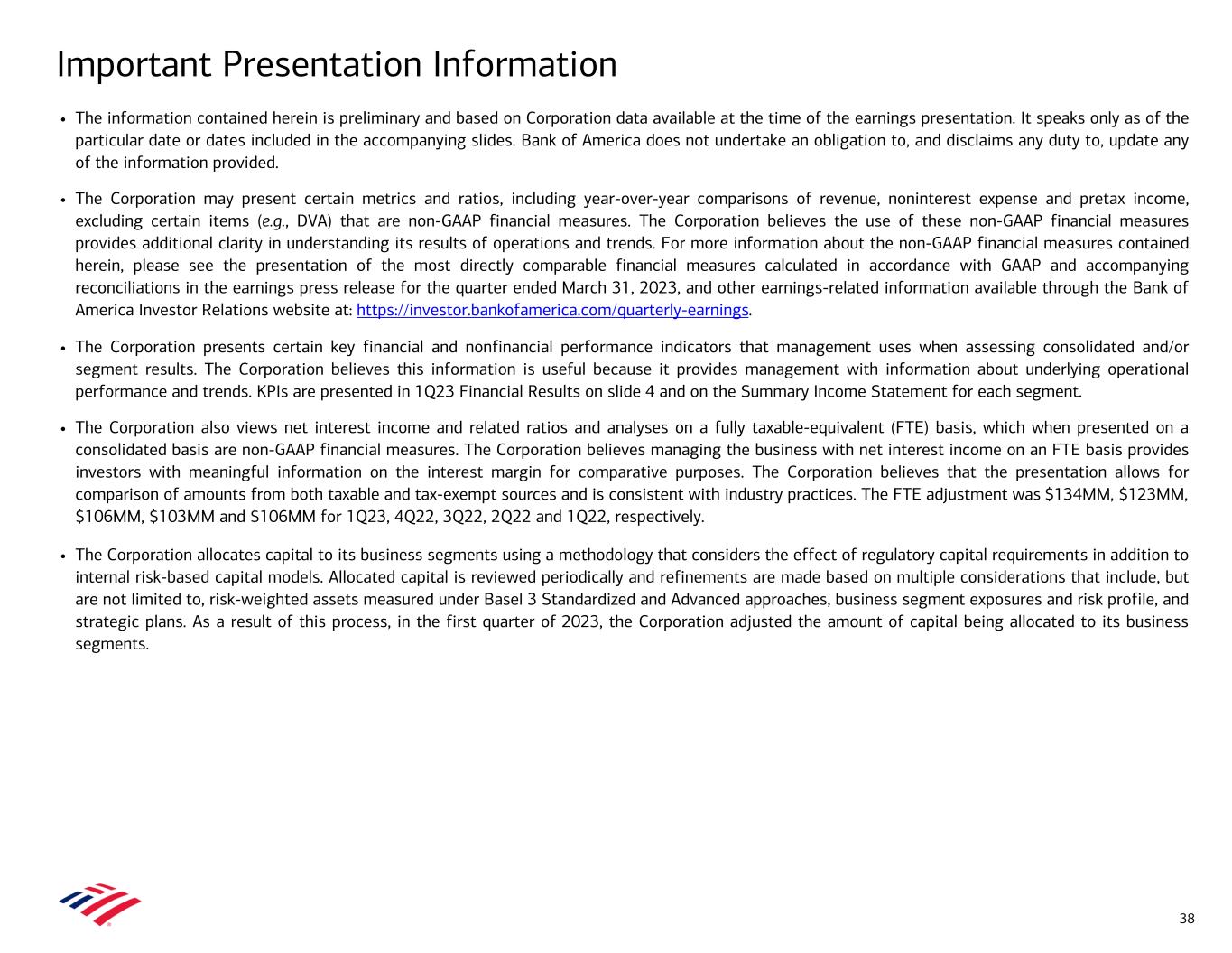 Important Presentation Information 38 • The information contained herein is preliminary and based on Corporation data available at the time of the earnings presentation. It speaks only as of the particular date or dates included in the accompanying slides. Bank of America does not undertake an obligation to, and disclaims any duty to, update any of the information provided. • The Corporation may present certain metrics and ratios, including year-over-year comparisons of revenue, noninterest expense and pretax income, excluding certain items (e.g., DVA) that are non-GAAP financial measures. The Corporation believes the use of these non-GAAP financial measures provides additional clarity in understanding its results of operations and trends. For more information about the non-GAAP financial measures contained herein, please see the presentation of the most directly comparable financial measures calculated in accordance with GAAP and accompanying reconciliations in the earnings press release for the quarter ended March 31, 2023, and other earnings-related information available through the Bank of America Investor Relations website at: https://investor.bankofamerica.com/quarterly-earnings. • The Corporation presents certain key financial and nonfinancial performance indicators that management uses when assessing consolidated and/or segment results. The Corporation believes this information is useful because it provides management with information about underlying operational performance and trends. KPIs are presented in 1Q23 Financial Results on slide 4 and on the Summary Income Statement for each segment. • The Corporation also views net interest income and related ratios and analyses on a fully taxable-equivalent (FTE) basis, which when presented on a consolidated basis are non-GAAP financial measures. The Corporation believes managing the business with net interest income on an FTE basis provides investors with meaningful information on the interest margin for comparative purposes. The Corporation believes that the presentation allows for comparison of amounts from both taxable and tax-exempt sources and is consistent with industry practices. The FTE adjustment was $134MM, $123MM, $106MM, $103MM and $106MM for 1Q23, 4Q22, 3Q22, 2Q22 and 1Q22, respectively. • The Corporation allocates capital to its business segments using a methodology that considers the effect of regulatory capital requirements in addition to internal risk-based capital models. Allocated capital is reviewed periodically and refinements are made based on multiple considerations that include, but are not limited to, risk-weighted assets measured under Basel 3 Standardized and Advanced approaches, business segment exposures and risk profile, and strategic plans. As a result of this process, in the first quarter of 2023, the Corporation adjusted the amount of capital being allocated to its business segments.