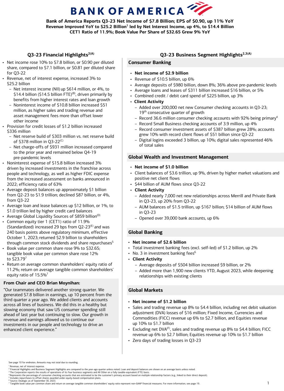 1 Q3-23 Financial Highlights2(A) Q3-23 Business Segment Highlights2,3(A) Consumer Banking Global Wealth and Investment Management Global Banking Global Markets See page 10 for endnotes. Amounts may not total due to rounding. 1 Revenue, net of interest expense. 2 Financial Highlights and Business Segment Highlights are compared to the year-ago quarter unless noted. Loan and deposit balances are shown on an average basis unless noted. 3 The Corporation reports the results of operations of its four business segments and All Other on a fully taxable-equivalent (FTE) basis. 4 Represents the percentage of consumer checking accounts that are estimated to be the customer’s primary account based on multiple relationship factors (e.g., linked to their direct deposit). 5 Includes repurchases to offset shares awarded under equity-based compensation plans. 6 Source: Dealogic as of September 30, 2023. 7 Tangible book value per common share and return on average tangible common shareholders’ equity ratio represent non-GAAP financial measures. For more information, see page 19. • Net income rose 10% to $7.8 billion, or $0.90 per diluted share, compared to $7.1 billion, or $0.81 per diluted share for Q3-22 • Revenue, net of interest expense, increased 3% to $25.2 billion – Net interest income (NII) up $614 million, or 4%, to $14.4 billion ($14.5 billion FTE)(B), driven primarily by benefits from higher interest rates and loan growth – Noninterest income of $10.8 billion increased $51 million, as higher sales and trading revenue and asset management fees more than offset lower other income • Provision for credit losses of $1.2 billion increased $336 million – Net reserve build of $303 million vs. net reserve build of $378 million in Q3-22(C) – Net charge-offs of $931 million increased compared to the prior year and remained below Q4-19 pre-pandemic levels • Noninterest expense of $15.8 billion increased 3% driven by increased investments in the franchise across people and technology, as well as higher FDIC expense from the increased assessment on banks announced in 2022; efficiency ratio of 63% • Average deposit balances up approximately $1 billion from Q2-23 to $1.9 trillion; declined $87 billion, or 4%, from Q3-22 • Average loan and lease balances up $12 billion, or 1%, to $1.0 trillion led by higher credit card balances • Average Global Liquidity Sources of $859 billion(D) • Common equity tier 1 (CET1) ratio of 11.9% (Standardized) increased 29 bps from Q2-23(E) and was 240 basis points above regulatory minimum, effective October 1, 2023; returned $2.9 billion to shareholders through common stock dividends and share repurchases5 • Book value per common share rose 9% to $32.65; tangible book value per common share rose 12% to $23.797 • Return on average common shareholders' equity ratio of 11.2%; return on average tangible common shareholders' equity ratio of 15.5%7 • Net income of $1.2 billion • Sales and trading revenue up 8% to $4.4 billion, including net debit valuation adjustment (DVA) losses of $16 million; Fixed Income, Currencies and Commodities (FICC) revenue up 6% to $2.7 billion, and Equities revenue up 10% to $1.7 billion • Excluding net DVA(F), sales and trading revenue up 8% to $4.4 billion; FICC revenue up 6% to $2.7 billion; Equities revenue up 10% to $1.7 billion • Zero days of trading losses in Q3-23 From Chair and CEO Brian Moynihan: “Our teammates delivered another strong quarter. We generated $7.8 billion in earnings, up 10 percent from the third quarter a year ago. We added clients and accounts across all lines of business. We did this in a healthy but slowing economy that saw US consumer spending still ahead of last year but continuing to slow. Our growth in revenue and earnings allowed us to continue our investments in our people and technology to drive an enhanced client experience.” • Net income of $1.0 billion • Client balances of $3.6 trillion, up 9%, driven by higher market valuations and positive net client flows • $44 billion of AUM flows since Q3-22 • Client Activity – Added nearly 7,000 net new relationships across Merrill and Private Bank in Q3-23, up 20% from Q3-22 – AUM balances of $1.5 trillion, up $167 billion; $14 billion of AUM flows in Q3-23 – Opened over 39,000 bank accounts, up 6% • Net income of $2.6 billion • Total investment banking fees (excl. self-led) of $1.2 billion, up 2% • No. 3 in investment banking fees6 • Client Activity – Average deposits of $504 billion increased $9 billion, or 2% – Added more than 1,900 new clients YTD, August 2023, while deepening relationships with existing clients • Net income of $2.9 billion • Revenue of $10.5 billion, up 6% • Average deposits of $980 billion, down 8%; 36% above pre-pandemic levels • Average loans and leases of $311 billion increased $16 billion, or 5% • Combined credit / debit card spend of $225 billion, up 3% • Client Activity – Added over 200,000 net new Consumer checking accounts in Q3-23; 19th consecutive quarter of growth – Record 36.6 million consumer checking accounts with 92% being primary4 – Record Small Business checking accounts of 3.9 million, up 4% – Record consumer investment assets of $387 billion grew 28%; accounts grew 10% with record client flows of $51 billion since Q3-22 – Digital logins exceeded 3 billion, up 10%; digital sales represented 46% of total sales Bank of America Reports Q3-23 Net Income of $7.8 Billion; EPS of $0.90, up 11% YoY Revenue Improved YoY to $25.2 Billion1 led by Net Interest Income, up 4%, to $14.4 Billion CET1 Ratio of 11.9%; Book Value Per Share of $32.65 Grew 9% YoY