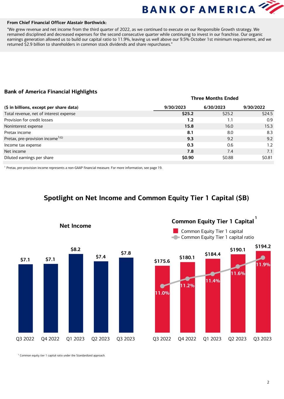 2 Bank of America Financial Highlights Three Months Ended ($ in billions, except per share data) 9/30/2023 6/30/2023 9/30/2022 Total revenue, net of interest expense $25.2 $25.2 $24.5 Provision for credit losses 1.2 1.1 0.9 Noninterest expense 15.8 16.0 15.3 Pretax income 8.1 8.0 8.3 Pretax, pre-provision income1(G) 9.3 9.2 9.2 Income tax expense 0.3 0.6 1.2 Net income 7.8 7.4 7.1 Diluted earnings per share $0.90 $0.88 $0.81 1 Pretax, pre-provision income represents a non-GAAP financial measure. For more information, see page 19. From Chief Financial Officer Alastair Borthwick: “We grew revenue and net income from the third quarter of 2022, as we continued to execute on our Responsible Growth strategy. We remained disciplined and decreased expenses for the second consecutive quarter while continuing to invest in our franchise. Our organic earnings generation allowed us to build our capital ratio to 11.9%, leaving us well above our 9.5% October 1st minimum requirement, and we returned $2.9 billion to shareholders in common stock dividends and share repurchases.” Common Equity Tier 1 Capital $175.6 $180.1 $184.4 $190.1 $194.2 11.0% 11.2% 11.4% 11.6% 11.9% Common Equity Tier 1 capital Common Equity Tier 1 capital ratio Q3 2022 Q4 2022 Q1 2023 Q2 2023 Q3 2023 Net Income $7.1 $7.1 $8.2 $7.4 $7.8 Q3 2022 Q4 2022 Q1 2023 Q2 2023 Q3 2023 Spotlight on Net Income and Common Equity Tier 1 Capital ($B) 1 Common equity tier 1 capital ratio under the Standardized approach. 1