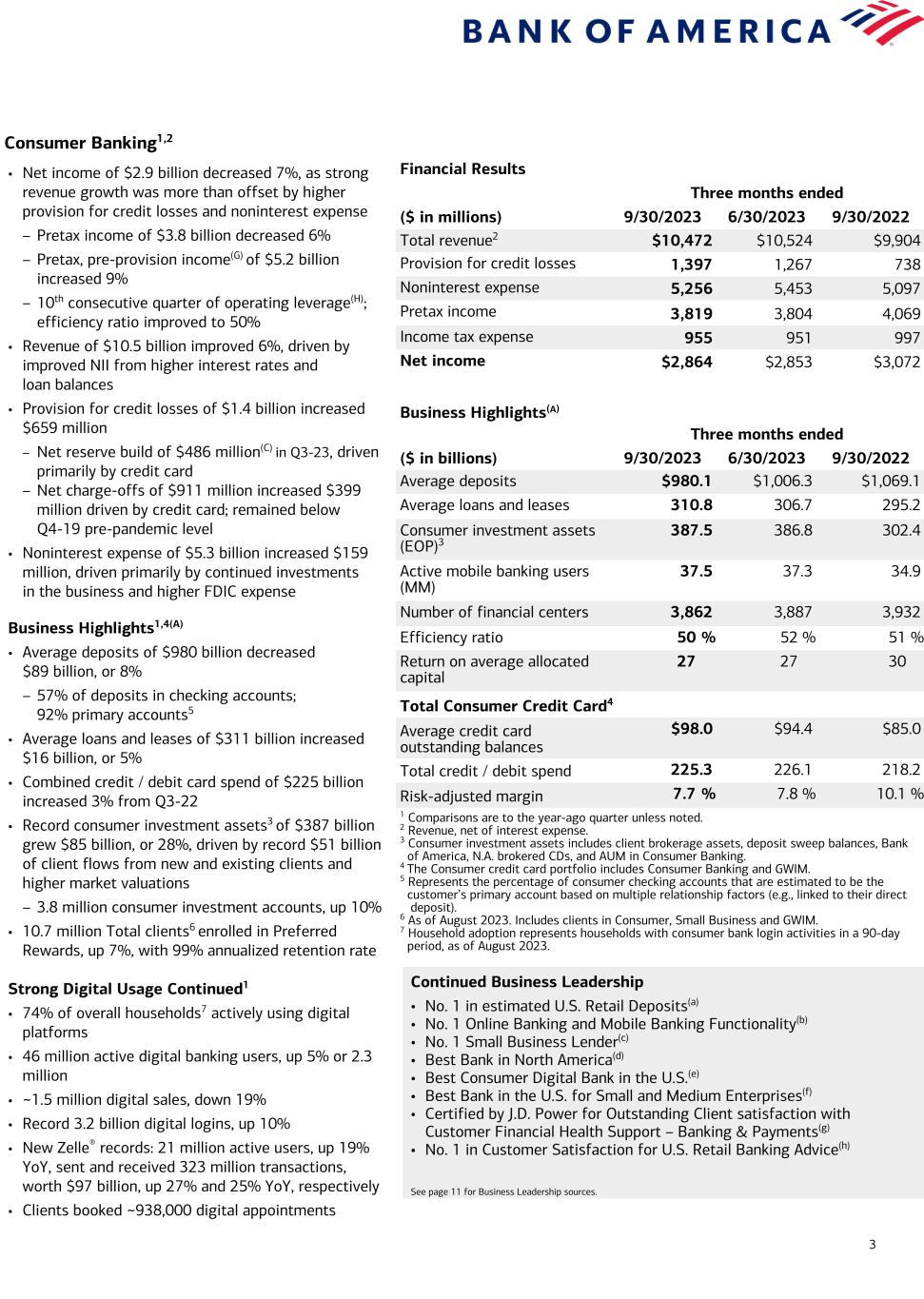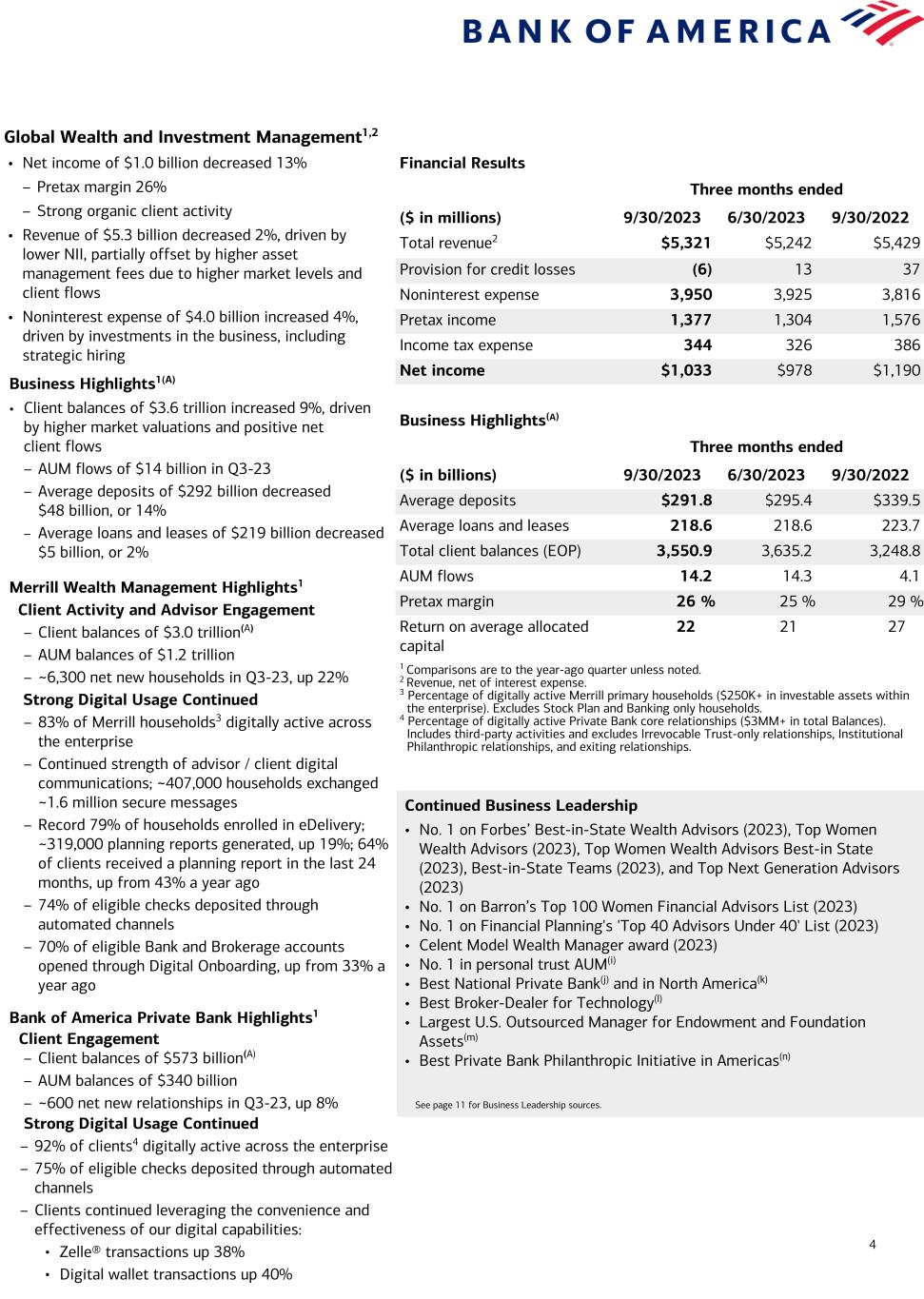 3 Consumer Banking1,2 Financial Results Three months ended ($ in millions) 9/30/2023 6/30/2023 9/30/2022 Total revenue2 $10,472 $10,524 $9,904 Provision for credit losses 1,397 1,267 738 Noninterest expense 5,256 5,453 5,097 Pretax income 3,819 3,804 4,069 Income tax expense 955 951 997 Net income $2,864 $2,853 $3,072 Business Highlights(A) Three months ended ($ in billions) 9/30/2023 6/30/2023 9/30/2022 Average deposits $980.1 $1,006.3 $1,069.1 Average loans and leases 310.8 306.7 295.2 Consumer investment assets (EOP)3 387.5 386.8 302.4 Active mobile banking users (MM) 37.5 37.3 34.9 Number of financial centers 3,862 3,887 3,932 Efficiency ratio 50 % 52 % 51 % Return on average allocated capital 27 27 30 Total Consumer Credit Card4 Average credit card outstanding balances $98.0 $94.4 $85.0 Total credit / debit spend 225.3 226.1 218.2 Risk-adjusted margin 7.7 % 7.8 % 10.1 % 1 Comparisons are to the year-ago quarter unless noted. 2 Revenue, net of interest expense. 3 Consumer investment assets includes client brokerage assets, deposit sweep balances, Bank of America, N.A. brokered CDs, and AUM in Consumer Banking. 4 The Consumer credit card portfolio includes Consumer Banking and GWIM. 5 Represents the percentage of consumer checking accounts that are estimated to be the customer’s primary account based on multiple relationship factors (e.g., linked to their direct deposit). 6 As of August 2023. Includes clients in Consumer, Small Business and GWIM. 7 Household adoption represents households with consumer bank login activities in a 90-day period, as of August 2023. • Net income of $2.9 billion decreased 7%, as strong revenue growth was more than offset by higher provision for credit losses and noninterest expense – Pretax income of $3.8 billion decreased 6% – Pretax, pre-provision income(G) of $5.2 billion increased 9% – 10th consecutive quarter of operating leverage(H); efficiency ratio improved to 50% • Revenue of $10.5 billion improved 6%, driven by improved NII from higher interest rates and loan balances • Provision for credit losses of $1.4 billion increased $659 million – Net reserve build of $486 million(C) in Q3-23, driven primarily by credit card – Net charge-offs of $911 million increased $399 million driven by credit card; remained below Q4-19 pre-pandemic level • Noninterest expense of $5.3 billion increased $159 million, driven primarily by continued investments in the business and higher FDIC expense Business Highlights1,4(A) • Average deposits of $980 billion decreased $89 billion, or 8% – 57% of deposits in checking accounts; 92% primary accounts5 • Average loans and leases of $311 billion increased $16 billion, or 5% • Combined credit / debit card spend of $225 billion increased 3% from Q3-22 • Record consumer investment assets3 of $387 billion grew $85 billion, or 28%, driven by record $51 billion of client flows from new and existing clients and higher market valuations – 3.8 million consumer investment accounts, up 10% • 10.7 million Total clients6 enrolled in Preferred Rewards, up 7%, with 99% annualized retention rate Strong Digital Usage Continued1 • 74% of overall households7 actively using digital platforms • 46 million active digital banking users, up 5% or 2.3 million • ~1.5 million digital sales, down 19% • Record 3.2 billion digital logins, up 10% • New Zelle® records: 21 million active users, up 19% YoY, sent and received 323 million transactions, worth $97 billion, up 27% and 25% YoY, respectively • Clients booked ~938,000 digital appointments Continued Business Leadership • No. 1 in estimated U.S. Retail Deposits(a) • No. 1 Online Banking and Mobile Banking Functionality(b) • No. 1 Small Business Lender(c) • Best Bank in North America(d) • Best Consumer Digital Bank in the U.S.(e) • Best Bank in the U.S. for Small and Medium Enterprises(f) • Certified by J.D. Power for Outstanding Client satisfaction with Customer Financial Health Support – Banking & Payments(g) • No. 1 in Customer Satisfaction for U.S. Retail Banking Advice(h) See page 11 for Business Leadership sources.