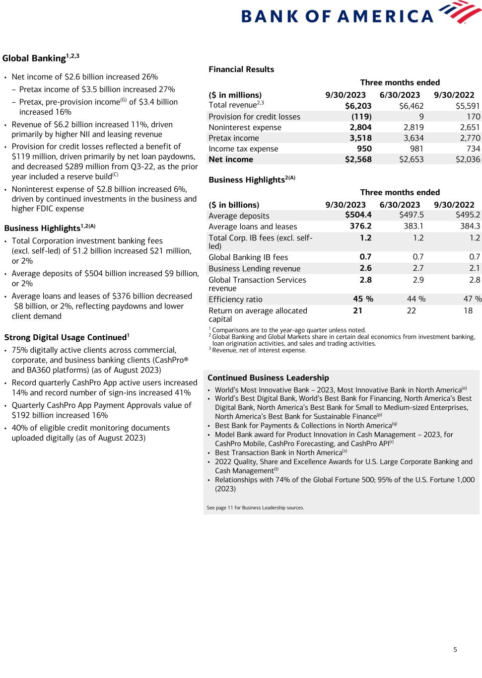 4 Global Wealth and Investment Management1,2 Financial Results Three months ended ($ in millions) 9/30/2023 6/30/2023 9/30/2022 Total revenue2 $5,321 $5,242 $5,429 Provision for credit losses (6) 13 37 Noninterest expense 3,950 3,925 3,816 Pretax income 1,377 1,304 1,576 Income tax expense 344 326 386 Net income $1,033 $978 $1,190 Business Highlights(A) Three months ended ($ in billions) 9/30/2023 6/30/2023 9/30/2022 Average deposits $291.8 $295.4 $339.5 Average loans and leases 218.6 218.6 223.7 Total client balances (EOP) 3,550.9 3,635.2 3,248.8 AUM flows 14.2 14.3 4.1 Pretax margin 26 % 25 % 29 % Return on average allocated capital 22 21 27 1 Comparisons are to the year-ago quarter unless noted. 2 Revenue, net of interest expense. 3 Percentage of digitally active Merrill primary households ($250K+ in investable assets within the enterprise). Excludes Stock Plan and Banking only households. 4 Percentage of digitally active Private Bank core relationships ($3MM+ in total Balances). Includes third-party activities and excludes Irrevocable Trust-only relationships, Institutional Philanthropic relationships, and exiting relationships. Continued Business Leadership • No. 1 on Forbes’ Best-in-State Wealth Advisors (2023), Top Women Wealth Advisors (2023), Top Women Wealth Advisors Best-in State (2023), Best-in-State Teams (2023), and Top Next Generation Advisors (2023) • No. 1 on Barron’s Top 100 Women Financial Advisors List (2023) • No. 1 on Financial Planning's 'Top 40 Advisors Under 40' List (2023) • Celent Model Wealth Manager award (2023) • No. 1 in personal trust AUM(i) • Best National Private Bank(j) and in North America(k) • Best Broker-Dealer for Technology(l) • Largest U.S. Outsourced Manager for Endowment and Foundation Assets(m) • Best Private Bank Philanthropic Initiative in Americas(n) See page 11 for Business Leadership sources. • Net income of $1.0 billion decreased 13% – Pretax margin 26% – Strong organic client activity • Revenue of $5.3 billion decreased 2%, driven by lower NII, partially offset by higher asset management fees due to higher market levels and client flows • Noninterest expense of $4.0 billion increased 4%, driven by investments in the business, including strategic hiring Business Highlights1(A) • Client balances of $3.6 trillion increased 9%, driven by higher market valuations and positive net client flows – AUM flows of $14 billion in Q3-23 – Average deposits of $292 billion decreased $48 billion, or 14% – Average loans and leases of $219 billion decreased $5 billion, or 2% Merrill Wealth Management Highlights1 Client Activity and Advisor Engagement – Client balances of $3.0 trillion(A) – AUM balances of $1.2 trillion – ~6,300 net new households in Q3-23, up 22% Strong Digital Usage Continued – 83% of Merrill households3 digitally active across the enterprise – Continued strength of advisor / client digital communications; ~407,000 households exchanged ~1.6 million secure messages – Record 79% of households enrolled in eDelivery; ~319,000 planning reports generated, up 19%; 64% of clients received a planning report in the last 24 months, up from 43% a year ago – 74% of eligible checks deposited through automated channels – 70% of eligible Bank and Brokerage accounts opened through Digital Onboarding, up from 33% a year ago Client Engagement – Client balances of $573 billion(A) – AUM balances of $340 billion – ~600 net new relationships in Q3-23, up 8% Bank of America Private Bank Highlights1 Strong Digital Usage Continued – 92% of clients4 digitally active across the enterprise – 75% of eligible checks deposited through automated channels – Clients continued leveraging the convenience and effectiveness of our digital capabilities: ▪ Zelle® transactions up 38% ▪ Digital wallet transactions up 40%