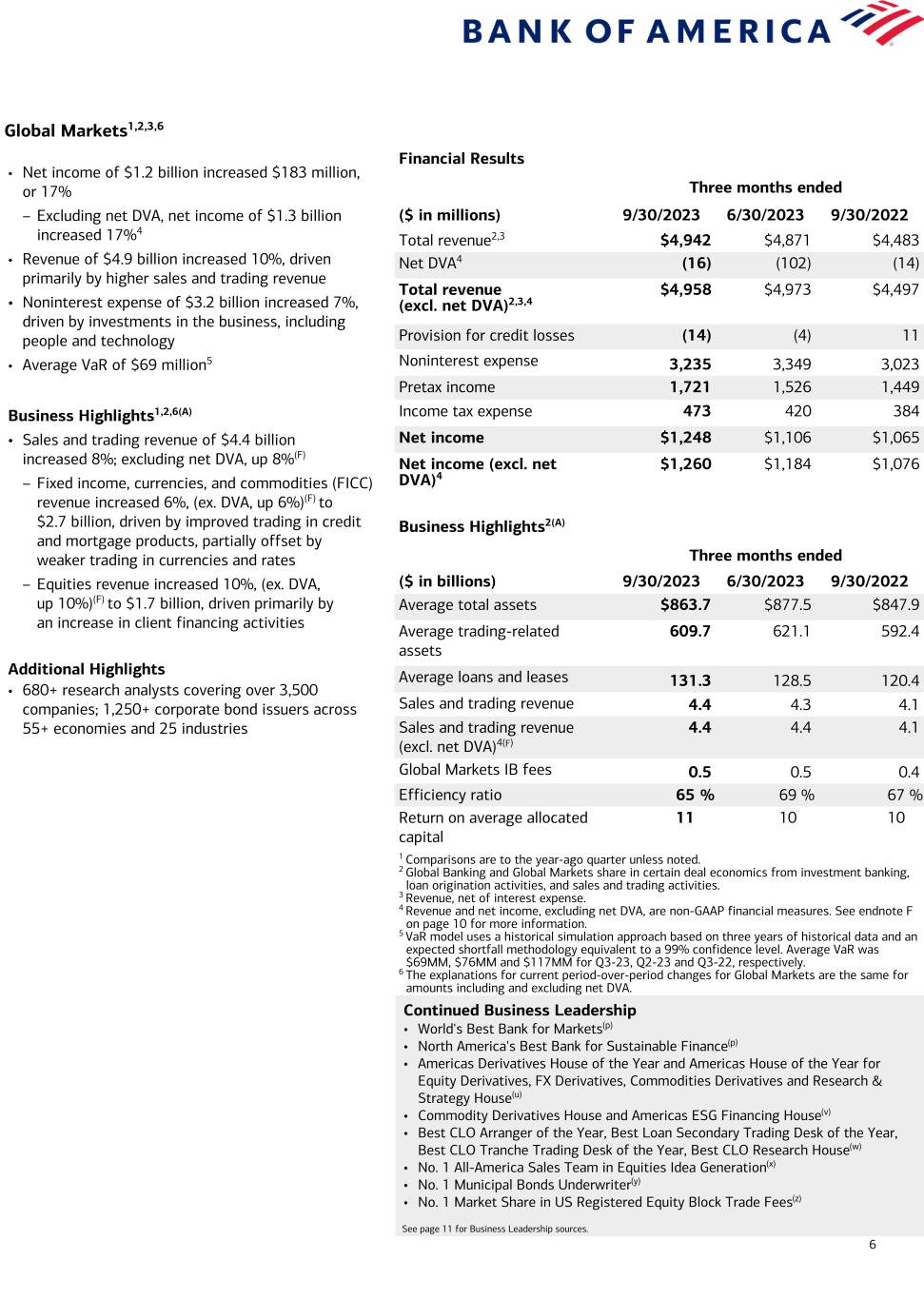 6 Global Markets1,2,3,6 Financial Results Three months ended ($ in millions) 9/30/2023 6/30/2023 9/30/2022 Total revenue2,3 $4,942 $4,871 $4,483 Net DVA4 (16) (102) (14) Total revenue (excl. net DVA)2,3,4 $4,958 $4,973 $4,497 Provision for credit losses (14) (4) 11 Noninterest expense 3,235 3,349 3,023 Pretax income 1,721 1,526 1,449 Income tax expense 473 420 384 Net income $1,248 $1,106 $1,065 Net income (excl. net DVA)4 $1,260 $1,184 $1,076 Business Highlights2(A) Three months ended ($ in billions) 9/30/2023 6/30/2023 9/30/2022 Average total assets $863.7 $877.5 $847.9 Average trading-related assets 609.7 621.1 592.4 Average loans and leases 131.3 128.5 120.4 Sales and trading revenue 4.4 4.3 4.1 Sales and trading revenue (excl. net DVA)4(F) 4.4 4.4 4.1 Global Markets IB fees 0.5 0.5 0.4 Efficiency ratio 65 % 69 % 67 % Return on average allocated capital 11 10 10 1 Comparisons are to the year-ago quarter unless noted. 2 Global Banking and Global Markets share in certain deal economics from investment banking, loan origination activities, and sales and trading activities. 3 Revenue, net of interest expense. 4 Revenue and net income, excluding net DVA, are non-GAAP financial measures. See endnote F on page 10 for more information. 5 VaR model uses a historical simulation approach based on three years of historical data and an expected shortfall methodology equivalent to a 99% confidence level. Average VaR was $69MM, $76MM and $117MM for Q3-23, Q2-23 and Q3-22, respectively. 6 The explanations for current period-over-period changes for Global Markets are the same for amounts including and excluding net DVA. • Net income of $1.2 billion increased $183 million, or 17% – Excluding net DVA, net income of $1.3 billion increased 17%4 • Revenue of $4.9 billion increased 10%, driven primarily by higher sales and trading revenue • Noninterest expense of $3.2 billion increased 7%, driven by investments in the business, including people and technology • Average VaR of $69 million5 Business Highlights1,2,6(A) • Sales and trading revenue of $4.4 billion increased 8%; excluding net DVA, up 8%(F) – Fixed income, currencies, and commodities (FICC) revenue increased 6%, (ex. DVA, up 6%)(F) to $2.7 billion, driven by improved trading in credit and mortgage products, partially offset by weaker trading in currencies and rates – Equities revenue increased 10%, (ex. DVA, up 10%)(F) to $1.7 billion, driven primarily by an increase in client financing activities Additional Highlights • 680+ research analysts covering over 3,500 companies; 1,250+ corporate bond issuers across 55+ economies and 25 industries Continued Business Leadership • World's Best Bank for Markets(p) • North America's Best Bank for Sustainable Finance(p) • Americas Derivatives House of the Year and Americas House of the Year for Equity Derivatives, FX Derivatives, Commodities Derivatives and Research & Strategy House(u) • Commodity Derivatives House and Americas ESG Financing House(v) • Best CLO Arranger of the Year, Best Loan Secondary Trading Desk of the Year, Best CLO Tranche Trading Desk of the Year, Best CLO Research House(w) • No. 1 All-America Sales Team in Equities Idea Generation(x) • No. 1 Municipal Bonds Underwriter(y) • No. 1 Market Share in US Registered Equity Block Trade Fees(z) See page 11 for Business Leadership sources.