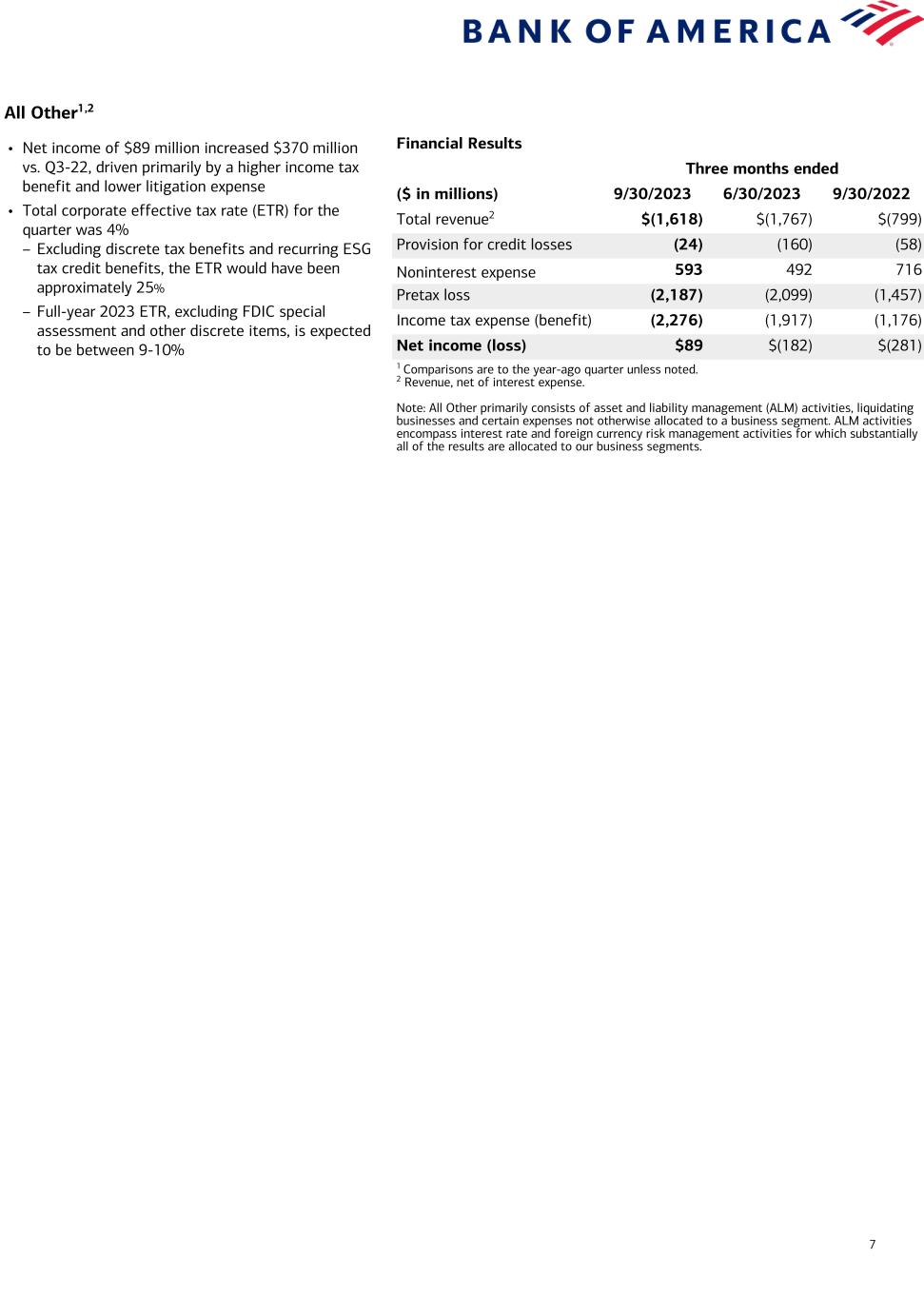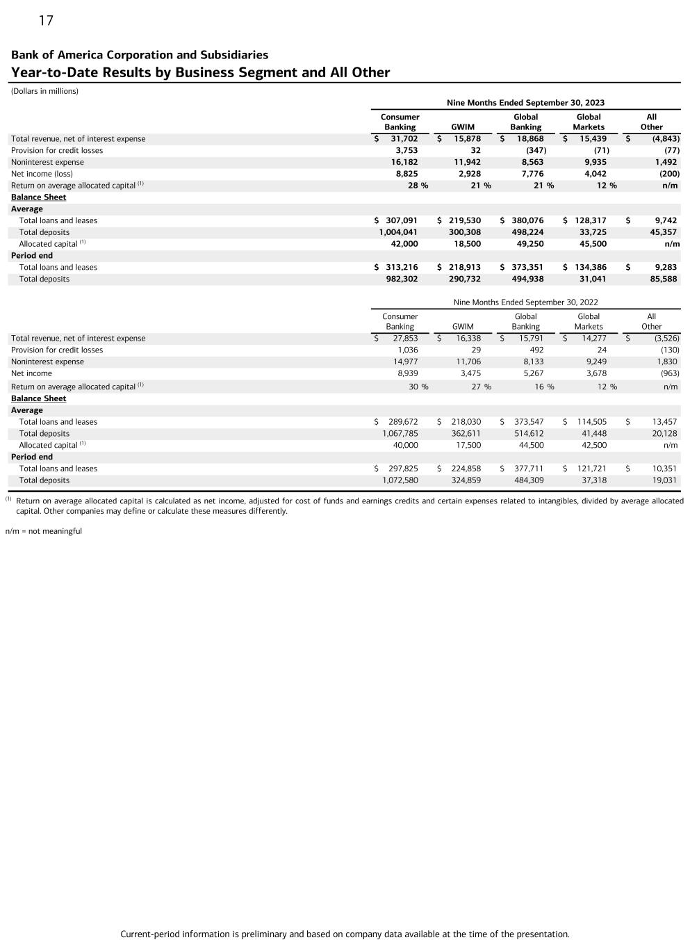 Current-period information is preliminary and based on company data available at the time of the presentation. 16 Bank of America Corporation and Subsidiaries Quarterly Results by Business Segment and All Other (Dollars in millions) Third Quarter 2023 Consumer Banking GWIM Global Banking Global Markets All Other Total revenue, net of interest expense $ 10,472 $ 5,321 $ 6,203 $ 4,942 $ (1,618) Provision for credit losses 1,397 (6) (119) (14) (24) Noninterest expense 5,256 3,950 2,804 3,235 593 Net income 2,864 1,033 2,568 1,248 89 Return on average allocated capital (1) 27 % 22 % 21 % 11 % n/m Balance Sheet Average Total loans and leases $ 310,761 $ 218,569 $ 376,214 $ 131,298 $ 9,412 Total deposits 980,051 291,770 504,432 31,890 68,010 Allocated capital (1) 42,000 18,500 49,250 45,500 n/m Quarter end Total loans and leases $ 313,216 $ 218,913 $ 373,351 $ 134,386 $ 9,283 Total deposits 982,302 290,732 494,938 31,041 85,588 Second Quarter 2023 Consumer Banking GWIM Global Banking Global Markets All Other Total revenue, net of interest expense $ 10,524 $ 5,242 $ 6,462 $ 4,871 $ (1,767) Provision for credit losses 1,267 13 9 (4) (160) Noninterest expense 5,453 3,925 2,819 3,349 492 Net income (loss) 2,853 978 2,653 1,106 (182) Return on average allocated capital (1) 27 % 21 % 22 % 10 % n/m Balance Sheet Average Total loans and leases $ 306,662 $ 218,604 $ 383,058 $ 128,539 $ 9,745 Total deposits 1,006,337 295,380 497,533 33,222 42,881 Allocated capital (1) 42,000 18,500 49,250 45,500 n/m Quarter end Total loans and leases $ 309,735 $ 219,208 $ 381,609 $ 131,128 $ 9,544 Total deposits 1,004,482 292,526 492,734 33,049 54,418 Third Quarter 2022 Consumer Banking GWIM Global Banking Global Markets All Other Total revenue, net of interest expense $ 9,904 $ 5,429 $ 5,591 $ 4,483 $ (799) Provision for credit losses 738 37 170 11 (58) Noninterest expense 5,097 3,816 2,651 3,023 716 Net income 3,072 1,190 2,036 1,065 (281) Return on average allocated capital (1) 30 % 27 % 18 % 10 % n/m Balance Sheet Average Total loans and leases $ 295,231 $ 223,734 $ 384,305 $ 120,435 $ 10,629 Total deposits 1,069,093 339,487 495,154 38,820 20,221 Allocated capital (1) 40,000 17,500 44,500 42,500 n/m Quarter end Total loans and leases $ 297,825 $ 224,858 $ 377,711 $ 121,721 $ 10,351 Total deposits 1,072,580 324,859 484,309 37,318 19,031 (1) Return on average allocated capital is calculated as net income, adjusted for cost of funds and earnings credits and certain expenses related to intangibles, divided by average allocated capital. Other companies may define or calculate these measures differently. n/m = not meaningful The Company reports the results of operations of its four business segments and All Other on a fully taxable-equivalent (FTE) basis.