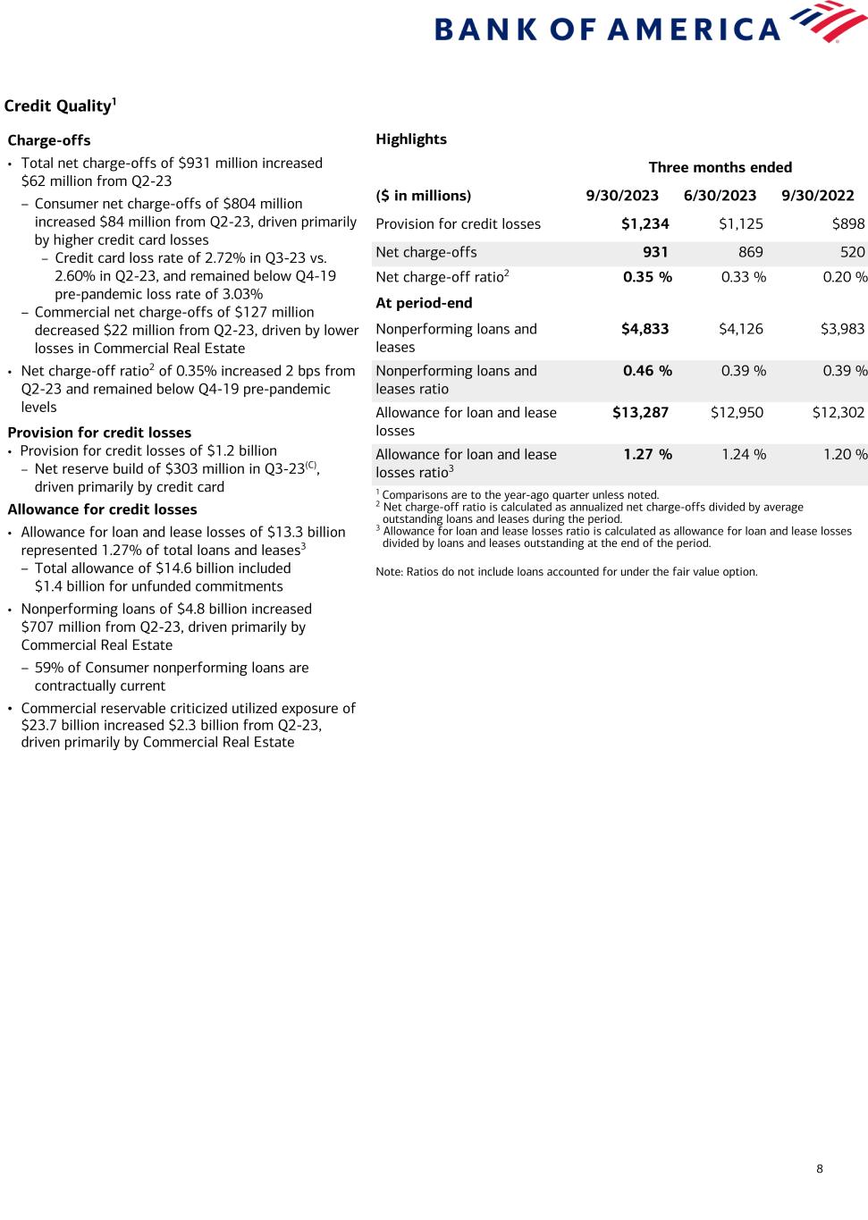 8 Credit Quality1 Highlights Three months ended ($ in millions) 9/30/2023 6/30/2023 9/30/2022 Provision for credit losses $1,234 $1,125 $898 Net charge-offs 931 869 520 Net charge-off ratio2 0.35 % 0.33 % 0.20 % At period-end Nonperforming loans and leases $4,833 $4,126 $3,983 Nonperforming loans and leases ratio 0.46 % 0.39 % 0.39 % Allowance for loan and lease losses $13,287 $12,950 $12,302 Allowance for loan and lease losses ratio3 1.27 % 1.24 % 1.20 % 1 Comparisons are to the year-ago quarter unless noted. 2 Net charge-off ratio is calculated as annualized net charge-offs divided by average outstanding loans and leases during the period. 3 Allowance for loan and lease losses ratio is calculated as allowance for loan and lease losses divided by loans and leases outstanding at the end of the period. Note: Ratios do not include loans accounted for under the fair value option. Charge-offs • Total net charge-offs of $931 million increased $62 million from Q2-23 – Consumer net charge-offs of $804 million increased $84 million from Q2-23, driven primarily by higher credit card losses – Credit card loss rate of 2.72% in Q3-23 vs. 2.60% in Q2-23, and remained below Q4-19 pre-pandemic loss rate of 3.03% – Commercial net charge-offs of $127 million decreased $22 million from Q2-23, driven by lower losses in Commercial Real Estate • Net charge-off ratio2 of 0.35% increased 2 bps from Q2-23 and remained below Q4-19 pre-pandemic levels Provision for credit losses • Provision for credit losses of $1.2 billion – Net reserve build of $303 million in Q3-23(C), driven primarily by credit card Allowance for credit losses • Allowance for loan and lease losses of $13.3 billion represented 1.27% of total loans and leases3 – Total allowance of $14.6 billion included $1.4 billion for unfunded commitments • Nonperforming loans of $4.8 billion increased $707 million from Q2-23, driven primarily by Commercial Real Estate – 59% of Consumer nonperforming loans are contractually current • Commercial reservable criticized utilized exposure of $23.7 billion increased $2.3 billion from Q2-23, driven primarily by Commercial Real Estate