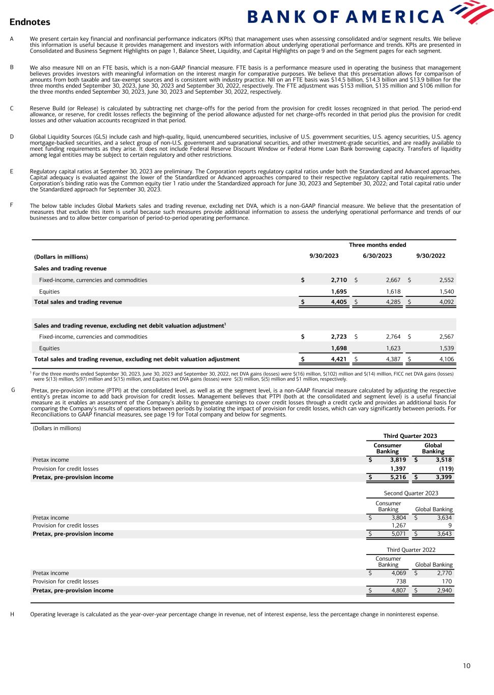 10 Endnotes H Operating leverage is calculated as the year-over-year percentage change in revenue, net of interest expense, less the percentage change in noninterest expense. Three months ended (Dollars in millions) 9/30/2023 6/30/2023 9/30/2022 Sales and trading revenue Fixed-income, currencies and commodities $ 2,710 $ 2,667 $ 2,552 Equities 1,695 1,618 1,540 Total sales and trading revenue $ 4,405 $ 4,285 $ 4,092 Sales and trading revenue, excluding net debit valuation adjustment1 Fixed-income, currencies and commodities $ 2,723 $ 2,764 $ 2,567 Equities 1,698 1,623 1,539 Total sales and trading revenue, excluding net debit valuation adjustment $ 4,421 $ 4,387 $ 4,106 A We present certain key financial and nonfinancial performance indicators (KPIs) that management uses when assessing consolidated and/or segment results. We believe this information is useful because it provides management and investors with information about underlying operational performance and trends. KPIs are presented in Consolidated and Business Segment Highlights on page 1, Balance Sheet, Liquidity, and Capital Highlights on page 9 and on the Segment pages for each segment. B We also measure NII on an FTE basis, which is a non-GAAP financial measure. FTE basis is a performance measure used in operating the business that management believes provides investors with meaningful information on the interest margin for comparative purposes. We believe that this presentation allows for comparison of amounts from both taxable and tax-exempt sources and is consistent with industry practice. NII on an FTE basis was $14.5 billion, $14.3 billion and $13.9 billion for the three months ended September 30, 2023, June 30, 2023 and September 30, 2022, respectively. The FTE adjustment was $153 million, $135 million and $106 million for the three months ended September 30, 2023, June 30, 2023 and September 30, 2022, respectively. C Reserve Build (or Release) is calculated by subtracting net charge-offs for the period from the provision for credit losses recognized in that period. The period-end allowance, or reserve, for credit losses reflects the beginning of the period allowance adjusted for net charge-offs recorded in that period plus the provision for credit losses and other valuation accounts recognized in that period. D Global Liquidity Sources (GLS) include cash and high-quality, liquid, unencumbered securities, inclusive of U.S. government securities, U.S. agency securities, U.S. agency mortgage-backed securities, and a select group of non-U.S. government and supranational securities, and other investment-grade securities, and are readily available to meet funding requirements as they arise. It does not include Federal Reserve Discount Window or Federal Home Loan Bank borrowing capacity. Transfers of liquidity among legal entities may be subject to certain regulatory and other restrictions. E Regulatory capital ratios at September 30, 2023 are preliminary. The Corporation reports regulatory capital ratios under both the Standardized and Advanced approaches. Capital adequacy is evaluated against the lower of the Standardized or Advanced approaches compared to their respective regulatory capital ratio requirements. The Corporation’s binding ratio was the Common equity tier 1 ratio under the Standardized approach for June 30, 2023 and September 30, 2022; and Total capital ratio under the Standardized approach for September 30, 2023. F The below table includes Global Markets sales and trading revenue, excluding net DVA, which is a non-GAAP financial measure. We believe that the presentation of measures that exclude this item is useful because such measures provide additional information to assess the underlying operational performance and trends of our businesses and to allow better comparison of period-to-period operating performance. 1 For the three months ended September 30, 2023, June 30, 2023 and September 30, 2022, net DVA gains (losses) were $(16) million, $(102) million and $(14) million, FICC net DVA gains (losses) were $(13) million, $(97) million and $(15) million, and Equities net DVA gains (losses) were $(3) million, $(5) million and $1 million, respectively. (Dollars in millions) Third Quarter 2023 Consumer Banking Global Banking Pretax income $ 3,819 $ 3,518 Provision for credit losses 1,397 (119) Pretax, pre-provision income $ 5,216 $ 3,399 Second Quarter 2023 Consumer Banking Global Banking Pretax income $ 3,804 $ 3,634 Provision for credit losses 1,267 9 Pretax, pre-provision income $ 5,071 $ 3,643 Third Quarter 2022 Consumer Banking Global Banking Pretax income $ 4,069 $ 2,770 Provision for credit losses 738 170 Pretax, pre-provision income $ 4,807 $ 2,940 G Pretax, pre-provision income (PTPI) at the consolidated level, as well as at the segment level, is a non-GAAP financial measure calculated by adjusting the respective entity’s pretax income to add back provision for credit losses. Management believes that PTPI (both at the consolidated and segment level) is a useful financial measure as it enables an assessment of the Company’s ability to generate earnings to cover credit losses through a credit cycle and provides an additional basis for comparing the Company's results of operations between periods by isolating the impact of provision for credit losses, which can vary significantly between periods. For Reconciliations to GAAP financial measures, see page 19 for Total company and below for segments.