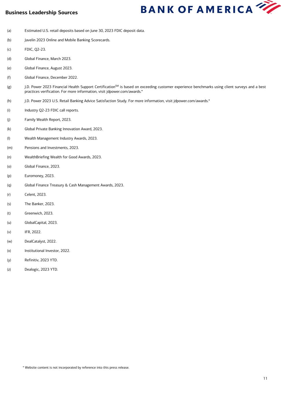 11 (a) Estimated U.S. retail deposits based on June 30, 2023 FDIC deposit data. (b) Javelin 2023 Online and Mobile Banking Scorecards. (c) FDIC, Q2-23. (d) Global Finance, March 2023. (e) Global Finance, August 2023. (f) Global Finance, December 2022. (g) J.D. Power 2023 Financial Health Support CertificationSM is based on exceeding customer experience benchmarks using client surveys and a best practices verification. For more information, visit jdpower.com/awards.* (h) J.D. Power 2023 U.S. Retail Banking Advice Satisfaction Study. For more information, visit jdpower.com/awards.* (i) Industry Q2-23 FDIC call reports. (j) Family Wealth Report, 2023. (k) Global Private Banking Innovation Award, 2023. (l) Wealth Management Industry Awards, 2023. (m) Pensions and Investments, 2023. (n) WealthBriefing Wealth for Good Awards, 2023. (o) Global Finance, 2023. (p) Euromoney, 2023. (q) Global Finance Treasury & Cash Management Awards, 2023. (r) Celent, 2023. (s) The Banker, 2023. (t) Greenwich, 2023. (u) GlobalCapital, 2023. (v) IFR, 2022. (w) DealCatalyst, 2022. (x) Institutional Investor, 2022. (y) Refinitiv, 2023 YTD. (z) Dealogic, 2023 YTD. * Website content is not incorporated by reference into this press release. Business Leadership Sources