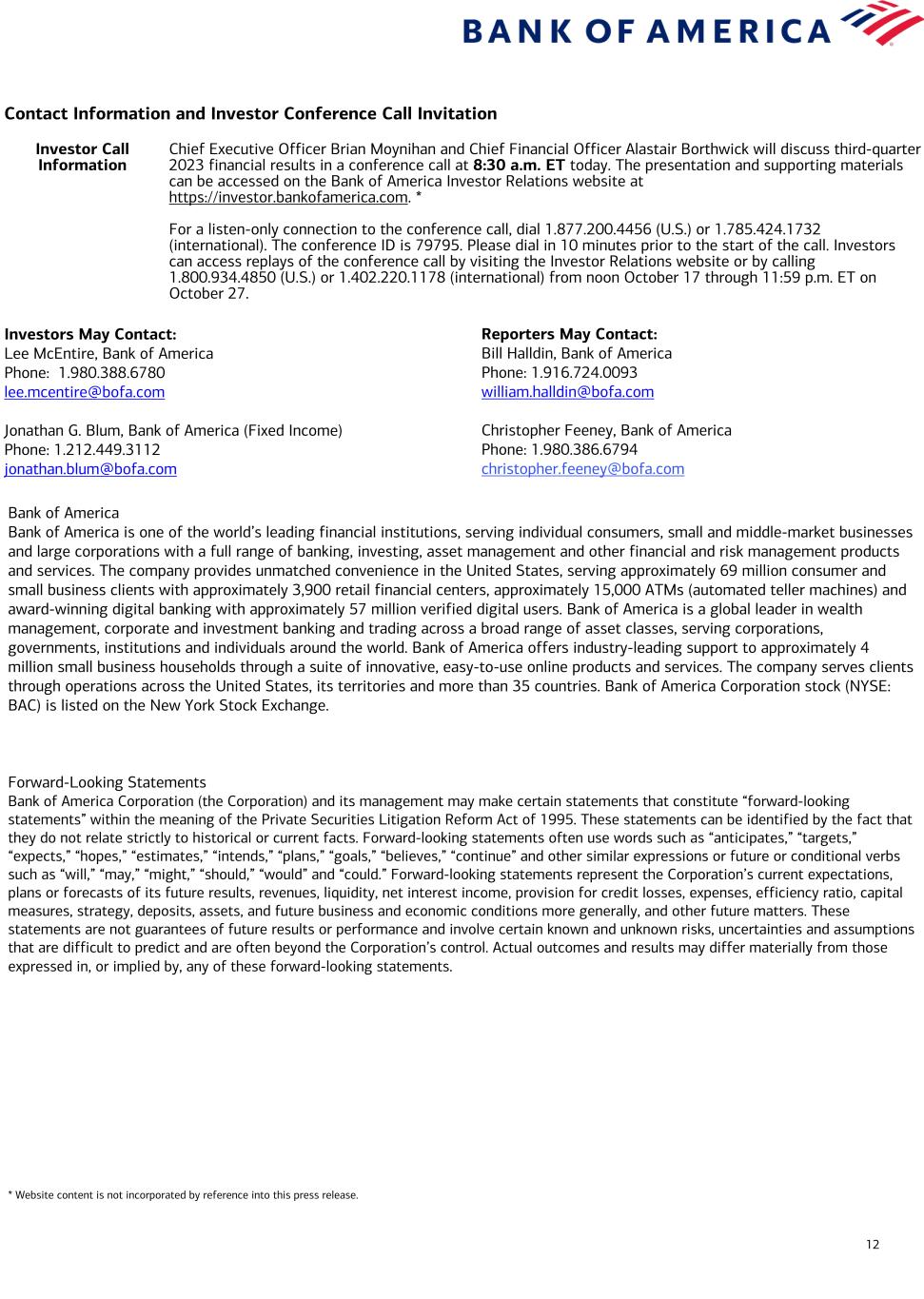 12 Contact Information and Investor Conference Call Invitation Investor Call Information Chief Executive Officer Brian Moynihan and Chief Financial Officer Alastair Borthwick will discuss third-quarter 2023 financial results in a conference call at 8:30 a.m. ET today. The presentation and supporting materials can be accessed on the Bank of America Investor Relations website at https://investor.bankofamerica.com. * For a listen-only connection to the conference call, dial 1.877.200.4456 (U.S.) or 1.785.424.1732 (international). The conference ID is 79795. Please dial in 10 minutes prior to the start of the call. Investors can access replays of the conference call by visiting the Investor Relations website or by calling 1.800.934.4850 (U.S.) or 1.402.220.1178 (international) from noon October 17 through 11:59 p.m. ET on October 27. Investors May Contact: Lee McEntire, Bank of America Phone: 1.980.388.6780 lee.mcentire@bofa.com Jonathan G. Blum, Bank of America (Fixed Income) Phone: 1.212.449.3112 jonathan.blum@bofa.com Bank of America Bank of America is one of the world’s leading financial institutions, serving individual consumers, small and middle-market businesses and large corporations with a full range of banking, investing, asset management and other financial and risk management products and services. The company provides unmatched convenience in the United States, serving approximately 69 million consumer and small business clients with approximately 3,900 retail financial centers, approximately 15,000 ATMs (automated teller machines) and award-winning digital banking with approximately 57 million verified digital users. Bank of America is a global leader in wealth management, corporate and investment banking and trading across a broad range of asset classes, serving corporations, governments, institutions and individuals around the world. Bank of America offers industry-leading support to approximately 4 million small business households through a suite of innovative, easy-to-use online products and services. The company serves clients through operations across the United States, its territories and more than 35 countries. Bank of America Corporation stock (NYSE: BAC) is listed on the New York Stock Exchange. Forward-Looking Statements Bank of America Corporation (the Corporation) and its management may make certain statements that constitute “forward-looking statements” within the meaning of the Private Securities Litigation Reform Act of 1995. These statements can be identified by the fact that they do not relate strictly to historical or current facts. Forward-looking statements often use words such as “anticipates,” “targets,” “expects,” “hopes,” “estimates,” “intends,” “plans,” “goals,” “believes,” “continue” and other similar expressions or future or conditional verbs such as “will,” “may,” “might,” “should,” “would” and “could.” Forward-looking statements represent the Corporation’s current expectations, plans or forecasts of its future results, revenues, liquidity, net interest income, provision for credit losses, expenses, efficiency ratio, capital measures, strategy, deposits, assets, and future business and economic conditions more generally, and other future matters. These statements are not guarantees of future results or performance and involve certain known and unknown risks, uncertainties and assumptions that are difficult to predict and are often beyond the Corporation’s control. Actual outcomes and results may differ materially from those expressed in, or implied by, any of these forward-looking statements. * Website content is not incorporated by reference into this press release. Reporters May Contact: Bill Halldin, Bank of America Phone: 1.916.724.0093 william.halldin@bofa.com Christopher Feeney, Bank of America Phone: 1.980.386.6794 christopher.feeney@bofa.com