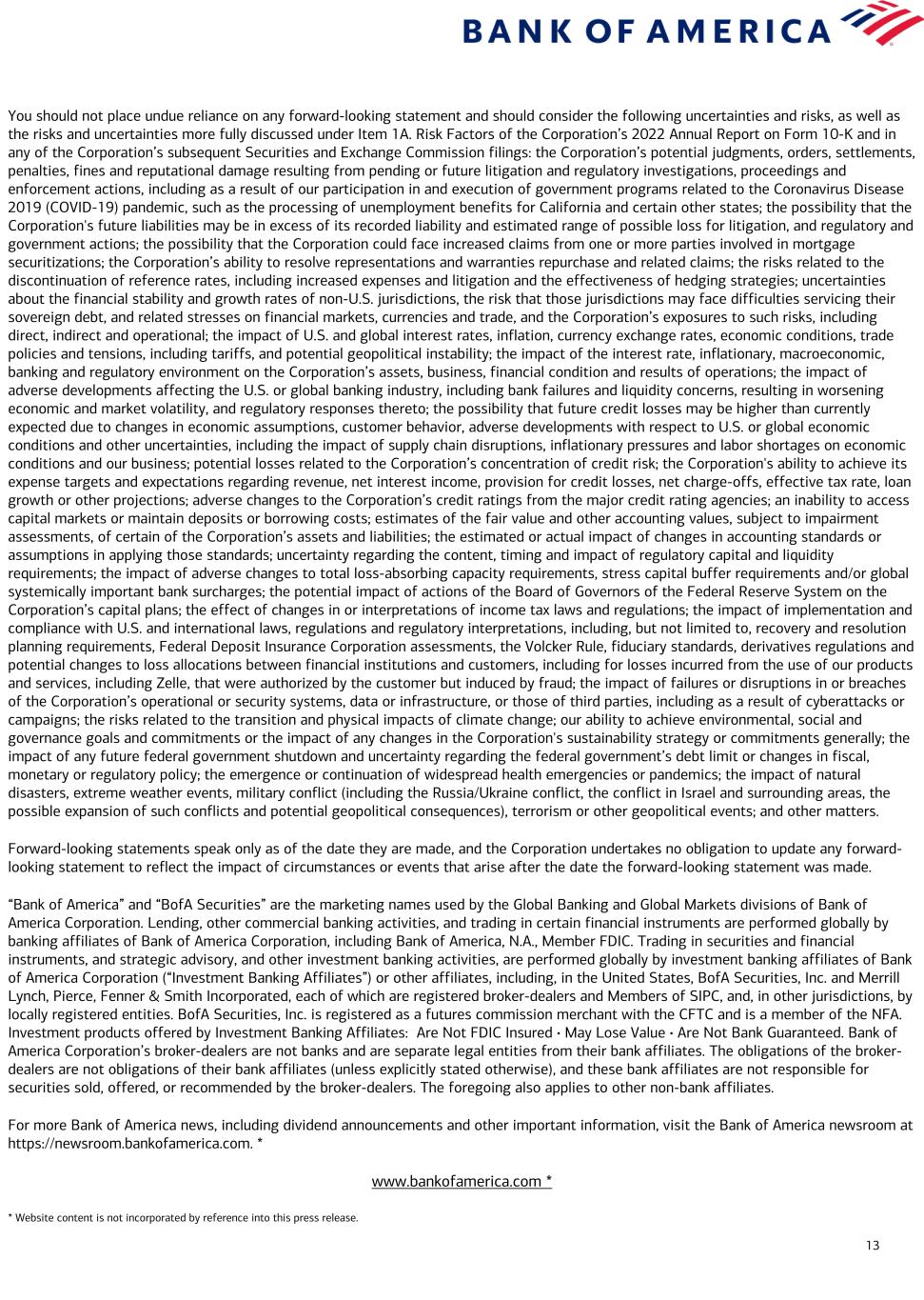 13 You should not place undue reliance on any forward-looking statement and should consider the following uncertainties and risks, as well as the risks and uncertainties more fully discussed under Item 1A. Risk Factors of the Corporation’s 2022 Annual Report on Form 10-K and in any of the Corporation’s subsequent Securities and Exchange Commission filings: the Corporation’s potential judgments, orders, settlements, penalties, fines and reputational damage resulting from pending or future litigation and regulatory investigations, proceedings and enforcement actions, including as a result of our participation in and execution of government programs related to the Coronavirus Disease 2019 (COVID-19) pandemic, such as the processing of unemployment benefits for California and certain other states; the possibility that the Corporation's future liabilities may be in excess of its recorded liability and estimated range of possible loss for litigation, and regulatory and government actions; the possibility that the Corporation could face increased claims from one or more parties involved in mortgage securitizations; the Corporation’s ability to resolve representations and warranties repurchase and related claims; the risks related to the discontinuation of reference rates, including increased expenses and litigation and the effectiveness of hedging strategies; uncertainties about the financial stability and growth rates of non-U.S. jurisdictions, the risk that those jurisdictions may face difficulties servicing their sovereign debt, and related stresses on financial markets, currencies and trade, and the Corporation’s exposures to such risks, including direct, indirect and operational; the impact of U.S. and global interest rates, inflation, currency exchange rates, economic conditions, trade policies and tensions, including tariffs, and potential geopolitical instability; the impact of the interest rate, inflationary, macroeconomic, banking and regulatory environment on the Corporation’s assets, business, financial condition and results of operations; the impact of adverse developments affecting the U.S. or global banking industry, including bank failures and liquidity concerns, resulting in worsening economic and market volatility, and regulatory responses thereto; the possibility that future credit losses may be higher than currently expected due to changes in economic assumptions, customer behavior, adverse developments with respect to U.S. or global economic conditions and other uncertainties, including the impact of supply chain disruptions, inflationary pressures and labor shortages on economic conditions and our business; potential losses related to the Corporation’s concentration of credit risk; the Corporation's ability to achieve its expense targets and expectations regarding revenue, net interest income, provision for credit losses, net charge-offs, effective tax rate, loan growth or other projections; adverse changes to the Corporation’s credit ratings from the major credit rating agencies; an inability to access capital markets or maintain deposits or borrowing costs; estimates of the fair value and other accounting values, subject to impairment assessments, of certain of the Corporation’s assets and liabilities; the estimated or actual impact of changes in accounting standards or assumptions in applying those standards; uncertainty regarding the content, timing and impact of regulatory capital and liquidity requirements; the impact of adverse changes to total loss-absorbing capacity requirements, stress capital buffer requirements and/or global systemically important bank surcharges; the potential impact of actions of the Board of Governors of the Federal Reserve System on the Corporation’s capital plans; the effect of changes in or interpretations of income tax laws and regulations; the impact of implementation and compliance with U.S. and international laws, regulations and regulatory interpretations, including, but not limited to, recovery and resolution planning requirements, Federal Deposit Insurance Corporation assessments, the Volcker Rule, fiduciary standards, derivatives regulations and potential changes to loss allocations between financial institutions and customers, including for losses incurred from the use of our products and services, including Zelle, that were authorized by the customer but induced by fraud; the impact of failures or disruptions in or breaches of the Corporation’s operational or security systems, data or infrastructure, or those of third parties, including as a result of cyberattacks or campaigns; the risks related to the transition and physical impacts of climate change; our ability to achieve environmental, social and governance goals and commitments or the impact of any changes in the Corporation's sustainability strategy or commitments generally; the impact of any future federal government shutdown and uncertainty regarding the federal government’s debt limit or changes in fiscal, monetary or regulatory policy; the emergence or continuation of widespread health emergencies or pandemics; the impact of natural disasters, extreme weather events, military conflict (including the Russia/Ukraine conflict, the conflict in Israel and surrounding areas, the possible expansion of such conflicts and potential geopolitical consequences), terrorism or other geopolitical events; and other matters. Forward-looking statements speak only as of the date they are made, and the Corporation undertakes no obligation to update any forward- looking statement to reflect the impact of circumstances or events that arise after the date the forward-looking statement was made. “Bank of America” and “BofA Securities” are the marketing names used by the Global Banking and Global Markets divisions of Bank of America Corporation. Lending, other commercial banking activities, and trading in certain financial instruments are performed globally by b