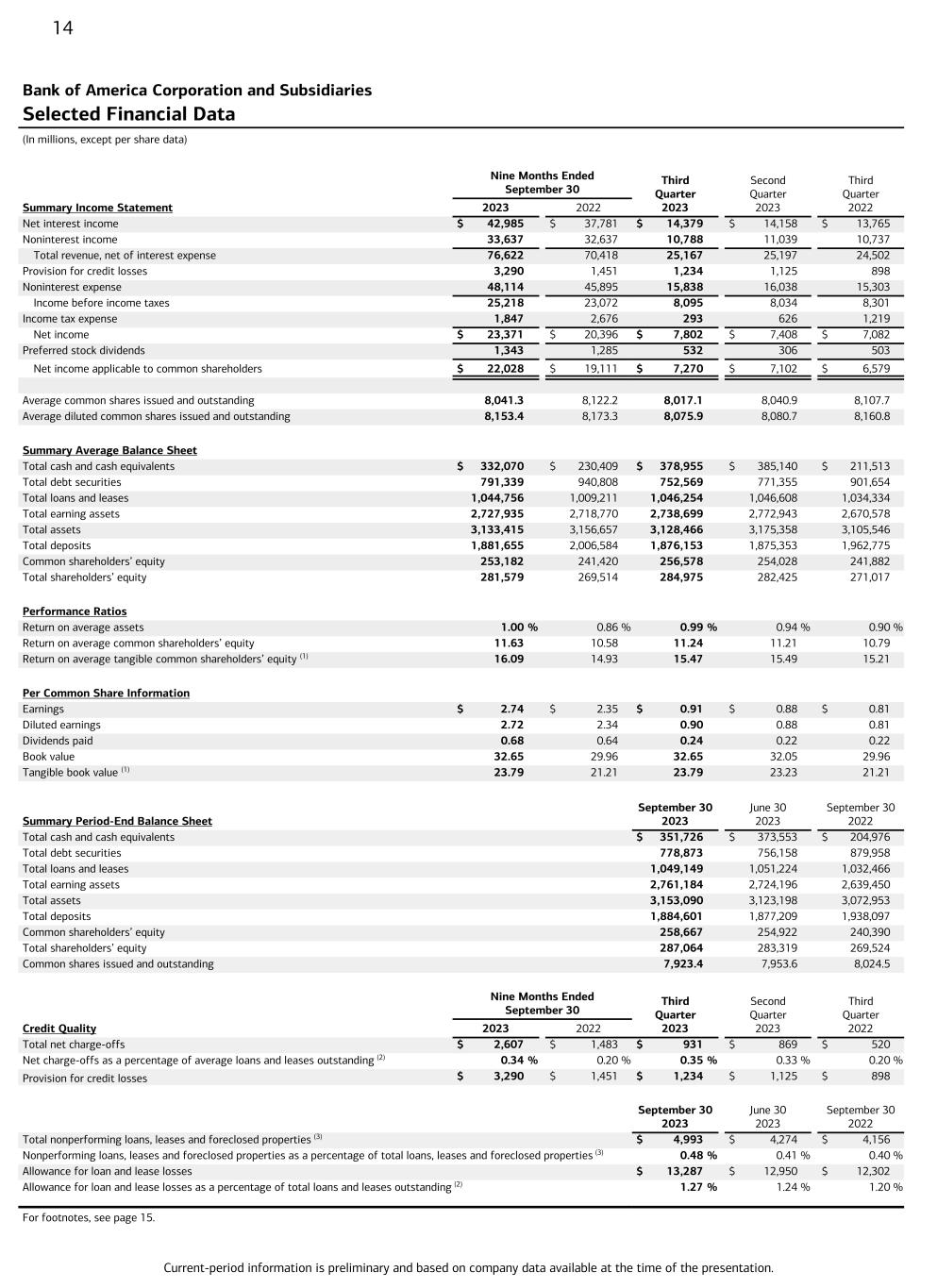 Current-period information is preliminary and based on company data available at the time of the presentation. 14 Bank of America Corporation and Subsidiaries Selected Financial Data (In millions, except per share data) Nine Months Ended September 30 Third Quarter 2023 Second Quarter 2023 Third Quarter 2022Summary Income Statement 2023 2022 Net interest income $ 42,985 $ 37,781 $ 14,379 $ 14,158 $ 13,765 Noninterest income 33,637 32,637 10,788 11,039 10,737 Total revenue, net of interest expense 76,622 70,418 25,167 25,197 24,502 Provision for credit losses 3,290 1,451 1,234 1,125 898 Noninterest expense 48,114 45,895 15,838 16,038 15,303 Income before income taxes 25,218 23,072 8,095 8,034 8,301 Income tax expense 1,847 2,676 293 626 1,219 Net income $ 23,371 $ 20,396 $ 7,802 $ 7,408 $ 7,082 Preferred stock dividends 1,343 1,285 532 306 503 Net income applicable to common shareholders $ 22,028 $ 19,111 $ 7,270 $ 7,102 $ 6,579 Average common shares issued and outstanding 8,041.3 8,122.2 8,017.1 8,040.9 8,107.7 Average diluted common shares issued and outstanding 8,153.4 8,173.3 8,075.9 8,080.7 8,160.8 Summary Average Balance Sheet Total cash and cash equivalents $ 332,070 $ 230,409 $ 378,955 $ 385,140 $ 211,513 Total debt securities 791,339 940,808 752,569 771,355 901,654 Total loans and leases 1,044,756 1,009,211 1,046,254 1,046,608 1,034,334 Total earning assets 2,727,935 2,718,770 2,738,699 2,772,943 2,670,578 Total assets 3,133,415 3,156,657 3,128,466 3,175,358 3,105,546 Total deposits 1,881,655 2,006,584 1,876,153 1,875,353 1,962,775 Common shareholders’ equity 253,182 241,420 256,578 254,028 241,882 Total shareholders’ equity 281,579 269,514 284,975 282,425 271,017 Performance Ratios Return on average assets 1.00 % 0.86 % 0.99 % 0.94 % 0.90 % Return on average common shareholders’ equity 11.63 10.58 11.24 11.21 10.79 Return on average tangible common shareholders’ equity (1) 16.09 14.93 15.47 15.49 15.21 Per Common Share Information Earnings $ 2.74 $ 2.35 $ 0.91 $ 0.88 $ 0.81 Diluted earnings 2.72 2.34 0.90 0.88 0.81 Dividends paid 0.68 0.64 0.24 0.22 0.22 Book value 32.65 29.96 32.65 32.05 29.96 Tangible book value (1) 23.79 21.21 23.79 23.23 21.21 Summary Period-End Balance Sheet September 30 2023 June 30 2023 September 30 2022 Total cash and cash equivalents $ 351,726 $ 373,553 $ 204,976 Total debt securities 778,873 756,158 879,958 Total loans and leases 1,049,149 1,051,224 1,032,466 Total earning assets 2,761,184 2,724,196 2,639,450 Total assets 3,153,090 3,123,198 3,072,953 Total deposits 1,884,601 1,877,209 1,938,097 Common shareholders’ equity 258,667 254,922 240,390 Total shareholders’ equity 287,064 283,319 269,524 Common shares issued and outstanding 7,923.4 7,953.6 8,024.5 Nine Months Ended September 30 Third Quarter 2023 Second Quarter 2023 Third Quarter 2022Credit Quality 2023 2022 Total net charge-offs $ 2,607 $ 1,483 $ 931 $ 869 $ 520 Net charge-offs as a percentage of average loans and leases outstanding (2) 0.34 % 0.20 % 0.35 % 0.33 % 0.20 % Provision for credit losses $ 3,290 $ 1,451 $ 1,234 $ 1,125 $ 898 September 30 2023 June 30 2023 September 30 2022 Total nonperforming loans, leases and foreclosed properties (3) $ 4,993 $ 4,274 $ 4,156 Nonperforming loans, leases and foreclosed properties as a percentage of total loans, leases and foreclosed properties (3) 0.48 % 0.41 % 0.40 % Allowance for loan and lease losses $ 13,287 $ 12,950 $ 12,302 Allowance for loan and lease losses as a percentage of total loans and leases outstanding (2) 1.27 % 1.24 % 1.20 % For footnotes, see page 15.