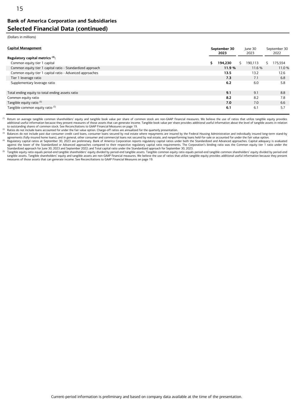 Current-period information is preliminary and based on company data available at the time of the presentation. 15 Bank of America Corporation and Subsidiaries Selected Financial Data (continued) (Dollars in millions) Capital Management September 30 2023 June 30 2023 September 30 2022 Regulatory capital metrics (4): Common equity tier 1 capital $ 194,230 $ 190,113 $ 175,554 Common equity tier 1 capital ratio - Standardized approach 11.9 % 11.6 % 11.0 % Common equity tier 1 capital ratio - Advanced approaches 13.5 13.2 12.6 Tier 1 leverage ratio 7.3 7.1 6.8 Supplementary leverage ratio 6.2 6.0 5.8 Total ending equity to total ending assets ratio 9.1 9.1 8.8 Common equity ratio 8.2 8.2 7.8 Tangible equity ratio (5) 7.0 7.0 6.6 Tangible common equity ratio (5) 6.1 6.1 5.7 (1) Return on average tangible common shareholders’ equity and tangible book value per share of common stock are non-GAAP financial measures. We believe the use of ratios that utilize tangible equity provides additional useful information because they present measures of those assets that can generate income. Tangible book value per share provides additional useful information about the level of tangible assets in relation to outstanding shares of common stock. See Reconciliations to GAAP Financial Measures on page 19. (2) Ratios do not include loans accounted for under the fair value option. Charge-off ratios are annualized for the quarterly presentation. (3) Balances do not include past due consumer credit card loans, consumer loans secured by real estate where repayments are insured by the Federal Housing Administration and individually insured long-term stand-by agreements (fully-insured home loans), and in general, other consumer and commercial loans not secured by real estate, and nonperforming loans held-for-sale or accounted for under the fair value option. (4) Regulatory capital ratios at September 30, 2023 are preliminary. Bank of America Corporation reports regulatory capital ratios under both the Standardized and Advanced approaches. Capital adequacy is evaluated against the lower of the Standardized or Advanced approaches compared to their respective regulatory capital ratio requirements. The Corporation’s binding ratio was the Common equity tier 1 ratio under the Standardized approach for June 30, 2023 and September 2022; and Total capital ratio under the Standardized approach for September 30, 2023. (5) Tangible equity ratio equals period-end tangible shareholders’ equity divided by period-end tangible assets. Tangible common equity ratio equals period-end tangible common shareholders’ equity divided by period-end tangible assets. Tangible shareholders’ equity and tangible assets are non-GAAP financial measures. We believe the use of ratios that utilize tangible equity provides additional useful information because they present measures of those assets that can generate income. See Reconciliations to GAAP Financial Measures on page 19.