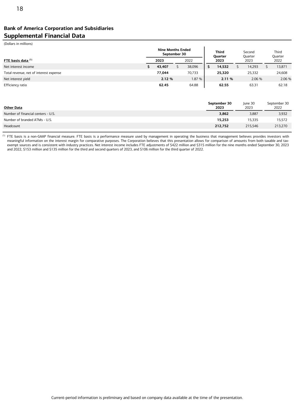 Current-period information is preliminary and based on company data available at the time of the presentation. 18 Bank of America Corporation and Subsidiaries Supplemental Financial Data (Dollars in millions) Nine Months Ended September 30 Third Quarter 2023 Second Quarter 2023 Third Quarter 2022FTE basis data (1) 2023 2022 Net interest income $ 43,407 $ 38,096 $ 14,532 $ 14,293 $ 13,871 Total revenue, net of interest expense 77,044 70,733 25,320 25,332 24,608 Net interest yield 2.12 % 1.87 % 2.11 % 2.06 % 2.06 % Efficiency ratio 62.45 64.88 62.55 63.31 62.18 Other Data September 30 2023 June 30 2023 September 30 2022 Number of financial centers - U.S. 3,862 3,887 3,932 Number of branded ATMs - U.S. 15,253 15,335 15,572 Headcount 212,752 215,546 213,270 (1) FTE basis is a non-GAAP financial measure. FTE basis is a performance measure used by management in operating the business that management believes provides investors with meaningful information on the interest margin for comparative purposes. The Corporation believes that this presentation allows for comparison of amounts from both taxable and tax- exempt sources and is consistent with industry practices. Net interest income includes FTE adjustments of $422 million and $315 million for the nine months ended September 30, 2023 and 2022, $153 million and $135 million for the third and second quarters of 2023, and $106 million for the third quarter of 2022.