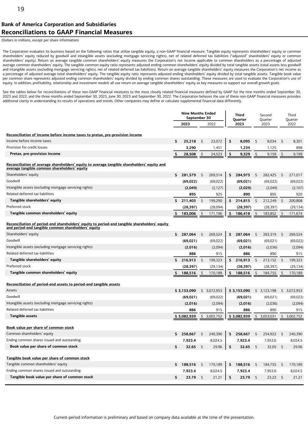 Current-period information is preliminary and based on company data available at the time of the presentation. 19 The Corporation evaluates its business based on the following ratios that utilize tangible equity, a non-GAAP financial measure. Tangible equity represents shareholders’ equity or common shareholders’ equity reduced by goodwill and intangible assets (excluding mortgage servicing rights), net of related deferred tax liabilities (“adjusted” shareholders’ equity or common shareholders’ equity). Return on average tangible common shareholders’ equity measures the Corporation’s net income applicable to common shareholders as a percentage of adjusted average common shareholders’ equity. The tangible common equity ratio represents adjusted ending common shareholders’ equity divided by total tangible assets (total assets less goodwill and intangible assets (excluding mortgage servicing rights), net of related deferred tax liabilities). Return on average tangible shareholders’ equity measures the Corporation’s net income as a percentage of adjusted average total shareholders’ equity. The tangible equity ratio represents adjusted ending shareholders’ equity divided by total tangible assets. Tangible book value per common share represents adjusted ending common shareholders’ equity divided by ending common shares outstanding. These measures are used to evaluate the Corporation’s use of equity. In addition, profitability, relationship and investment models all use return on average tangible shareholders’ equity as key measures to support our overall growth goals. See the tables below for reconciliations of these non-GAAP financial measures to the most closely related financial measures defined by GAAP for the nine months ended September 30, 2023 and 2022, and the three months ended September 30, 2023, June 30, 2023 and September 30, 2022. The Corporation believes the use of these non-GAAP financial measures provides additional clarity in understanding its results of operations and trends. Other companies may define or calculate supplemental financial data differently. Bank of America Corporation and Subsidiaries Reconciliations to GAAP Financial Measures (Dollars in millions, except per share information) Nine Months Ended September 30 Third Quarter 2023 Second Quarter 2023 Third Quarter 2022 2023 2022 Reconciliation of income before income taxes to pretax, pre-provision income Income before income taxes $ 25,218 $ 23,072 $ 8,095 $ 8,034 $ 8,301 Provision for credit losses 3,290 1,451 1,234 1,125 898 Pretax, pre-provision income $ 28,508 $ 24,523 $ 9,329 $ 9,159 $ 9,199 Reconciliation of average shareholders’ equity to average tangible shareholders’ equity and average tangible common shareholders’ equity Shareholders’ equity $ 281,579 $ 269,514 $ 284,975 $ 282,425 $ 271,017 Goodwill (69,022) (69,022) (69,021) (69,022) (69,022) Intangible assets (excluding mortgage servicing rights) (2,049) (2,127) (2,029) (2,049) (2,107) Related deferred tax liabilities 895 925 890 895 920 Tangible shareholders’ equity $ 211,403 $ 199,290 $ 214,815 $ 212,249 $ 200,808 Preferred stock (28,397) (28,094) (28,397) (28,397) (29,134) Tangible common shareholders’ equity $ 183,006 $ 171,196 $ 186,418 $ 183,852 $ 171,674 Reconciliation of period-end shareholders’ equity to period-end tangible shareholders’ equity and period-end tangible common shareholders’ equity Shareholders’ equity $ 287,064 $ 269,524 $ 287,064 $ 283,319 $ 269,524 Goodwill (69,021) (69,022) (69,021) (69,021) (69,022) Intangible assets (excluding mortgage servicing rights) (2,016) (2,094) (2,016) (2,036) (2,094) Related deferred tax liabilities 886 915 886 890 915 Tangible shareholders’ equity $ 216,913 $ 199,323 $ 216,913 $ 213,152 $ 199,323 Preferred stock (28,397) (29,134) (28,397) (28,397) (29,134) Tangible common shareholders’ equity $ 188,516 $ 170,189 $ 188,516 $ 184,755 $ 170,189 Reconciliation of period-end assets to period-end tangible assets Assets $ 3,153,090 $ 3,072,953 $ 3,153,090 $ 3,123,198 $ 3,072,953 Goodwill (69,021) (69,022) (69,021) (69,021) (69,022) Intangible assets (excluding mortgage servicing rights) (2,016) (2,094) (2,016) (2,036) (2,094) Related deferred tax liabilities 886 915 886 890 915 Tangible assets $ 3,082,939 $ 3,002,752 $ 3,082,939 $ 3,053,031 $ 3,002,752 Book value per share of common stock Common shareholders’ equity $ 258,667 $ 240,390 $ 258,667 $ 254,922 $ 240,390 Ending common shares issued and outstanding 7,923.4 8,024.5 7,923.4 7,953.6 8,024.5 Book value per share of common stock $ 32.65 $ 29.96 $ 32.65 $ 32.05 $ 29.96 Tangible book value per share of common stock Tangible common shareholders’ equity $ 188,516 $ 170,189 $ 188,516 $ 184,755 $ 170,189 Ending common shares issued and outstanding 7,923.4 8,024.5 7,923.4 7,953.6 8,024.5 Tangible book value per share of common stock $ 23.79 $ 21.21 $ 23.79 $ 23.23 $ 21.21