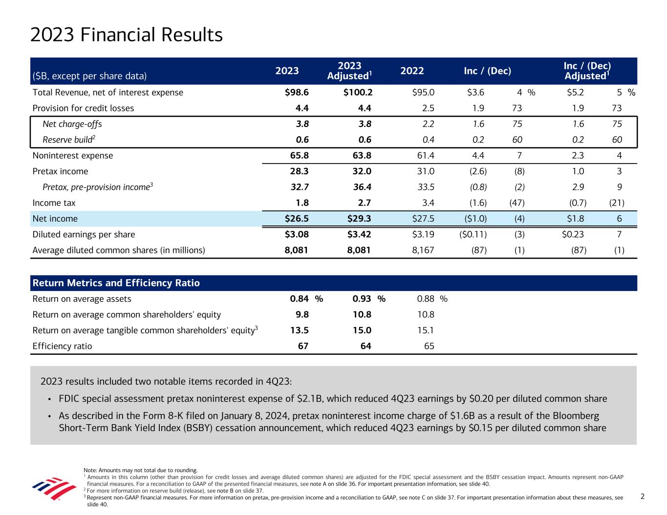 2023 Financial Results 2 ($B, except per share data) 2023 2023 Adjusted1 2022 Inc / (Dec) Inc / (Dec) Adjusted1 Total Revenue, net of interest expense $98.6 $100.2 $95.0 $3.6 4 % $5.2 5 % Provision for credit losses 4.4 4.4 2.5 1.9 73 1.9 73 Net charge-offs 3.8 3.8 2.2 1.6 75 1.6 75 Reserve build2 0.6 0.6 0.4 0.2 60 0.2 60 Noninterest expense 65.8 63.8 61.4 4.4 7 2.3 4 Pretax income 28.3 32.0 31.0 (2.6) (8) 1.0 3 Pretax, pre-provision income3 32.7 36.4 33.5 (0.8) (2) 2.9 9 Income tax 1.8 2.7 3.4 (1.6) (47) (0.7) (21) Net income $26.5 $29.3 $27.5 ($1.0) (4) $1.8 6 Diluted earnings per share $3.08 $3.42 $3.19 ($0.11) (3) $0.23 7 Average diluted common shares (in millions) 8,081 8,081 8,167 (87) (1) (87) (1) Return Metrics and Efficiency Ratio Return on average assets 0.84 % 0.93 % 0.88 % Return on average common shareholders' equity 9.8 10.8 10.8 Return on average tangible common shareholders' equity3 13.5 15.0 15.1 Efficiency ratio 67 64 65 Note: Amounts may not total due to rounding. 1 Amounts in this column (other than provision for credit losses and average diluted common shares) are adjusted for the FDIC special assessment and the BSBY cessation impact. Amounts represent non-GAAP financial measures. For a reconciliation to GAAP of the presented financial measures, see note A on slide 36. For important presentation information, see slide 40. 2 For more information on reserve build (release), see note B on slide 37. 3 Represent non-GAAP financial measures. For more information on pretax, pre-provision income and a reconciliation to GAAP, see note C on slide 37. For important presentation information about these measures, see slide 40. 2023 results included two notable items recorded in 4Q23: • FDIC special assessment pretax noninterest expense of $2.1B, which reduced 4Q23 earnings by $0.20 per diluted common share • As described in the Form 8-K filed on January 8, 2024, pretax noninterest income charge of $1.6B as a result of the Bloomberg Short-Term Bank Yield Index (BSBY) cessation announcement, which reduced 4Q23 earnings by $0.15 per diluted common share