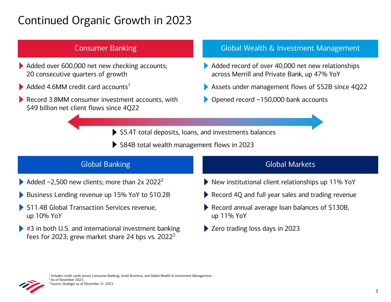 Added ~2,500 new clients; more than 2x 20222 Business Lending revenue up 15% YoY to $10.2B $11.4B Global Transaction Services revenue, up 10% YoY #3 in both U.S. and international investment banking fees for 2023; grew market share 24 bps vs. 20223 New institutional client relationships up 11% YoY Record 4Q and full year sales and trading revenue Record annual average loan balances of $130B, up 11% YoY Zero trading loss days in 2023 1 Includes credit cards across Consumer Banking, Small Business, and Global Wealth & Investment Management. 2 As of November 2023. 3 Source: Dealogic as of December 31, 2023. Added record of over 40,000 net new relationships across Merrill and Private Bank, up 47% YoY Assets under management flows of $52B since 4Q22 Opened record ~150,000 bank accounts Continued Organic Growth in 2023 3 Consumer Banking Global Wealth & Investment Management Global Banking Global Markets Added over 600,000 net new checking accounts; 20 consecutive quarters of growth Added 4.6MM credit card accounts1 Record 3.8MM consumer investment accounts, with $49 billion net client flows since 4Q22 $5.4T total deposits, loans, and investments balances $84B total wealth management flows in 2023
