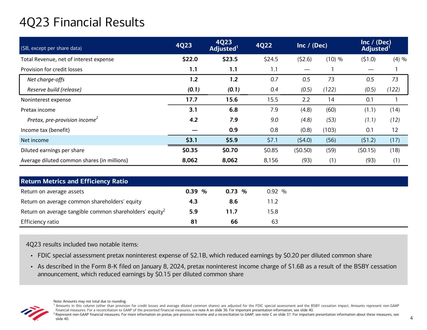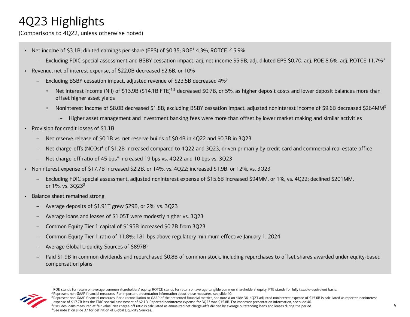 1 ROE stands for return on average common shareholders’ equity; ROTCE stands for return on average tangible common shareholders’ equity. FTE stands for fully taxable-equivalent basis. 2 Represent non-GAAP financial measures. For important presentation information about these measures, see slide 40. 3 Represent non-GAAP financial measures. For a reconciliation to GAAP of the presented financial metrics, see note A on slide 36. 4Q23 adjusted noninterest expense of $15.6B is calculated as reported noninterest expense of $17.7B less the FDIC special assessment of $2.1B. Reported noninterest expense for 3Q23 was $15.8B. For important presentation information, see slide 40. 4 Excludes loans measured at fair value. Net charge-off ratio is calculated as annualized net charge-offs divided by average outstanding loans and leases during the period. 5 See note D on slide 37 for definition of Global Liquidity Sources. 4Q23 Highlights (Comparisons to 4Q22, unless otherwise noted) • Net income of $3.1B; diluted earnings per share (EPS) of $0.35; ROE1 4.3%, ROTCE1,2 5.9% – Excluding FDIC special assessment and BSBY cessation impact, adj. net income $5.9B, adj. diluted EPS $0.70, adj. ROE 8.6%, adj. ROTCE 11.7%3 • Revenue, net of interest expense, of $22.0B decreased $2.6B, or 10% – Excluding BSBY cessation impact, adjusted revenue of $23.5B decreased 4%3 ◦ Net interest income (NII) of $13.9B ($14.1B FTE)1,2 decreased $0.7B, or 5%, as higher deposit costs and lower deposit balances more than offset higher asset yields ◦ Noninterest income of $8.0B decreased $1.8B; excluding BSBY cessation impact, adjusted noninterest income of $9.6B decreased $264MM3 – Higher asset management and investment banking fees were more than offset by lower market making and similar activities • Provision for credit losses of $1.1B – Net reserve release of $0.1B vs. net reserve builds of $0.4B in 4Q22 and $0.3B in 3Q23 – Net charge-offs (NCOs)4 of $1.2B increased compared to 4Q22 and 3Q23, driven primarily by credit card and commercial real estate office – Net charge-off ratio of 45 bps4 increased 19 bps vs. 4Q22 and 10 bps vs. 3Q23 • Noninterest expense of $17.7B increased $2.2B, or 14%, vs. 4Q22; increased $1.9B, or 12%, vs. 3Q23 – Excluding FDIC special assessment, adjusted noninterest expense of $15.6B increased $94MM, or 1%, vs. 4Q22; declined $201MM, or 1%, vs. 3Q233 • Balance sheet remained strong – Average deposits of $1.91T grew $29B, or 2%, vs. 3Q23 – Average loans and leases of $1.05T were modestly higher vs. 3Q23 – Common Equity Tier 1 capital of $195B increased $0.7B from 3Q23 – Common Equity Tier 1 ratio of 11.8%; 181 bps above regulatory minimum effective January 1, 2024 – Average Global Liquidity Sources of $897B5 – Paid $1.9B in common dividends and repurchased $0.8B of common stock, including repurchases to offset shares awarded under equity-based compensation plans 5