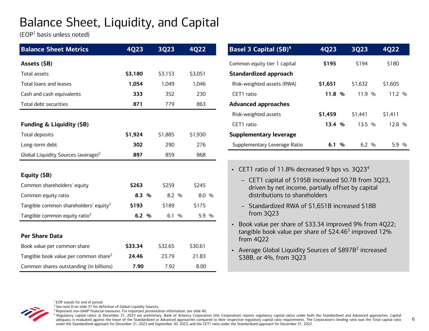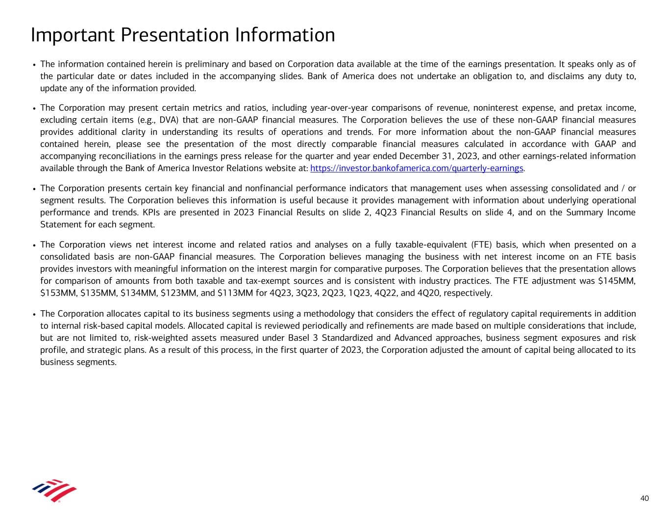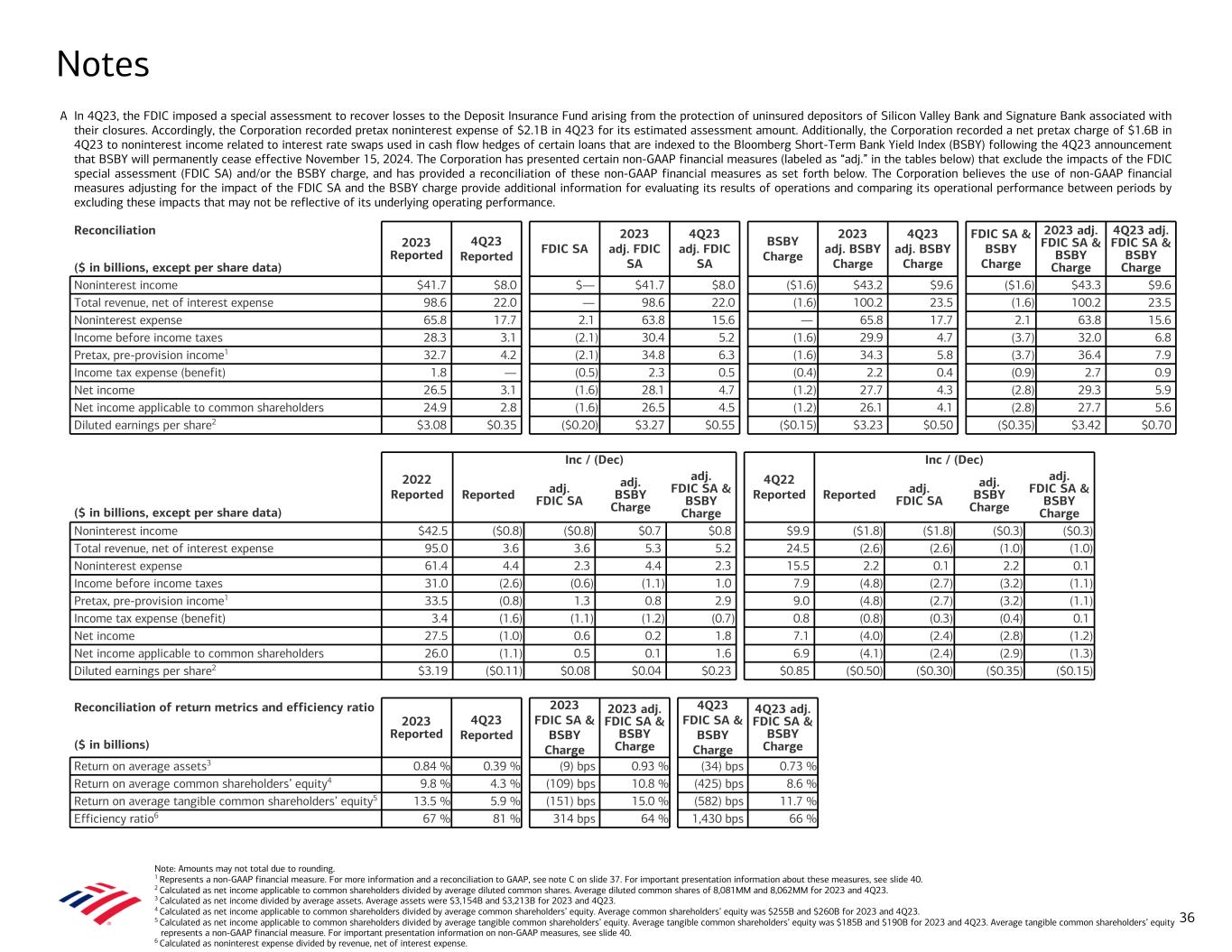 Note: Amounts may not total due to rounding. 1 Represents a non-GAAP financial measure. For more information and a reconciliation to GAAP, see note C on slide 37. For important presentation information about these measures, see slide 40. 2 Calculated as net income applicable to common shareholders divided by average diluted common shares. Average diluted common shares of 8,081MM and 8,062MM for 2023 and 4Q23. 3 Calculated as net income divided by average assets. Average assets were $3,154B and $3,213B for 2023 and 4Q23. 4 Calculated as net income applicable to common shareholders divided by average common shareholders’ equity. Average common shareholders’ equity was $255B and $260B for 2023 and 4Q23. 5 Calculated as net income applicable to common shareholders divided by average tangible common shareholders’ equity. Average tangible common shareholders’ equity was $185B and $190B for 2023 and 4Q23. Average tangible common shareholders’ equity represents a non-GAAP financial measure. For important presentation information on non-GAAP measures, see slide 40. 6 Calculated as noninterest expense divided by revenue, net of interest expense. A In 4Q23, the FDIC imposed a special assessment to recover losses to the Deposit Insurance Fund arising from the protection of uninsured depositors of Silicon Valley Bank and Signature Bank associated with their closures. Accordingly, the Corporation recorded pretax noninterest expense of $2.1B in 4Q23 for its estimated assessment amount. Additionally, the Corporation recorded a net pretax charge of $1.6B in 4Q23 to noninterest income related to interest rate swaps used in cash flow hedges of certain loans that are indexed to the Bloomberg Short-Term Bank Yield Index (BSBY) following the 4Q23 announcement that BSBY will permanently cease effective November 15, 2024. The Corporation has presented certain non-GAAP financial measures (labeled as “adj.” in the tables below) that exclude the impacts of the FDIC special assessment (FDIC SA) and/or the BSBY charge, and has provided a reconciliation of these non-GAAP financial measures as set forth below. The Corporation believes the use of non-GAAP financial measures adjusting for the impact of the FDIC SA and the BSBY charge provide additional information for evaluating its results of operations and comparing its operational performance between periods by excluding these impacts that may not be reflective of its underlying operating performance. Notes 36 Reconciliation of return metrics and efficiency ratio ($ in billions) 2023 Reported 4Q23 Reported 2023 FDIC SA & BSBY Charge 2023 adj. FDIC SA & BSBY Charge 4Q23 FDIC SA & BSBY Charge 4Q23 adj. FDIC SA & BSBY Charge Return on average assets3 0.84 % 0.39 % (9) bps 0.93 % (34) bps 0.73 % Return on average common shareholders’ equity4 9.8 % 4.3 % (109) bps 10.8 % (425) bps 8.6 % Return on average tangible common shareholders’ equity5 13.5 % 5.9 % (151) bps 15.0 % (582) bps 11.7 % Efficiency ratio6 67 % 81 % 314 bps 64 % 1,430 bps 66 % Reconciliation ($ in billions, except per share data) 2023 Reported 4Q23 Reported FDIC SA 2023 adj. FDIC SA 4Q23 adj. FDIC SA BSBY Charge 2023 adj. BSBY Charge 4Q23 adj. BSBY Charge FDIC SA & BSBY Charge 2023 adj. FDIC SA & BSBY Charge 4Q23 adj. FDIC SA & BSBY Charge Noninterest income $41.7 $8.0 $— $41.7 $8.0 ($1.6) $43.2 $9.6 ($1.6) $43.3 $9.6 Total revenue, net of interest expense 98.6 22.0 — 98.6 22.0 (1.6) 100.2 23.5 (1.6) 100.2 23.5 Noninterest expense 65.8 17.7 2.1 63.8 15.6 — 65.8 17.7 2.1 63.8 15.6 Income before income taxes 28.3 3.1 (2.1) 30.4 5.2 (1.6) 29.9 4.7 (3.7) 32.0 6.8 Pretax, pre-provision income1 32.7 4.2 (2.1) 34.8 6.3 (1.6) 34.3 5.8 (3.7) 36.4 7.9 Income tax expense (benefit) 1.8 — (0.5) 2.3 0.5 (0.4) 2.2 0.4 (0.9) 2.7 0.9 Net income 26.5 3.1 (1.6) 28.1 4.7 (1.2) 27.7 4.3 (2.8) 29.3 5.9 Net income applicable to common shareholders 24.9 2.8 (1.6) 26.5 4.5 (1.2) 26.1 4.1 (2.8) 27.7 5.6 Diluted earnings per share2 $3.08 $0.35 ($0.20) $3.27 $0.55 ($0.15) $3.23 $0.50 ($0.35) $3.42 $0.70 2022 Reported Inc / (Dec) 4Q22 Reported Inc / (Dec) ($ in billions, except per share data) Reported adj. FDIC SA adj. BSBY Charge adj. FDIC SA & BSBY Charge Reported adj. FDIC SA adj. BSBY Charge adj. FDIC SA & BSBY Charge Noninterest income $42.5 ($0.8) ($0.8) $0.7 $0.8 $9.9 ($1.8) ($1.8) ($0.3) ($0.3) Total revenue, net of interest expense 95.0 3.6 3.6 5.3 5.2 24.5 (2.6) (2.6) (1.0) (1.0) Noninterest expense 61.4 4.4 2.3 4.4 2.3 15.5 2.2 0.1 2.2 0.1 Income before income taxes 31.0 (2.6) (0.6) (1.1) 1.0 7.9 (4.8) (2.7) (3.2) (1.1) Pretax, pre-provision income1 33.5 (0.8) 1.3 0.8 2.9 9.0 (4.8) (2.7) (3.2) (1.1) Income tax expense (benefit) 3.4 (1.6) (1.1) (1.2) (0.7) 0.8 (0.8) (0.3) (0.4) 0.1 Net income 27.5 (1.0) 0.6 0.2 1.8 7.1 (4.0) (2.4) (2.8) (1.2) Net income applicable to common shareholders 26.0 (1.1) 0.5 0.1 1.6 6.9 (4.1) (2.4) (2.9) (1.3) Diluted earnings per share2 $3.19 ($0.11) $0.08 $0.04 $0.23 $0.85 ($0.50) ($0.30) ($0.35) ($0.15)