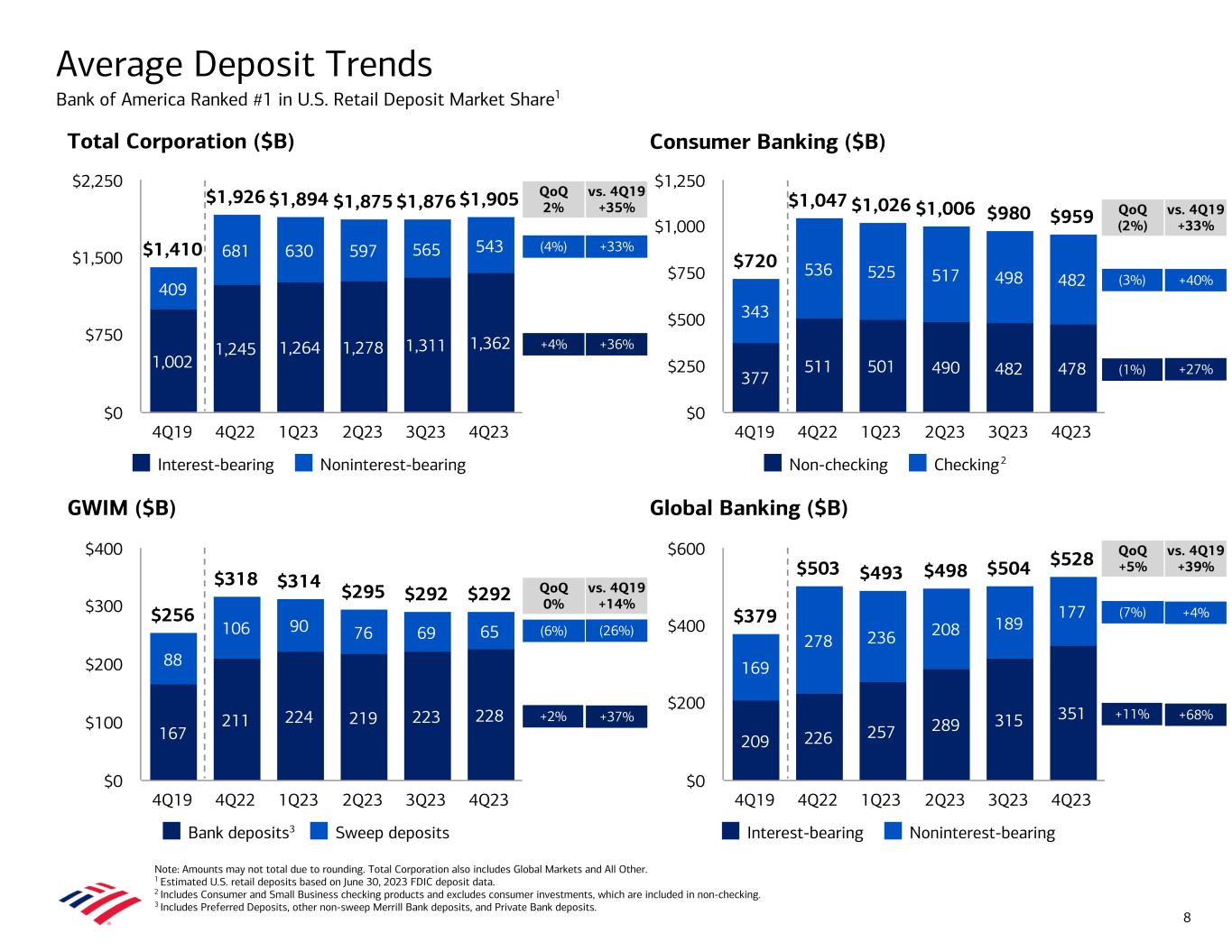 $1,029 $1,031 $1,037 $1,037 $1,041 300 304 307 311 313 225 221 219 219 219 380 381 383 376 375 123 125 129 131 134 Consumer Banking GWIM Global Banking Global Markets 4Q22 1Q23 2Q23 3Q23 4Q23 $0 $250 $500 $750 $1,000 $1,250 $1,039 $1,041 $1,047 $1,046 $1,051 4Q22 1Q23 2Q23 3Q23 4Q23 $800 $900 $1,000 $1,100 +4% (3%) (1%) +9% Average Loan and Lease Trends YoY +1% YoY +1% YoY (10%) Note: Amounts may not total due to rounding. Total Loans and Leases in All Other ($B) Loans and Leases in Business Segments ($B) Total Loans and Leases by Portfolio ($B)Total Loans and Leases ($B) $453 $453 $454 $457 $459 $587 $588 $593 $589 $592 Consumer Commercial 4Q22 1Q23 2Q23 3Q23 4Q23 $0 $250 $500 $750 7 8 8 8 8 8 2 2 2 2 2 $10 $10 $10 $9 $9 Residential mortgage Home equity 4Q22 1Q23 2Q23 3Q23 4Q23 $0 $5 $10 $15