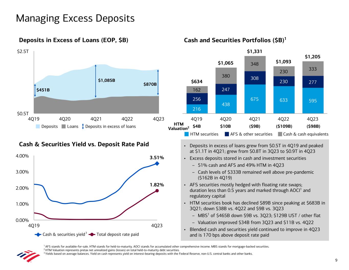 Consumer Banking ($B) GWIM ($B) Global Banking ($B) Total Corporation ($B) Average Deposit Trends Bank of America Ranked #1 in U.S. Retail Deposit Market Share1 Note: Amounts may not total due to rounding. Total Corporation also includes Global Markets and All Other. 1 Estimated U.S. retail deposits based on June 30, 2023 FDIC deposit data. 2 Includes Consumer and Small Business checking products and excludes consumer investments, which are included in non-checking. 3 Includes Preferred Deposits, other non-sweep Merrill Bank deposits, and Private Bank deposits. $256 $318 $314 $295 $292 $292 167 211 224 219 223 228 88 106 90 76 69 65 Bank deposits Sweep deposits 4Q19 4Q22 1Q23 2Q23 3Q23 4Q23 $0 $100 $200 $300 $400 $1,410 $1,926 $1,894 $1,875 $1,876 $1,905 1,002 1,245 1,264 1,278 1,311 1,362 409 681 630 597 565 543 Interest-bearing Noninterest-bearing 4Q19 4Q22 1Q23 2Q23 3Q23 4Q23 $0 $750 $1,500 $2,250 $379 $503 $493 $498 $504 $528 209 226 257 289 315 351 169 278 236 208 189 177 Interest-bearing Noninterest-bearing 4Q19 4Q22 1Q23 2Q23 3Q23 4Q23 $0 $200 $400 $600 +2% (6%) +4% (4%) QoQ 2% QoQ 0% QoQ (2%) +11% (7%) (1%) QoQ +5% 8 $720 $1,047 $1,026 $1,006 $980 $959 377 511 501 490 482 478 343 536 525 517 498 482 Non-checking Checking 4Q19 4Q22 1Q23 2Q23 3Q23 4Q23 $0 $250 $500 $750 $1,000 $1,250 (3%) 2 +36% +33% vs. 4Q19 +35% +37% (26%) vs. 4Q19 +14% +27% +40% vs. 4Q19 +33% +68% +4% vs. 4Q19 +39% 3