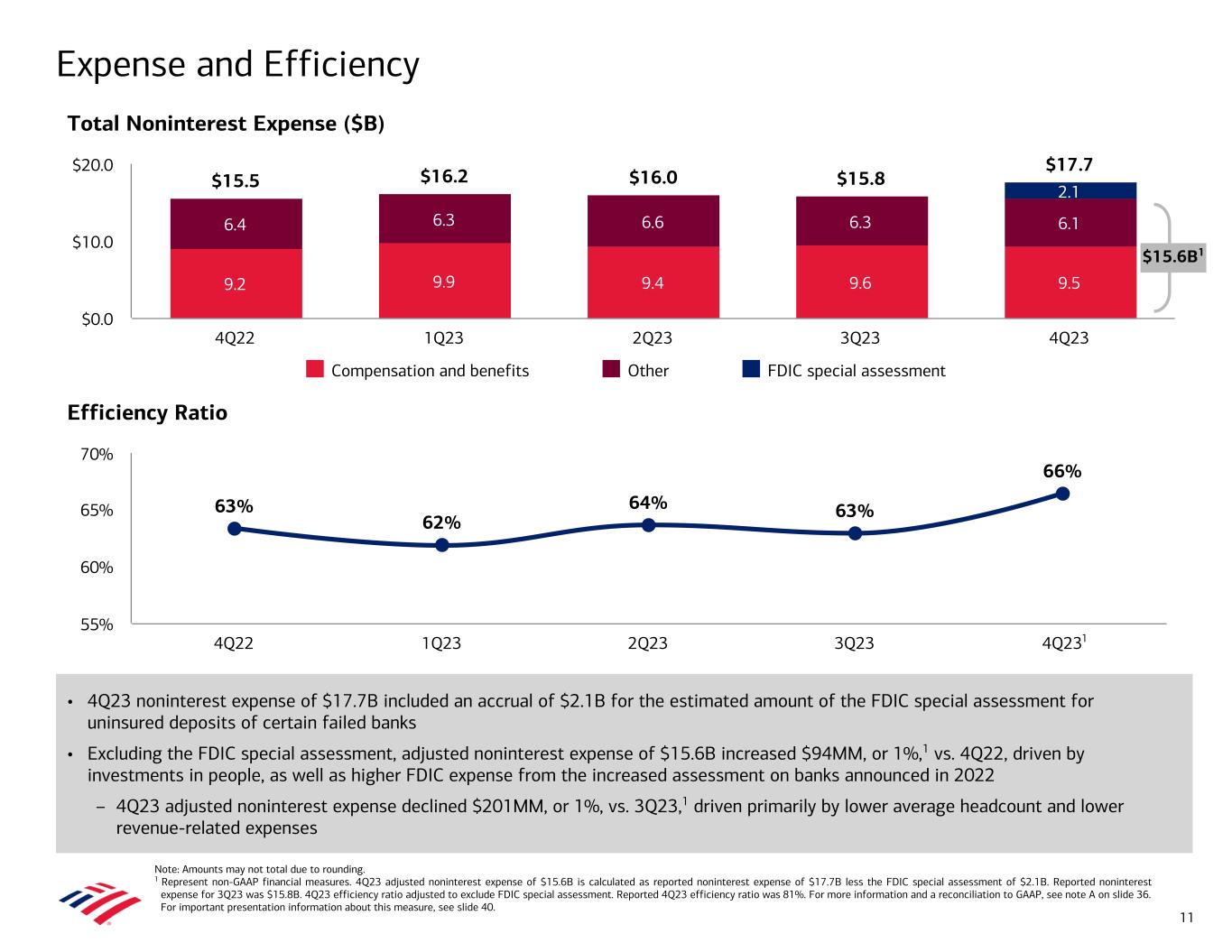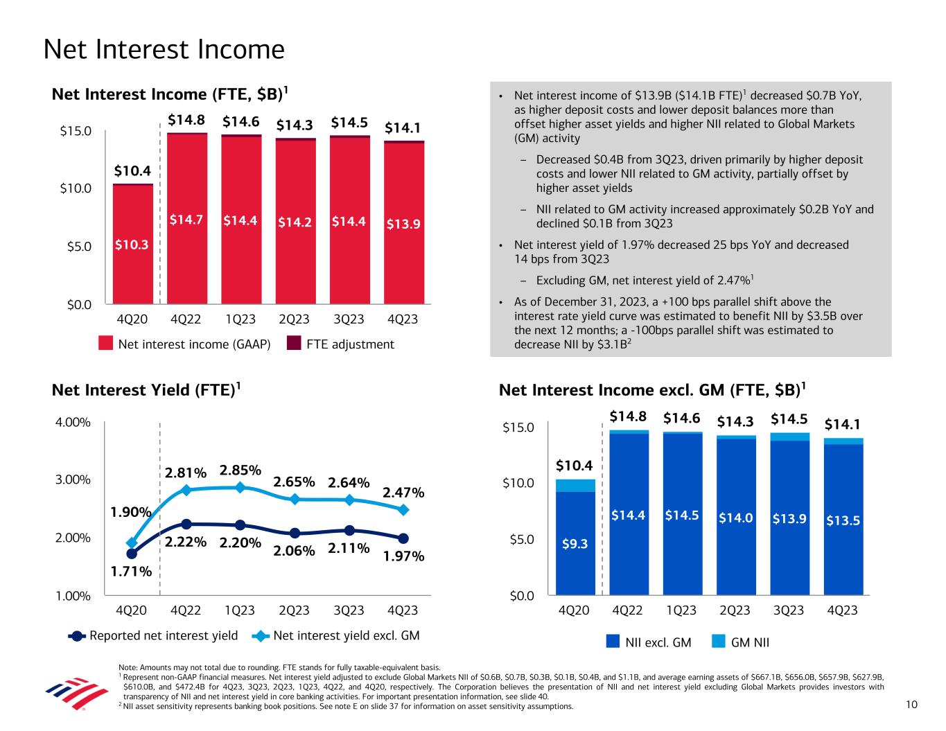 • Net interest income of $13.9B ($14.1B FTE)1 decreased $0.7B YoY, as higher deposit costs and lower deposit balances more than offset higher asset yields and higher NII related to Global Markets (GM) activity – Decreased $0.4B from 3Q23, driven primarily by higher deposit costs and lower NII related to GM activity, partially offset by higher asset yields – NII related to GM activity increased approximately $0.2B YoY and declined $0.1B from 3Q23 • Net interest yield of 1.97% decreased 25 bps YoY and decreased 14 bps from 3Q23 – Excluding GM, net interest yield of 2.47%1 • As of December 31, 2023, a +100 bps parallel shift above the interest rate yield curve was estimated to benefit NII by $3.5B over the next 12 months; a -100bps parallel shift was estimated to decrease NII by $3.1B2 Net Interest Income (FTE, $B)1 Net Interest Income Net Interest Yield (FTE)1 Note: Amounts may not total due to rounding. FTE stands for fully taxable-equivalent basis. 1 Represent non-GAAP financial measures. Net interest yield adjusted to exclude Global Markets NII of $0.6B, $0.7B, $0.3B, $0.1B, $0.4B, and $1.1B, and average earning assets of $667.1B, $656.0B, $657.9B, $627.9B, $610.0B, and $472.4B for 4Q23, 3Q23, 2Q23, 1Q23, 4Q22, and 4Q20, respectively. The Corporation believes the presentation of NII and net interest yield excluding Global Markets provides investors with transparency of NII and net interest yield in core banking activities. For important presentation information, see slide 40. 2 NII asset sensitivity represents banking book positions. See note E on slide 37 for information on asset sensitivity assumptions. 1.71% 2.22% 2.20% 2.06% 2.11% 1.97% 2.81% 2.85% 2.65% 2.64% 2.47% Reported net interest yield Net interest yield excl. GM 4Q20 4Q22 1Q23 2Q23 3Q23 4Q23 1.00% 2.00% 3.00% 4.00% $10.4 $14.8 $14.6 $14.3 $14.5 $14.1 $10.3 $14.7 $14.4 $14.2 $14.4 $13.9 Net interest income (GAAP) FTE adjustment 4Q20 4Q22 1Q23 2Q23 3Q23 4Q23 $0.0 $5.0 $10.0 $15.0 10 Net Interest Income excl. GM (FTE, $B)1 $10.4 $14.8 $14.6 $14.3 $14.5 $14.1 $9.3 $14.4 $14.5 $14.0 $13.9 $13.5 NII excl. GM GM NII 4Q20 4Q22 1Q23 2Q23 3Q23 4Q23 $0.0 $5.0 $10.0 $15.0 1.90%