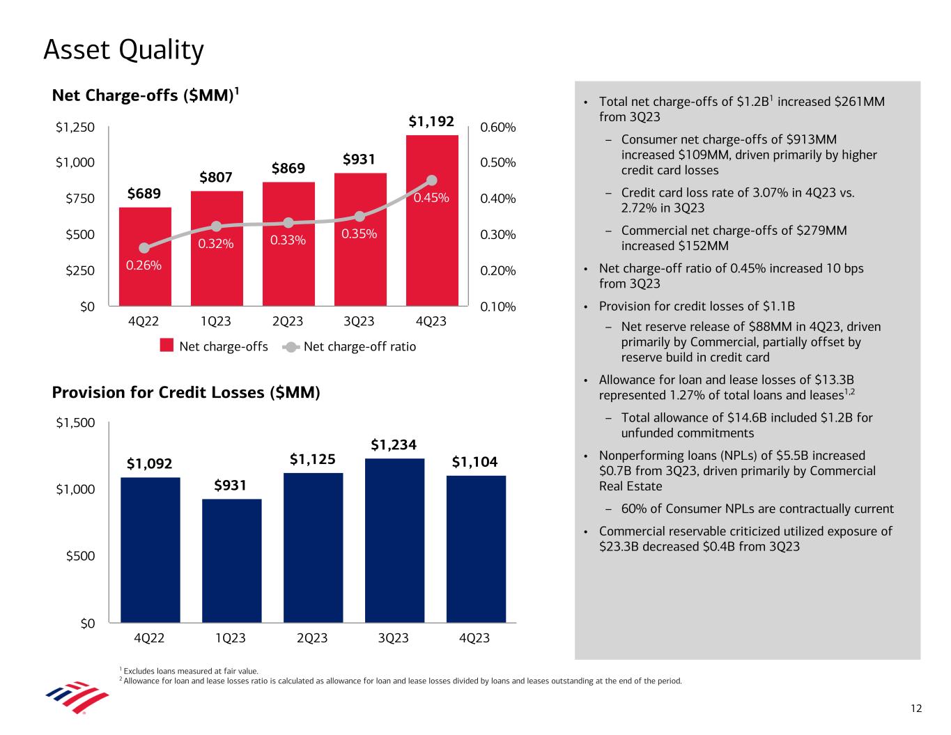 $15.5 $16.2 $16.0 $15.8 $17.7 9.2 9.9 9.4 9.6 9.5 6.4 6.3 6.6 6.3 6.1 2.1 Compensation and benefits Other FDIC special assessment 4Q22 1Q23 2Q23 3Q23 4Q23 $0.0 $10.0 $20.0 63% 62% 64% 63% 66% 4Q22 1Q23 2Q23 3Q23 4Q23 55% 60% 65% 70% Total Noninterest Expense ($B) Efficiency Ratio Expense and Efficiency 11 • 4Q23 noninterest expense of $17.7B included an accrual of $2.1B for the estimated amount of the FDIC special assessment for uninsured deposits of certain failed banks • Excluding the FDIC special assessment, adjusted noninterest expense of $15.6B increased $94MM, or 1%,1 vs. 4Q22, driven by investments in people, as well as higher FDIC expense from the increased assessment on banks announced in 2022 – 4Q23 adjusted noninterest expense declined $201MM, or 1%, vs. 3Q23,1 driven primarily by lower average headcount and lower revenue-related expenses 1 $15.6B1 Note: Amounts may not total due to rounding. 1 Represent non-GAAP financial measures. 4Q23 adjusted noninterest expense of $15.6B is calculated as reported noninterest expense of $17.7B less the FDIC special assessment of $2.1B. Reported noninterest expense for 3Q23 was $15.8B. 4Q23 efficiency ratio adjusted to exclude FDIC special assessment. Reported 4Q23 efficiency ratio was 81%. For more information and a reconciliation to GAAP, see note A on slide 36. For important presentation information about this measure, see slide 40.