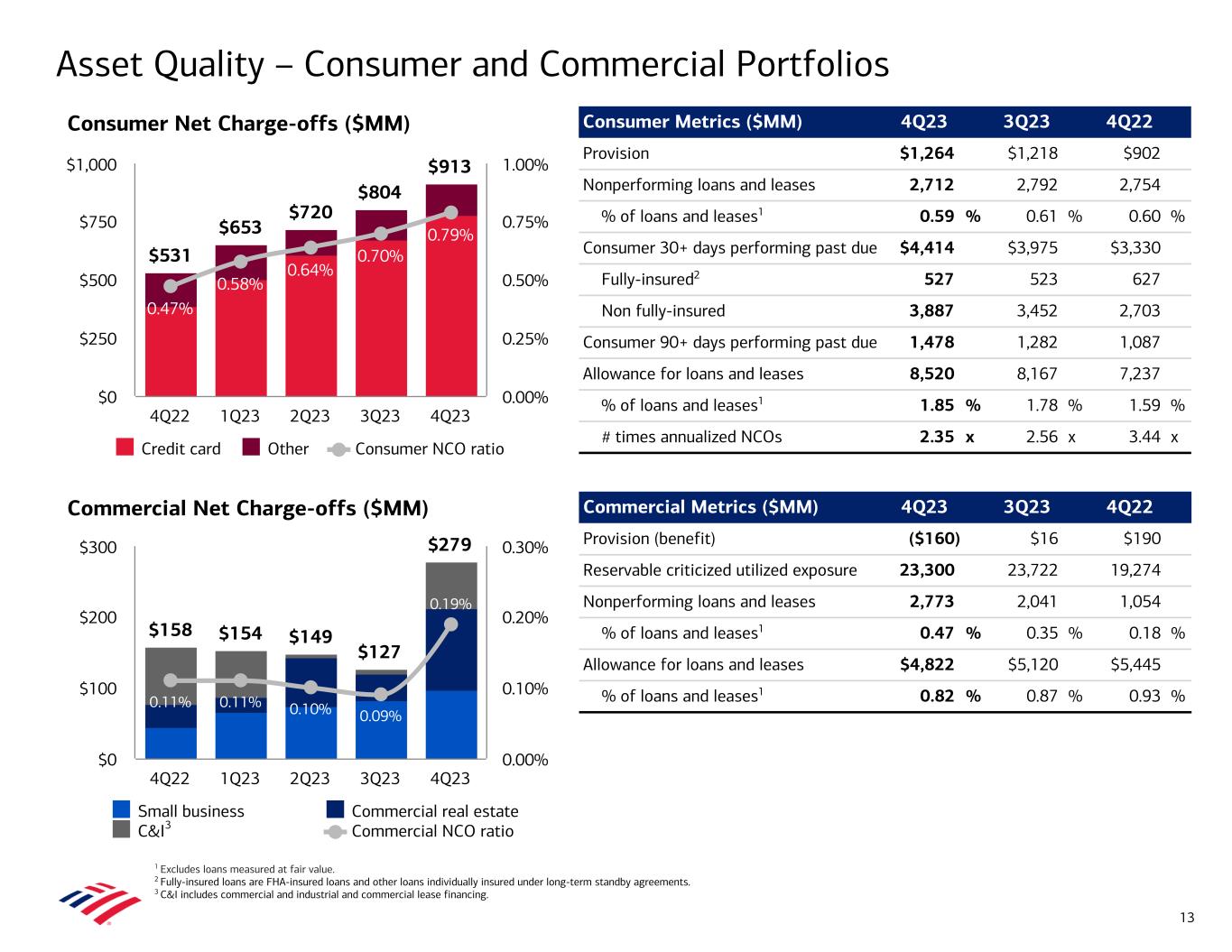 Asset Quality 1 Excludes loans measured at fair value. 2 Allowance for loan and lease losses ratio is calculated as allowance for loan and lease losses divided by loans and leases outstanding at the end of the period. Provision for Credit Losses ($MM) Net Charge-offs ($MM)1 $1,092 $931 $1,125 $1,234 $1,104 4Q22 1Q23 2Q23 3Q23 4Q23 $0 $500 $1,000 $1,500 $689 $807 $869 $931 $1,192 0.26% 0.32% 0.33% 0.35% 0.45% Net charge-offs Net charge-off ratio 4Q22 1Q23 2Q23 3Q23 4Q23 $0 $250 $500 $750 $1,000 $1,250 0.10% 0.20% 0.30% 0.40% 0.50% 0.60% 12 • Total net charge-offs of $1.2B1 increased $261MM from 3Q23 – Consumer net charge-offs of $913MM increased $109MM, driven primarily by higher credit card losses – Credit card loss rate of 3.07% in 4Q23 vs. 2.72% in 3Q23 – Commercial net charge-offs of $279MM increased $152MM • Net charge-off ratio of 0.45% increased 10 bps from 3Q23 • Provision for credit losses of $1.1B – Net reserve release of $88MM in 4Q23, driven primarily by Commercial, partially offset by reserve build in credit card • Allowance for loan and lease losses of $13.3B represented 1.27% of total loans and leases1,2 – Total allowance of $14.6B included $1.2B for unfunded commitments • Nonperforming loans (NPLs) of $5.5B increased $0.7B from 3Q23, driven primarily by Commercial Real Estate – 60% of Consumer NPLs are contractually current • Commercial reservable criticized utilized exposure of $23.3B decreased $0.4B from 3Q23