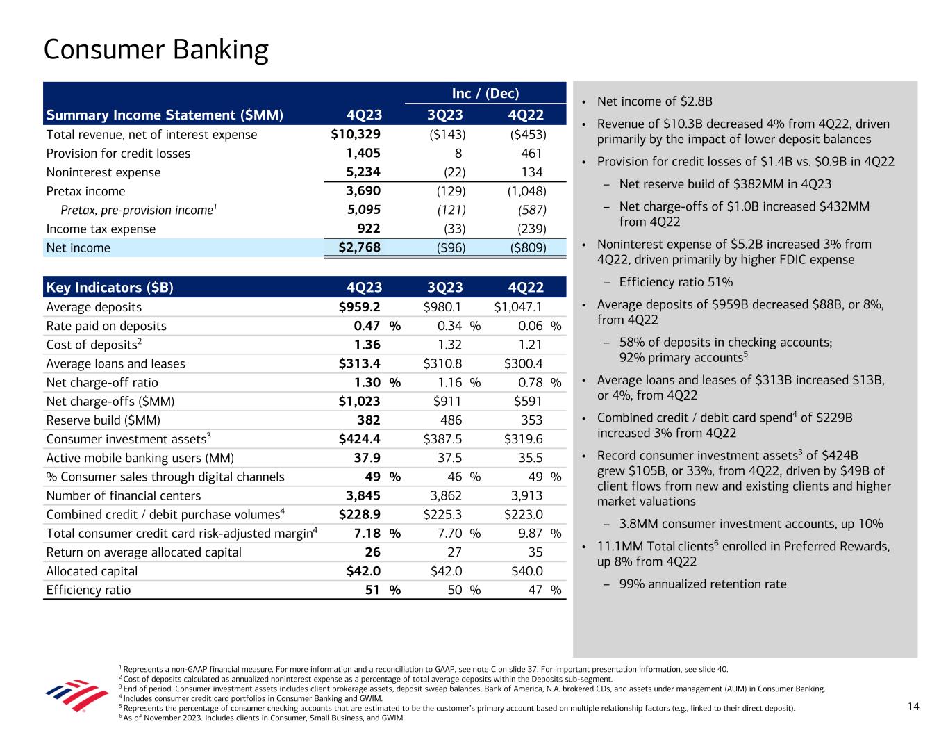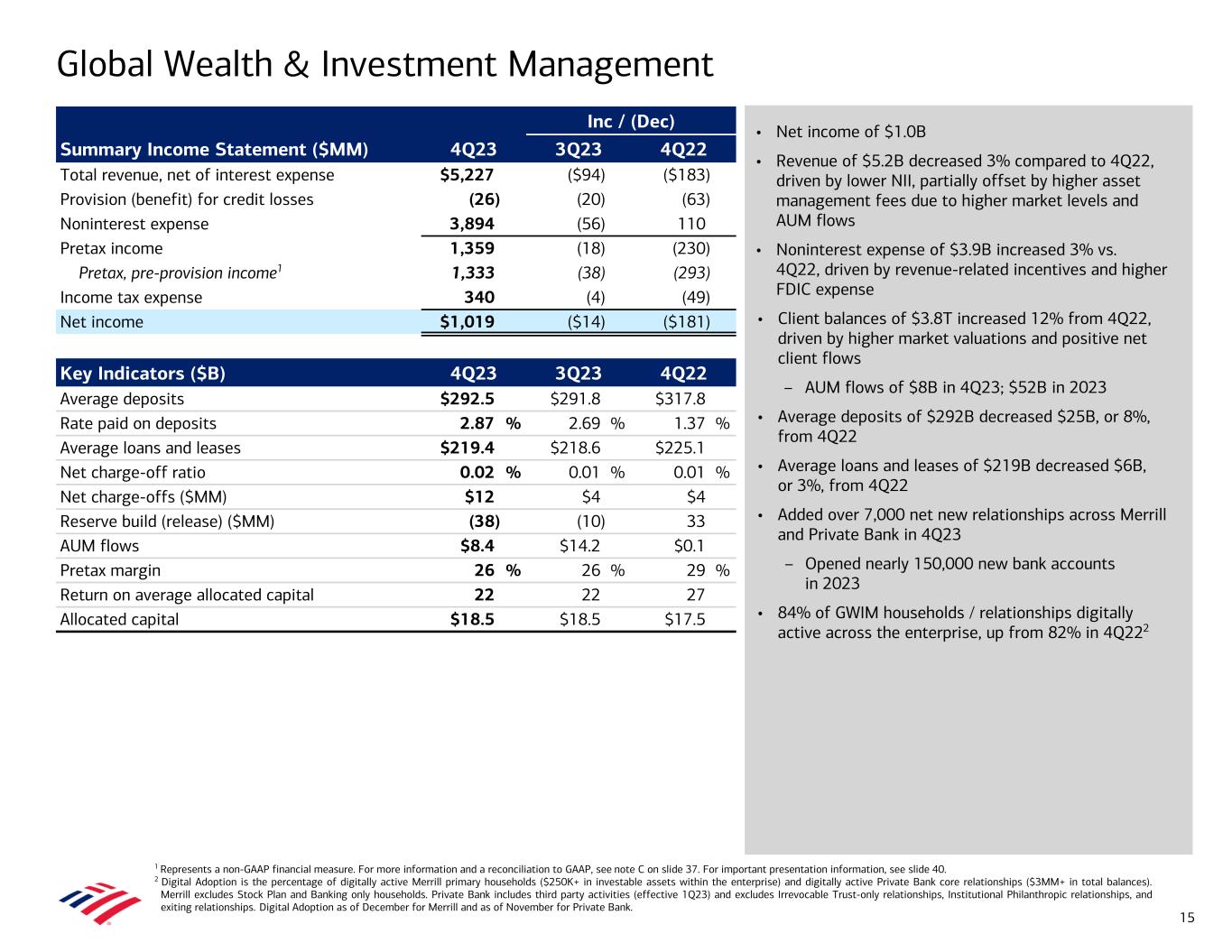 • Net income of $2.8B • Revenue of $10.3B decreased 4% from 4Q22, driven primarily by the impact of lower deposit balances • Provision for credit losses of $1.4B vs. $0.9B in 4Q22 – Net reserve build of $382MM in 4Q23 – Net charge-offs of $1.0B increased $432MM from 4Q22 • Noninterest expense of $5.2B increased 3% from 4Q22, driven primarily by higher FDIC expense – Efficiency ratio 51% • Average deposits of $959B decreased $88B, or 8%, from 4Q22 – 58% of deposits in checking accounts; 92% primary accounts5 • Average loans and leases of $313B increased $13B, or 4%, from 4Q22 • Combined credit / debit card spend4 of $229B increased 3% from 4Q22 • Record consumer investment assets3 of $424B grew $105B, or 33%, from 4Q22, driven by $49B of client flows from new and existing clients and higher market valuations – 3.8MM consumer investment accounts, up 10% • 11.1MM Total clients6 enrolled in Preferred Rewards, up 8% from 4Q22 – 99% annualized retention rate Consumer Banking 1 Represents a non-GAAP financial measure. For more information and a reconciliation to GAAP, see note C on slide 37. For important presentation information, see slide 40. 2 Cost of deposits calculated as annualized noninterest expense as a percentage of total average deposits within the Deposits sub-segment. 3 End of period. Consumer investment assets includes client brokerage assets, deposit sweep balances, Bank of America, N.A. brokered CDs, and assets under management (AUM) in Consumer Banking. 4 Includes consumer credit card portfolios in Consumer Banking and GWIM. 5 Represents the percentage of consumer checking accounts that are estimated to be the customer’s primary account based on multiple relationship factors (e.g., linked to their direct deposit). 6 As of November 2023. Includes clients in Consumer, Small Business, and GWIM. Inc / (Dec) Summary Income Statement ($MM) 4Q23 3Q23 4Q22 Total revenue, net of interest expense $10,329 ($143) ($453) Provision for credit losses 1,405 8 461 Noninterest expense 5,234 (22) 134 Pretax income 3,690 (129) (1,048) Pretax, pre-provision income1 5,095 (121) (587) Income tax expense 922 (33) (239) Net income $2,768 ($96) ($809) Key Indicators ($B) 4Q23 3Q23 4Q22 Average deposits $959.2 $980.1 $1,047.1 Rate paid on deposits 0.47 % 0.34 % 0.06 % Cost of deposits2 1.36 1.32 1.21 Average loans and leases $313.4 $310.8 $300.4 Net charge-off ratio 1.30 % 1.16 % 0.78 % Net charge-offs ($MM) $1,023 $911 $591 Reserve build ($MM) 382 486 353 Consumer investment assets3 $424.4 $387.5 $319.6 Active mobile banking users (MM) 37.9 37.5 35.5 % Consumer sales through digital channels 49 % 46 % 49 % Number of financial centers 3,845 3,862 3,913 Combined credit / debit purchase volumes4 $228.9 $225.3 $223.0 Total consumer credit card risk-adjusted margin4 7.18 % 7.70 % 9.87 % Return on average allocated capital 26 27 35 Allocated capital $42.0 $42.0 $40.0 Efficiency ratio 51 % 50 % 47 % 14