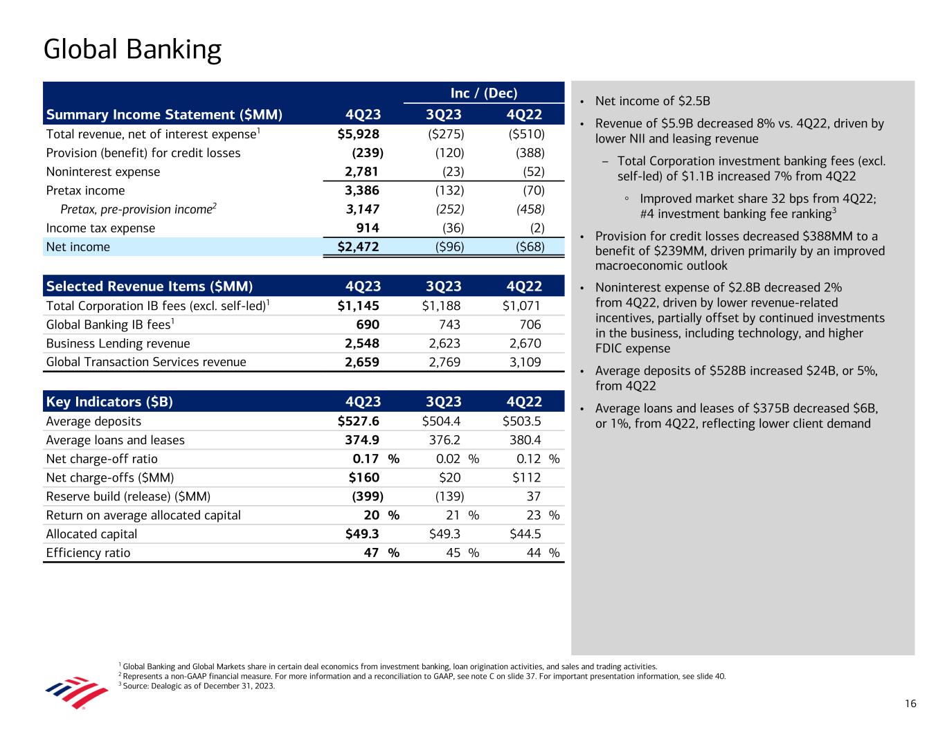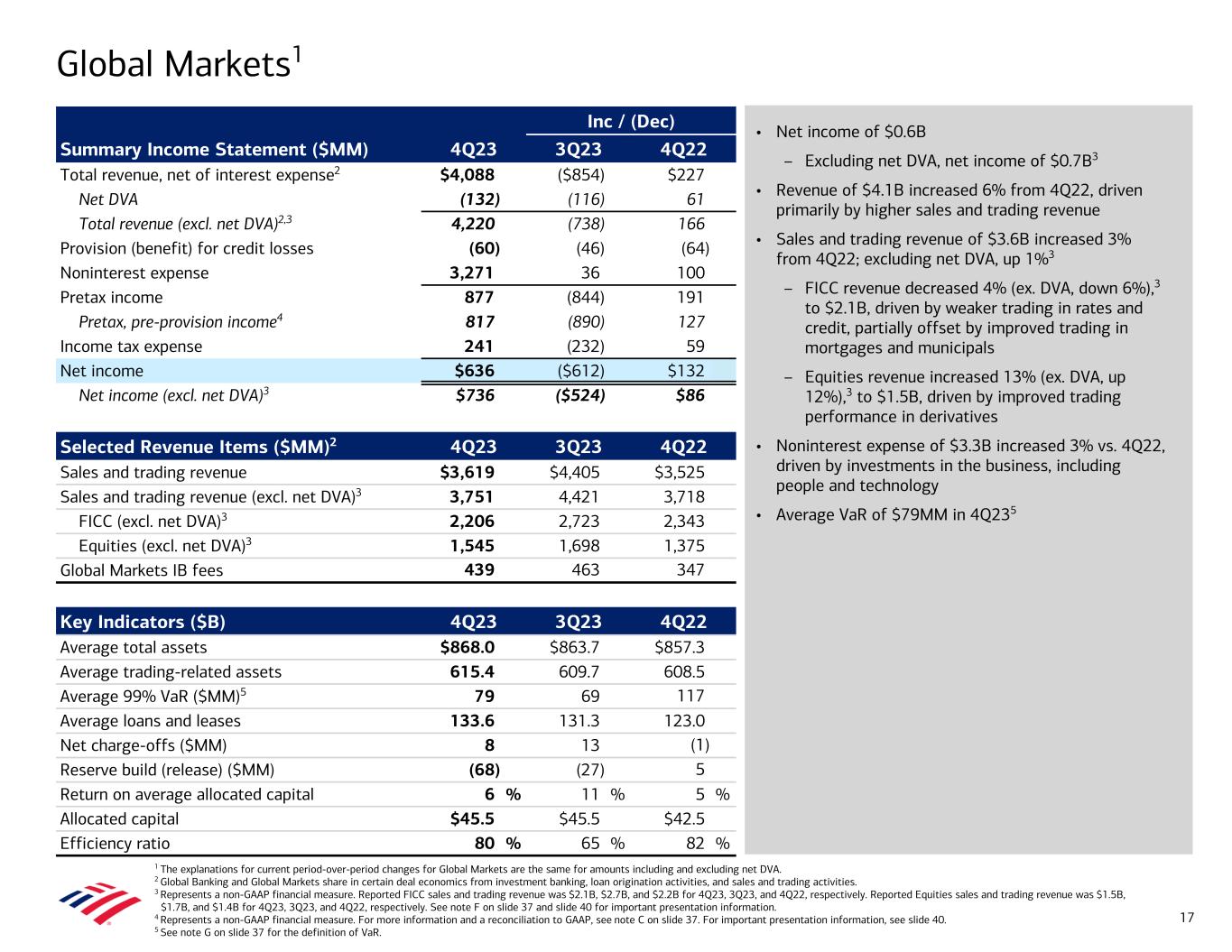 • Net income of $2.5B • Revenue of $5.9B decreased 8% vs. 4Q22, driven by lower NII and leasing revenue – Total Corporation investment banking fees (excl. self-led) of $1.1B increased 7% from 4Q22 ◦ Improved market share 32 bps from 4Q22; #4 investment banking fee ranking3 • Provision for credit losses decreased $388MM to a benefit of $239MM, driven primarily by an improved macroeconomic outlook • Noninterest expense of $2.8B decreased 2% from 4Q22, driven by lower revenue-related incentives, partially offset by continued investments in the business, including technology, and higher FDIC expense • Average deposits of $528B increased $24B, or 5%, from 4Q22 • Average loans and leases of $375B decreased $6B, or 1%, from 4Q22, reflecting lower client demand Global Banking 1 Global Banking and Global Markets share in certain deal economics from investment banking, loan origination activities, and sales and trading activities. 2 Represents a non-GAAP financial measure. For more information and a reconciliation to GAAP, see note C on slide 37. For important presentation information, see slide 40. 3 Source: Dealogic as of December 31, 2023. Inc / (Dec) Summary Income Statement ($MM) 4Q23 3Q23 4Q22 Total revenue, net of interest expense1 $5,928 ($275) ($510) Provision (benefit) for credit losses (239) (120) (388) Noninterest expense 2,781 (23) (52) Pretax income 3,386 (132) (70) Pretax, pre-provision income2 3,147 (252) (458) Income tax expense 914 (36) (2) Net income $2,472 ($96) ($68) Selected Revenue Items ($MM) 4Q23 3Q23 4Q22 Total Corporation IB fees (excl. self-led)1 $1,145 $1,188 $1,071 Global Banking IB fees1 690 743 706 Business Lending revenue 2,548 2,623 2,670 Global Transaction Services revenue 2,659 2,769 3,109 Key Indicators ($B) 4Q23 3Q23 4Q22 Average deposits $527.6 $504.4 $503.5 Average loans and leases 374.9 376.2 380.4 Net charge-off ratio 0.17 % 0.02 % 0.12 % Net charge-offs ($MM) $160 $20 $112 Reserve build (release) ($MM) (399) (139) 37 Return on average allocated capital 20 % 21 % 23 % Allocated capital $49.3 $49.3 $44.5 Efficiency ratio 47 % 45 % 44 % 16