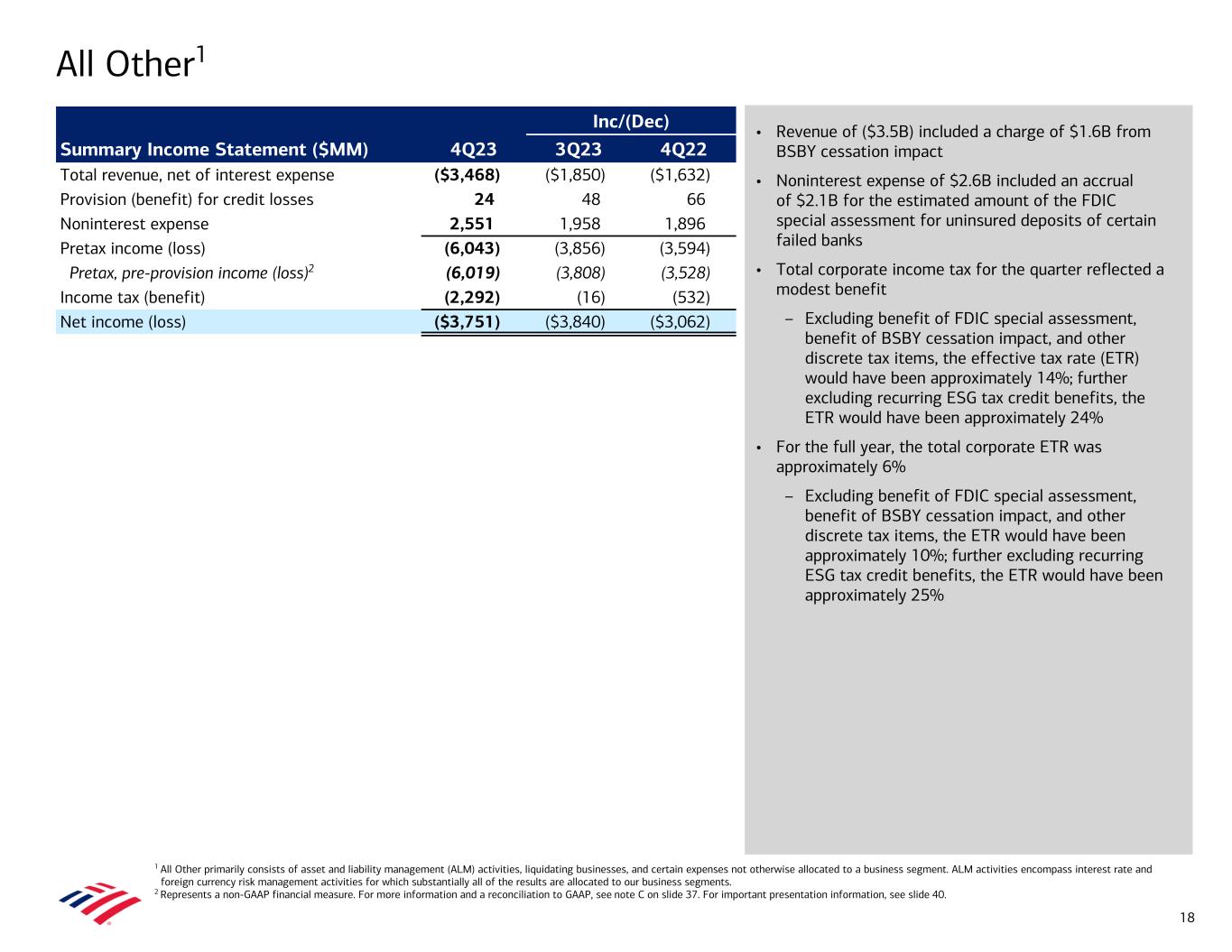 Global Markets1 • Net income of $0.6B – Excluding net DVA, net income of $0.7B3 • Revenue of $4.1B increased 6% from 4Q22, driven primarily by higher sales and trading revenue • Sales and trading revenue of $3.6B increased 3% from 4Q22; excluding net DVA, up 1%3 – FICC revenue decreased 4% (ex. DVA, down 6%),3 to $2.1B, driven by weaker trading in rates and credit, partially offset by improved trading in mortgages and municipals – Equities revenue increased 13% (ex. DVA, up 12%),3 to $1.5B, driven by improved trading performance in derivatives • Noninterest expense of $3.3B increased 3% vs. 4Q22, driven by investments in the business, including people and technology • Average VaR of $79MM in 4Q235 1 The explanations for current period-over-period changes for Global Markets are the same for amounts including and excluding net DVA. 2 Global Banking and Global Markets share in certain deal economics from investment banking, loan origination activities, and sales and trading activities. 3 Represents a non-GAAP financial measure. Reported FICC sales and trading revenue was $2.1B, $2.7B, and $2.2B for 4Q23, 3Q23, and 4Q22, respectively. Reported Equities sales and trading revenue was $1.5B, $1.7B, and $1.4B for 4Q23, 3Q23, and 4Q22, respectively. See note F on slide 37 and slide 40 for important presentation information. 4 Represents a non-GAAP financial measure. For more information and a reconciliation to GAAP, see note C on slide 37. For important presentation information, see slide 40. 5 See note G on slide 37 for the definition of VaR. Inc / (Dec) Summary Income Statement ($MM) 4Q23 3Q23 4Q22 Total revenue, net of interest expense2 $4,088 ($854) $227 Net DVA (132) (116) 61 Total revenue (excl. net DVA)2,3 4,220 (738) 166 Provision (benefit) for credit losses (60) (46) (64) Noninterest expense 3,271 36 100 Pretax income 877 (844) 191 Pretax, pre-provision income4 817 (890) 127 Income tax expense 241 (232) 59 Net income $636 ($612) $132 Net income (excl. net DVA)3 $736 ($524) $86 Selected Revenue Items ($MM)2 4Q23 3Q23 4Q22 Sales and trading revenue $3,619 $4,405 $3,525 Sales and trading revenue (excl. net DVA)3 3,751 4,421 3,718 FICC (excl. net DVA)3 2,206 2,723 2,343 Equities (excl. net DVA)3 1,545 1,698 1,375 Global Markets IB fees 439 463 347 Key Indicators ($B) 4Q23 3Q23 4Q22 Average total assets $868.0 $863.7 $857.3 Average trading-related assets 615.4 609.7 608.5 Average 99% VaR ($MM)5 79 69 117 Average loans and leases 133.6 131.3 123.0 Net charge-offs ($MM) 8 13 (1) Reserve build (release) ($MM) (68) (27) 5 Return on average allocated capital 6 % 11 % 5 % Allocated capital $45.5 $45.5 $42.5 Efficiency ratio 80 % 65 % 82 % 17