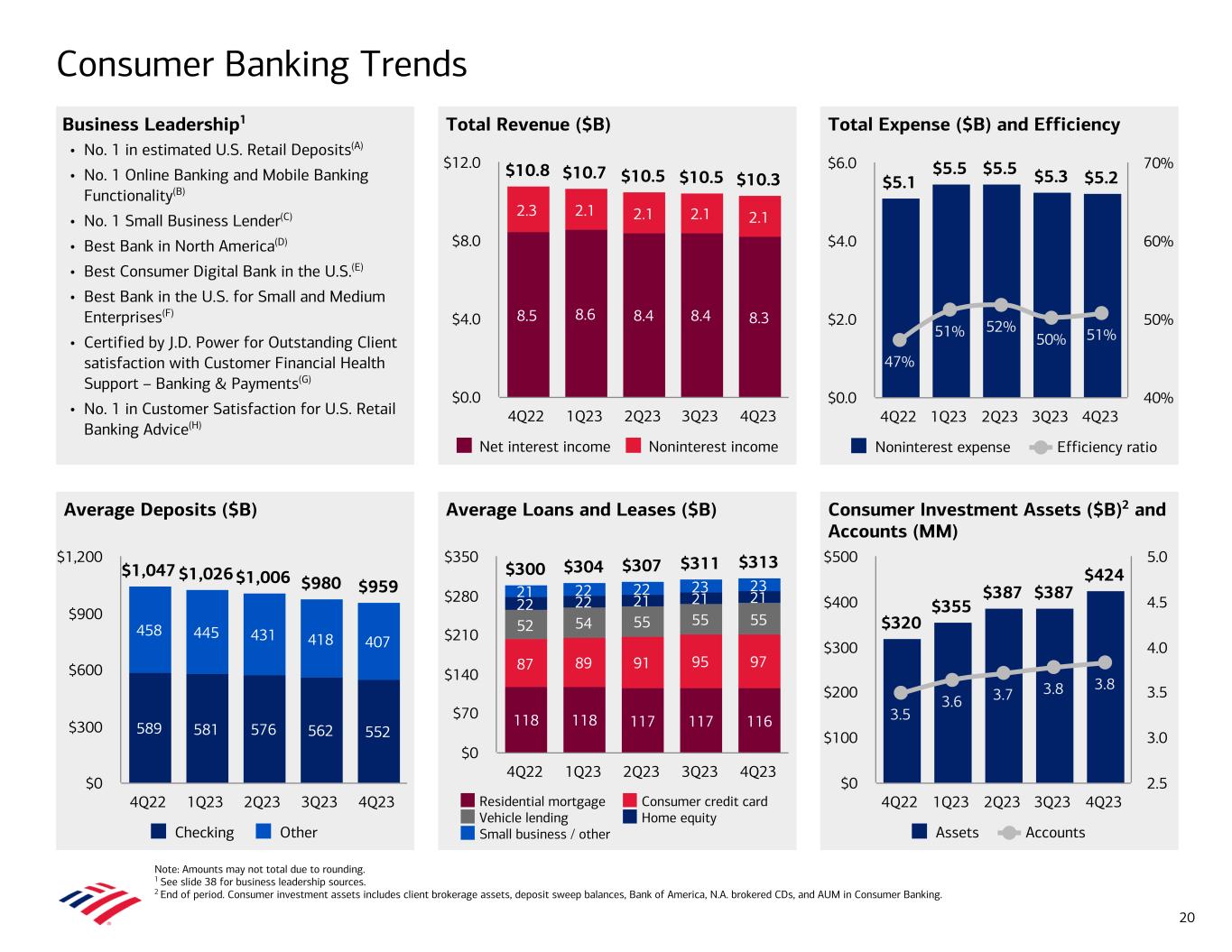 Total Expense ($B) and Efficiency Total Revenue ($B) Average Deposits ($B) Consumer Investment Assets ($B)2 and Accounts (MM) Average Loans and Leases ($B) Consumer Banking Trends Note: Amounts may not total due to rounding. 1 See slide 38 for business leadership sources. 2 End of period. Consumer investment assets includes client brokerage assets, deposit sweep balances, Bank of America, N.A. brokered CDs, and AUM in Consumer Banking. $10.8 $10.7 $10.5 $10.5 $10.3 8.5 8.6 8.4 8.4 8.3 2.3 2.1 2.1 2.1 2.1 Net interest income Noninterest income 4Q22 1Q23 2Q23 3Q23 4Q23 $0.0 $4.0 $8.0 $12.0 $5.1 $5.5 $5.5 $5.3 $5.2 47% 51% 52% 50% 51% Noninterest expense Efficiency ratio 4Q22 1Q23 2Q23 3Q23 4Q23 $0.0 $2.0 $4.0 $6.0 40% 50% 60% 70% $1,047$1,026$1,006 $980 $959 589 581 576 562 552 458 445 431 418 407 Checking Other 4Q22 1Q23 2Q23 3Q23 4Q23 $0 $300 $600 $900 $1,200 $300 $304 $307 $311 $313 118 118 117 117 116 87 89 91 95 97 52 54 55 55 55 22 22 21 21 2121 22 22 23 23 Residential mortgage Consumer credit card Vehicle lending Home equity Small business / other 4Q22 1Q23 2Q23 3Q23 4Q23 $0 $70 $140 $210 $280 $350 20 $320 $355 $387 $387 $424 3.5 3.6 3.7 3.8 3.8 Assets Accounts 4Q22 1Q23 2Q23 3Q23 4Q23 $0 $100 $200 $300 $400 $500 2.5 3.0 3.5 4.0 4.5 5.0 Business Leadership1 • No. 1 in estimated U.S. Retail Deposits(A) • No. 1 Online Banking and Mobile Banking Functionality(B) • No. 1 Small Business Lender(C) • Best Bank in North America(D) • Best Consumer Digital Bank in the U.S.(E) • Best Bank in the U.S. for Small and Medium Enterprises(F) • Certified by J.D. Power for Outstanding Client satisfaction with Customer Financial Health Support – Banking & Payments(G) • No. 1 in Customer Satisfaction for U.S. Retail Banking Advice(H)