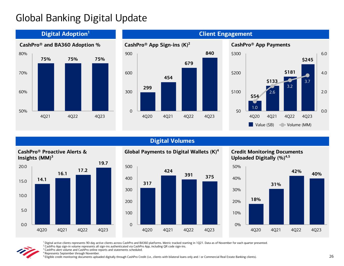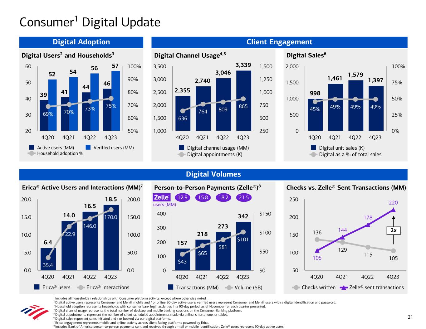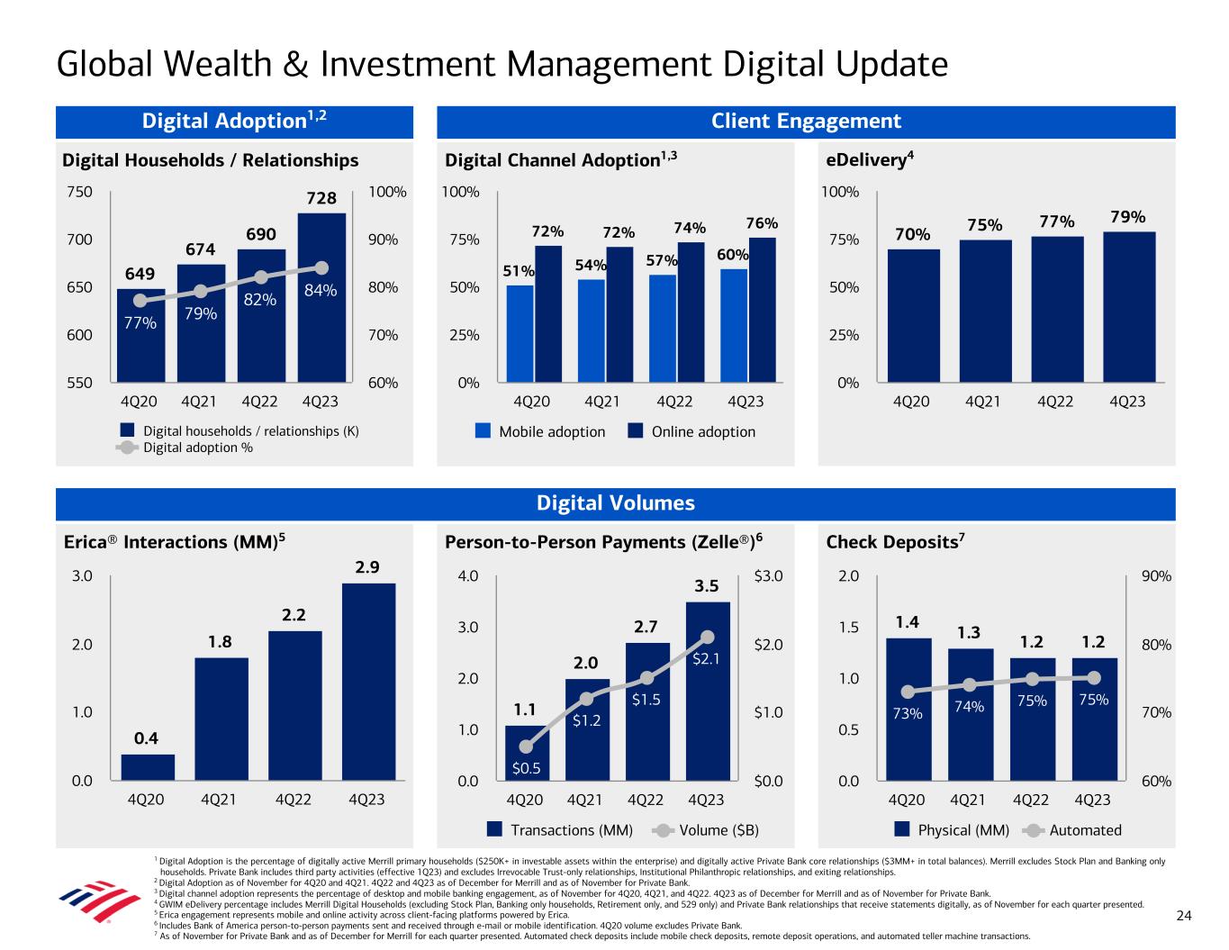 Erica® Interactions (MM)5 0.4 1.8 2.2 2.9 4Q20 4Q21 4Q22 4Q23 0.0 1.0 2.0 3.0 Person-to-Person Payments (Zelle®)6 Check Deposits7 eDelivery4Digital Households / Relationships Digital Channel Adoption1,3 70% 75% 77% 79% 4Q20 4Q21 4Q22 4Q23 0% 25% 50% 75% 100% 51% 54% 57% 60% 72% 72% 74% 76% Mobile adoption Online adoption 4Q20 4Q21 4Q22 4Q23 0% 25% 50% 75% 100% 649 674 690 728 77% 79% 82% 84% Digital households / relationships (K) Digital adoption % 4Q20 4Q21 4Q22 4Q23 550 600 650 700 750 60% 70% 80% 90% 100% Client Engagement Digital Volumes Global Wealth & Investment Management Digital Update 1 Digital Adoption is the percentage of digitally active Merrill primary households ($250K+ in investable assets within the enterprise) and digitally active Private Bank core relationships ($3MM+ in total balances). Merrill excludes Stock Plan and Banking only households. Private Bank includes third party activities (effective 1Q23) and excludes Irrevocable Trust-only relationships, Institutional Philanthropic relationships, and exiting relationships. 2 Digital Adoption as of November for 4Q20 and 4Q21. 4Q22 and 4Q23 as of December for Merrill and as of November for Private Bank. 3 Digital channel adoption represents the percentage of desktop and mobile banking engagement, as of November for 4Q20, 4Q21, and 4Q22. 4Q23 as of December for Merrill and as of November for Private Bank. 4 GWIM eDelivery percentage includes Merrill Digital Households (excluding Stock Plan, Banking only households, Retirement only, and 529 only) and Private Bank relationships that receive statements digitally, as of November for each quarter presented. 5 Erica engagement represents mobile and online activity across client-facing platforms powered by Erica. 6 Includes Bank of America person-to-person payments sent and received through e-mail or mobile identification. 4Q20 volume excludes Private Bank. 7 As of November for Private Bank and as of December for Merrill for each quarter presented. Automated check deposits include mobile check deposits, remote deposit operations, and automated teller machine transactions. 24 Digital Adoption1,2 1.4 1.3 1.2 1.2 73% 74% 75% 75% Physical (MM) Automated 4Q20 4Q21 4Q22 4Q23 0.0 0.5 1.0 1.5 2.0 60% 70% 80% 90% 1.1 2.0 2.7 3.5 $0.5 $1.2 $1.5 $2.1 Transactions (MM) Volume ($B) 4Q20 4Q21 4Q22 4Q23 0.0 1.0 2.0 3.0 4.0 $0.0 $1.0 $2.0 $3.0