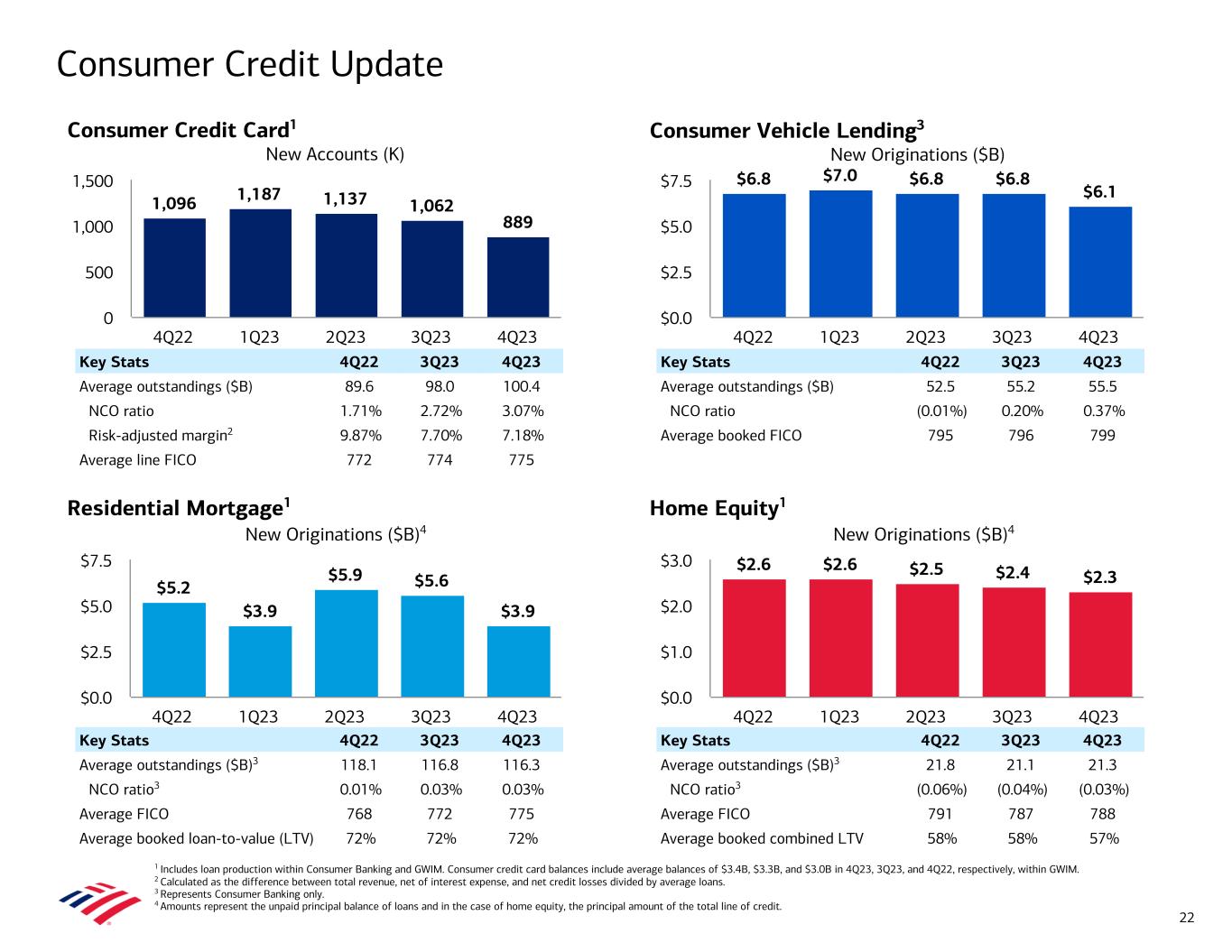 1,096 1,187 1,137 1,062 889 4Q22 1Q23 2Q23 3Q23 4Q23 0 500 1,000 1,500 Home Equity1 New Originations ($B)4 Consumer Credit Update 1 Includes loan production within Consumer Banking and GWIM. Consumer credit card balances include average balances of $3.4B, $3.3B, and $3.0B in 4Q23, 3Q23, and 4Q22, respectively, within GWIM. 2 Calculated as the difference between total revenue, net of interest expense, and net credit losses divided by average loans. 3 Represents Consumer Banking only. 4 Amounts represent the unpaid principal balance of loans and in the case of home equity, the principal amount of the total line of credit. Consumer Vehicle Lending3 New Originations ($B) Consumer Credit Card1 New Accounts (K) 22 Residential Mortgage1 New Originations ($B)4 Key Stats 4Q22 3Q23 4Q23 Average outstandings ($B) 89.6 98.0 100.4 NCO ratio 1.71% 2.72% 3.07% Risk-adjusted margin2 9.87% 7.70% 7.18% Average line FICO 772 774 775 $6.8 $7.0 $6.8 $6.8 $6.1 4Q22 1Q23 2Q23 3Q23 4Q23 $0.0 $2.5 $5.0 $7.5 Key Stats 4Q22 3Q23 4Q23 Average outstandings ($B) 52.5 55.2 55.5 NCO ratio (0.01%) 0.20% 0.37% Average booked FICO 795 796 799 $5.2 $3.9 $5.9 $5.6 $3.9 4Q22 1Q23 2Q23 3Q23 4Q23 $0.0 $2.5 $5.0 $7.5 Key Stats 4Q22 3Q23 4Q23 Average outstandings ($B)3 118.1 116.8 116.3 NCO ratio3 0.01% 0.03% 0.03% Average FICO 768 772 775 Average booked loan-to-value (LTV) 72% 72% 72% $2.6 $2.6 $2.5 $2.4 $2.3 4Q22 1Q23 2Q23 3Q23 4Q23 $0.0 $1.0 $2.0 $3.0 Key Stats 4Q22 3Q23 4Q23 Average outstandings ($B)3 21.8 21.1 21.3 NCO ratio3 (0.06%) (0.04%) (0.03%) Average FICO 791 787 788 Average booked combined LTV 58% 58% 57%