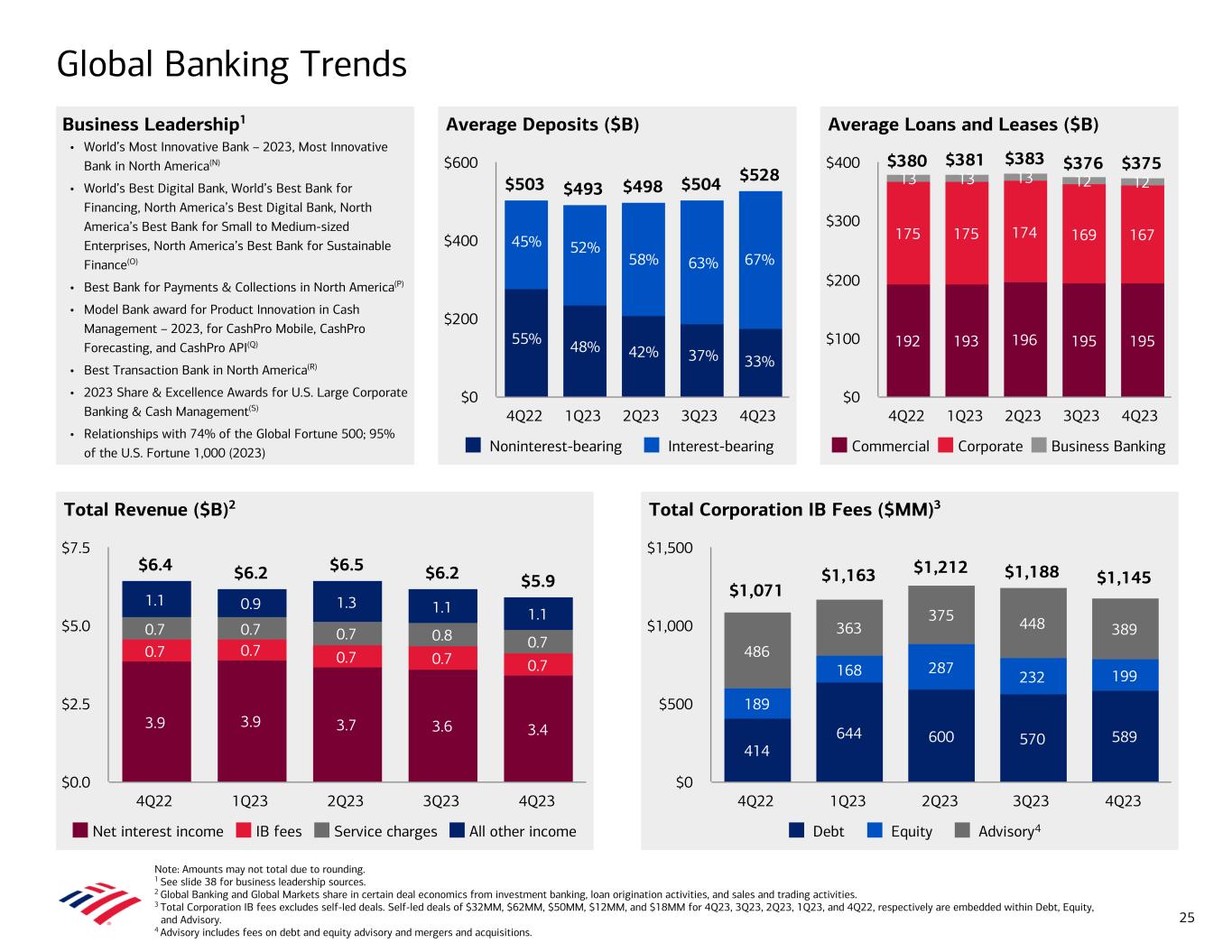 Global Banking Trends Note: Amounts may not total due to rounding. 1 See slide 38 for business leadership sources. 2 Global Banking and Global Markets share in certain deal economics from investment banking, loan origination activities, and sales and trading activities. 3 Total Corporation IB fees excludes self-led deals. Self-led deals of $32MM, $62MM, $50MM, $12MM, and $18MM for 4Q23, 3Q23, 2Q23, 1Q23, and 4Q22, respectively are embedded within Debt, Equity, and Advisory. 4 Advisory includes fees on debt and equity advisory and mergers and acquisitions. Average Deposits ($B)Business Leadership1 • World’s Most Innovative Bank – 2023, Most Innovative Bank in North America(N) • World’s Best Digital Bank, World’s Best Bank for Financing, North America’s Best Digital Bank, North America’s Best Bank for Small to Medium-sized Enterprises, North America’s Best Bank for Sustainable Finance(O) • Best Bank for Payments & Collections in North America(P) • Model Bank award for Product Innovation in Cash Management – 2023, for CashPro Mobile, CashPro Forecasting, and CashPro API(Q) • Best Transaction Bank in North America(R) • 2023 Share & Excellence Awards for U.S. Large Corporate Banking & Cash Management(S) • Relationships with 74% of the Global Fortune 500; 95% of the U.S. Fortune 1,000 (2023) Average Loans and Leases ($B) Total Revenue ($B)2 Total Corporation IB Fees ($MM)3 $6.4 $6.2 $6.5 $6.2 $5.9 3.9 3.9 3.7 3.6 3.4 0.7 0.7 0.7 0.7 0.7 0.7 0.7 0.7 0.8 0.7 1.1 0.9 1.3 1.1 1.1 Net interest income IB fees Service charges All other income 4Q22 1Q23 2Q23 3Q23 4Q23 $0.0 $2.5 $5.0 $7.5 414 644 600 570 589 189 168 287 232 199 486 363 375 448 389 $1,071 $1,163 $1,212 $1,188 $1,145 Debt Equity Advisory 4Q22 1Q23 2Q23 3Q23 4Q23 $0 $500 $1,000 $1,500 192 193 196 195 195 175 175 174 169 167 13 13 13 12 12 $380 $381 $383 $376 $375 Commercial Corporate Business Banking 4Q22 1Q23 2Q23 3Q23 4Q23 $0 $100 $200 $300 $400 4 $503 $493 $498 $504 $528 Noninterest-bearing Interest-bearing 4Q22 1Q23 2Q23 3Q23 4Q23 $0 $200 $400 $600 25 55% 48% 42% 37% 33% 45% 52% 58% 63% 67%