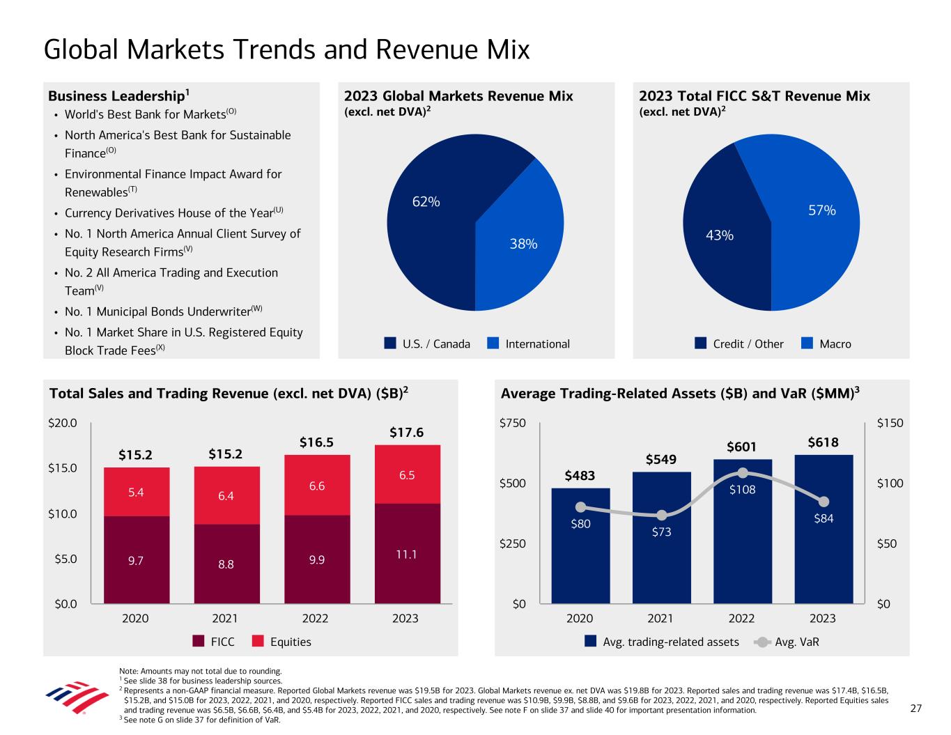 Global Markets Trends and Revenue Mix Note: Amounts may not total due to rounding. 1 See slide 38 for business leadership sources. 2 Represents a non-GAAP financial measure. Reported Global Markets revenue was $19.5B for 2023. Global Markets revenue ex. net DVA was $19.8B for 2023. Reported sales and trading revenue was $17.4B, $16.5B, $15.2B, and $15.0B for 2023, 2022, 2021, and 2020, respectively. Reported FICC sales and trading revenue was $10.9B, $9.9B, $8.8B, and $9.6B for 2023, 2022, 2021, and 2020, respectively. Reported Equities sales and trading revenue was $6.5B, $6.6B, $6.4B, and $5.4B for 2023, 2022, 2021, and 2020, respectively. See note F on slide 37 and slide 40 for important presentation information. 3 See note G on slide 37 for definition of VaR. 2023 Global Markets Revenue Mix (excl. net DVA)2 Business Leadership1 • World's Best Bank for Markets(O) • North America's Best Bank for Sustainable Finance(O) • Environmental Finance Impact Award for Renewables(T) • Currency Derivatives House of the Year(U) • No. 1 North America Annual Client Survey of Equity Research Firms(V) • No. 2 All America Trading and Execution Team(V) • No. 1 Municipal Bonds Underwriter(W) • No. 1 Market Share in U.S. Registered Equity Block Trade Fees(X) 2023 Total FICC S&T Revenue Mix (excl. net DVA)2 Total Sales and Trading Revenue (excl. net DVA) ($B)2 Average Trading-Related Assets ($B) and VaR ($MM)3 $15.2 $15.2 $16.5 $17.6 9.7 8.8 9.9 11.1 5.4 6.4 6.6 6.5 FICC Equities 2020 2021 2022 2023 $0.0 $5.0 $10.0 $15.0 $20.0 $483 $549 $601 $618 $80 $73 $108 $84 Avg. trading-related assets Avg. VaR 2020 2021 2022 2023 $0 $250 $500 $750 $0 $50 $100 $150 62% 38% U.S. / Canada International 43% 57% Credit / Other Macro 27