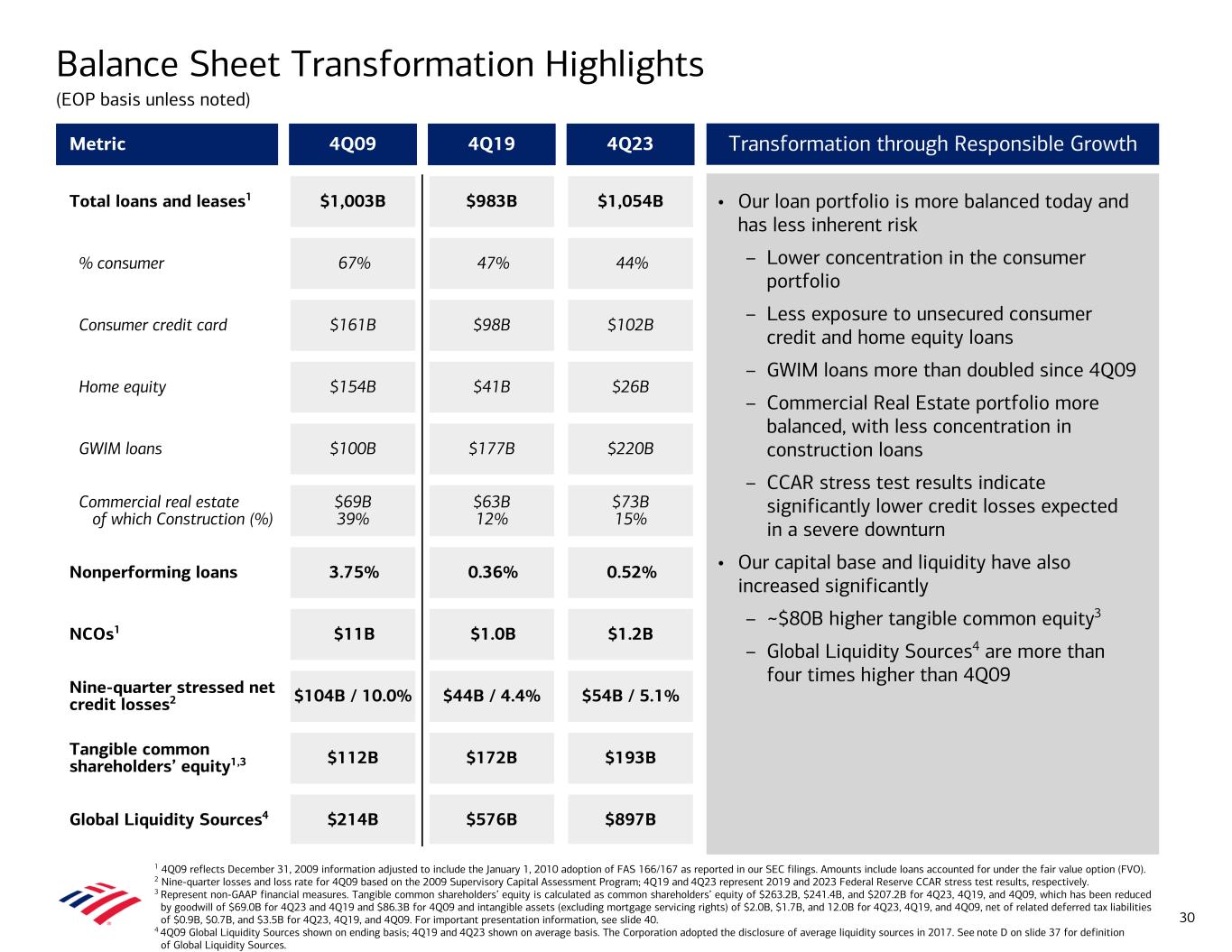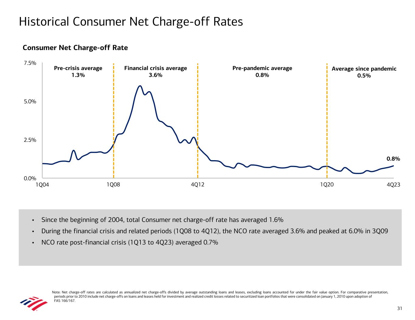 Metric 4Q09 4Q19 4Q23 Total loans and leases1 $1,003B $983B $1,054B % consumer 67% 47% 44% Consumer credit card $161B $98B $102B Home equity $154B $41B $26B GWIM loans $100B $177B $220B Commercial real estate of which Construction (%) $69B 39% $63B 12% $73B 15% Nonperforming loans 3.75% 0.36% 0.52% NCOs1 $11B $1.0B $1.2B Nine-quarter stressed net credit losses2 $104B / 10.0% $44B / 4.4% $54B / 5.1% Tangible common shareholders’ equity1,3 $112B $172B $193B Global Liquidity Sources4 $214B $576B $897B Balance Sheet Transformation Highlights (EOP basis unless noted) 30 Transformation through Responsible Growth • Our loan portfolio is more balanced today and has less inherent risk – Lower concentration in the consumer portfolio – Less exposure to unsecured consumer credit and home equity loans – GWIM loans more than doubled since 4Q09 – Commercial Real Estate portfolio more balanced, with less concentration in construction loans – CCAR stress test results indicate significantly lower credit losses expected in a severe downturn • Our capital base and liquidity have also increased significantly – ~$80B higher tangible common equity3 – Global Liquidity Sources4 are more than four times higher than 4Q09 1 4Q09 reflects December 31, 2009 information adjusted to include the January 1, 2010 adoption of FAS 166/167 as reported in our SEC filings. Amounts include loans accounted for under the fair value option (FVO). 2 Nine-quarter losses and loss rate for 4Q09 based on the 2009 Supervisory Capital Assessment Program; 4Q19 and 4Q23 represent 2019 and 2023 Federal Reserve CCAR stress test results, respectively. 3 Represent non-GAAP financial measures. Tangible common shareholders’ equity is calculated as common shareholders’ equity of $263.2B, $241.4B, and $207.2B for 4Q23, 4Q19, and 4Q09, which has been reduced by goodwill of $69.0B for 4Q23 and 4Q19 and $86.3B for 4Q09 and intangible assets (excluding mortgage servicing rights) of $2.0B, $1.7B, and 12.0B for 4Q23, 4Q19, and 4Q09, net of related deferred tax liabilities of $0.9B, $0.7B, and $3.5B for 4Q23, 4Q19, and 4Q09. For important presentation information, see slide 40. 4 4Q09 Global Liquidity Sources shown on ending basis; 4Q19 and 4Q23 shown on average basis. The Corporation adopted the disclosure of average liquidity sources in 2017. See note D on slide 37 for definition of Global Liquidity Sources.