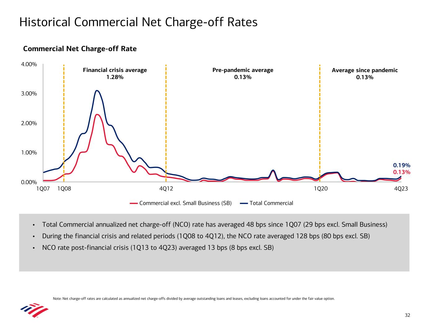 Historical Consumer Net Charge-off Rates 31 • Since the beginning of 2004, total Consumer net charge-off rate has averaged 1.6% • During the financial crisis and related periods (1Q08 to 4Q12), the NCO rate averaged 3.6% and peaked at 6.0% in 3Q09 • NCO rate post-financial crisis (1Q13 to 4Q23) averaged 0.7% Consumer Net Charge-off Rate 0.8% 1Q04 4Q23 0.0% 2.5% 5.0% 7.5% Pre-crisis average 1.3% Financial crisis average 3.6% Pre-pandemic average 0.8% 1Q08 4Q12 1Q20 Average since pandemic 0.5% Note: Net charge-off rates are calculated as annualized net charge-offs divided by average outstanding loans and leases, excluding loans accounted for under the fair value option. For comparative presentation, periods prior to 2010 include net charge-offs on loans and leases held for investment and realized credit losses related to securitized loan portfolios that were consolidated on January 1, 2010 upon adoption of FAS 166/167.