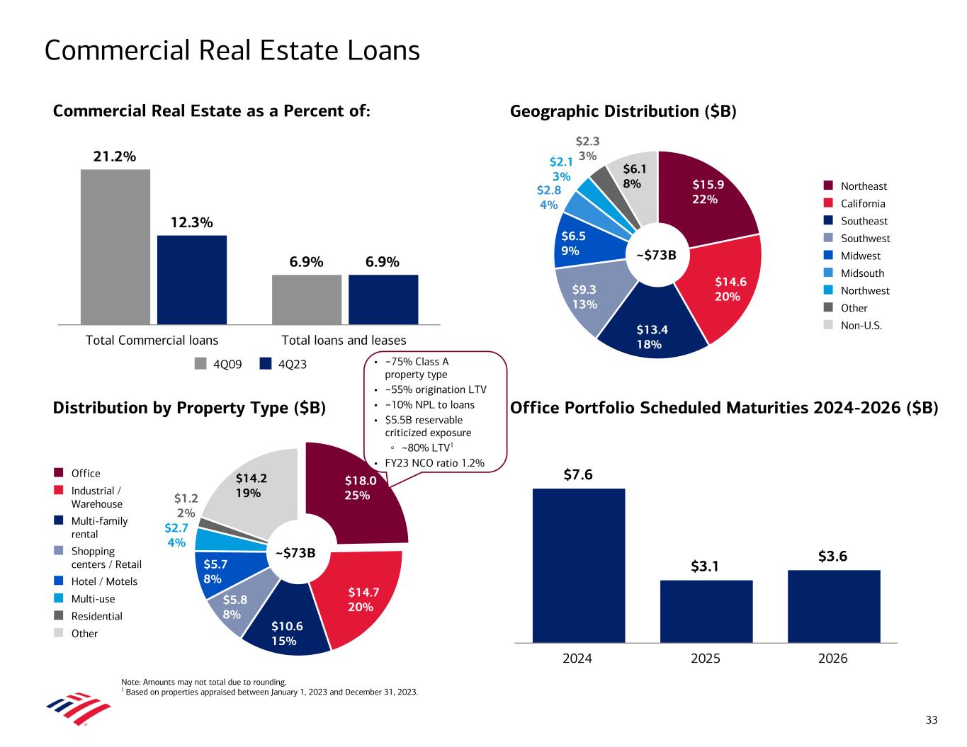 Historical Commercial Net Charge-off Rates 32 Commercial excl. Small Business (SB) Total Commercial 1Q07 4Q23 0.00% 1.00% 2.00% 3.00% 4.00% • Total Commercial annualized net charge-off (NCO) rate has averaged 48 bps since 1Q07 (29 bps excl. Small Business) • During the financial crisis and related periods (1Q08 to 4Q12), the NCO rate averaged 128 bps (80 bps excl. SB) • NCO rate post-financial crisis (1Q13 to 4Q23) averaged 13 bps (8 bps excl. SB) Commercial Net Charge-off Rate Financial crisis average 1.28% Pre-pandemic average 0.13% 0.19% 0.13% 1Q08 4Q12 1Q20 Note: Net charge-off rates are calculated as annualized net charge-offs divided by average outstanding loans and leases, excluding loans accounted for under the fair value option. Average since pandemic 0.13%